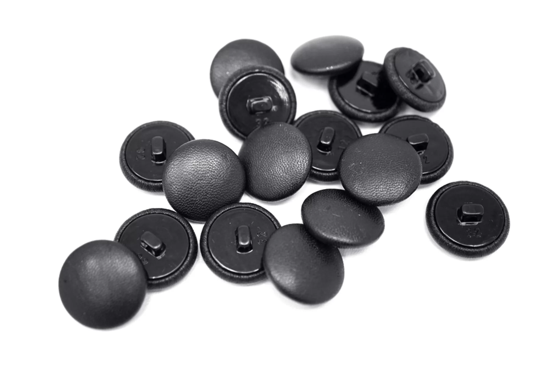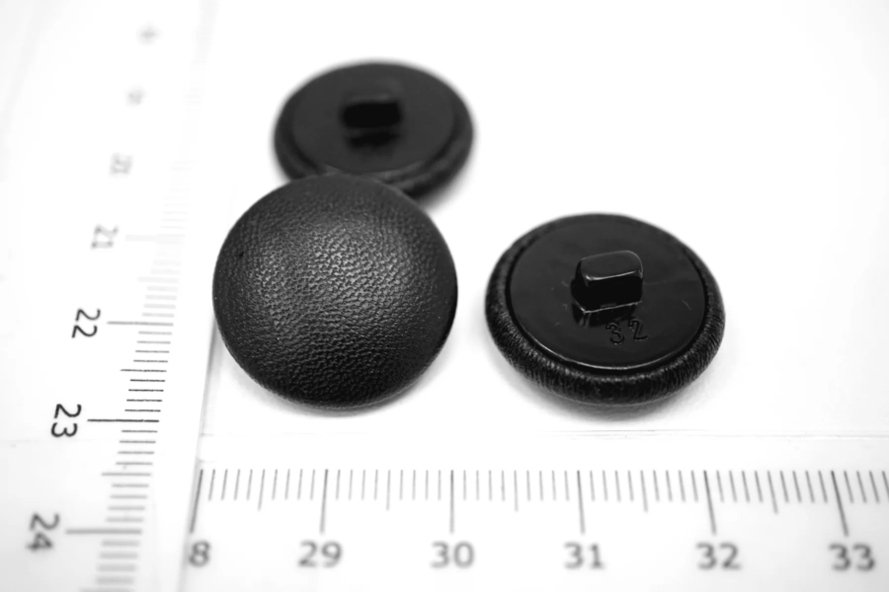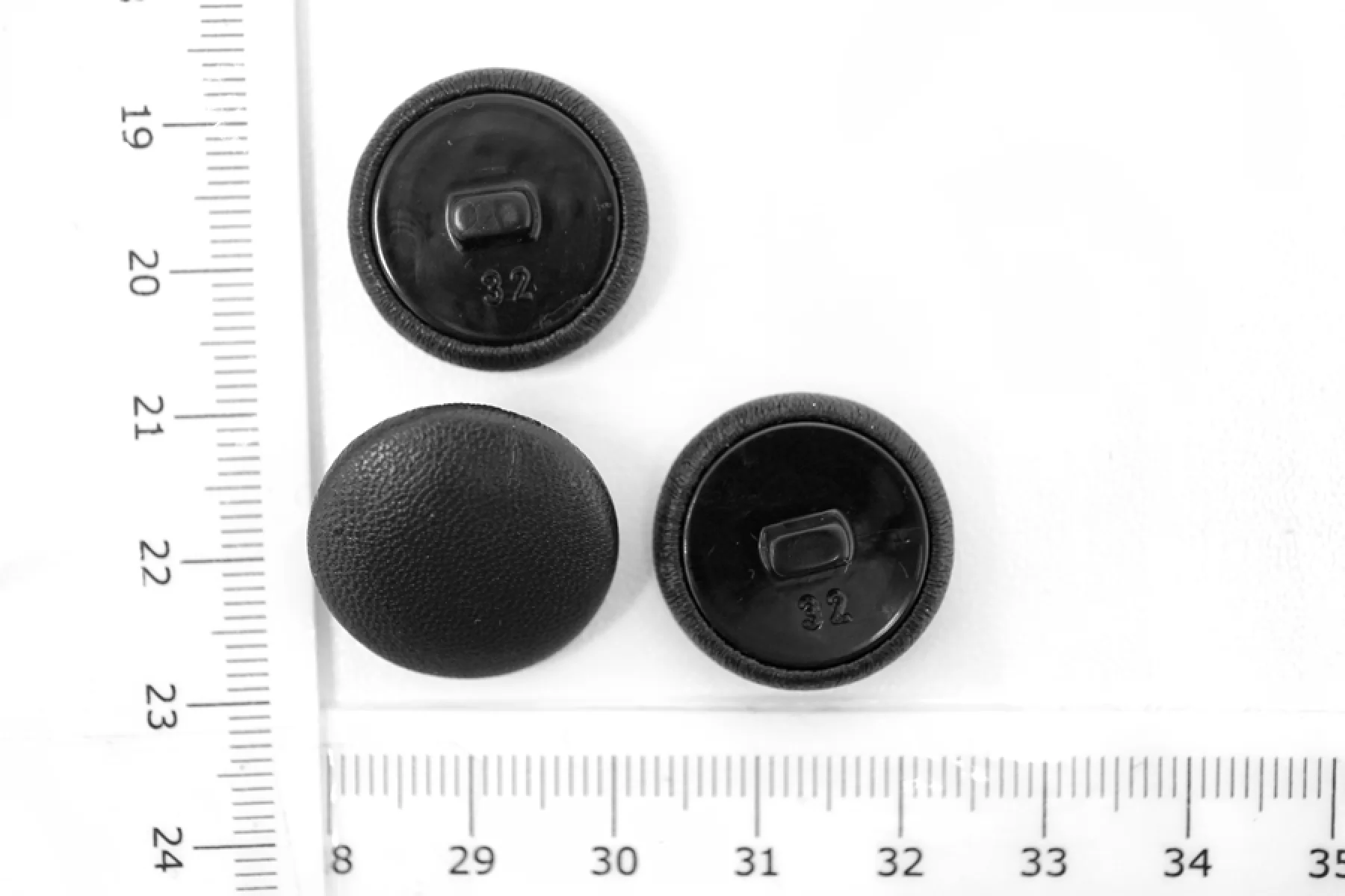 Пуговица костюмная на ножке обтянутая эко-кожей, размер 20 мм, черного цвета.