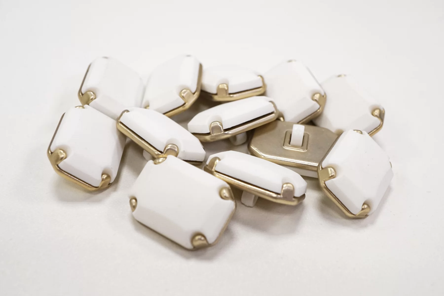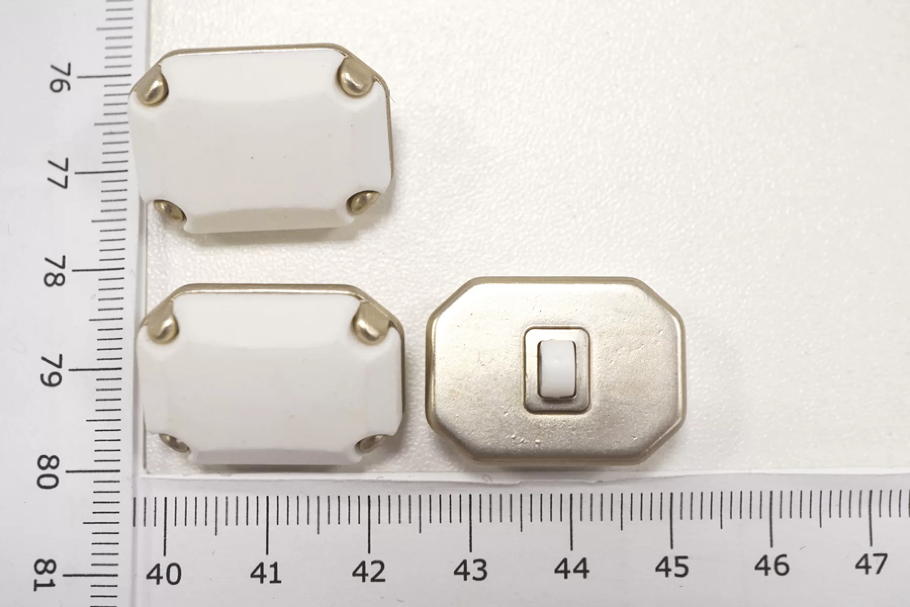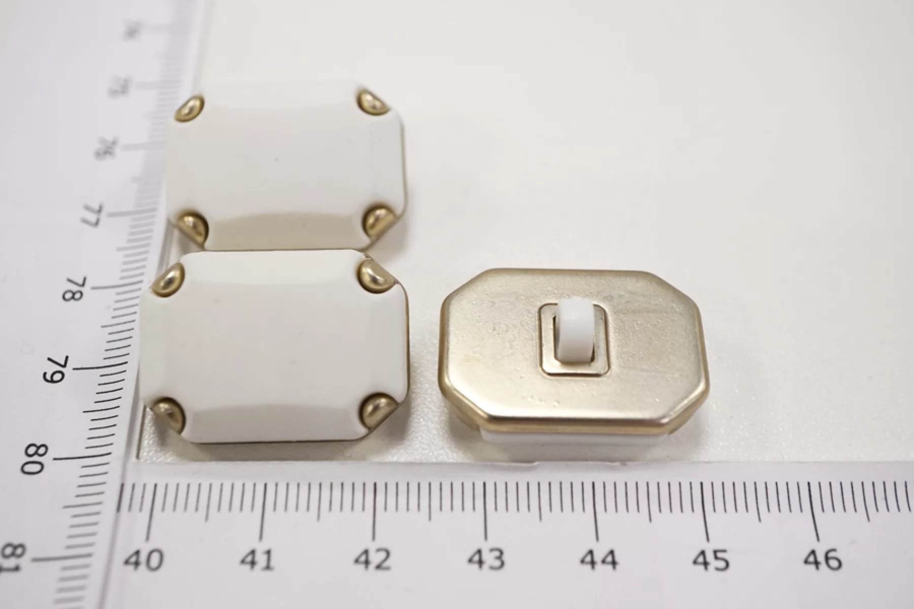 Пуговица костюмно-пальтовая на ножке из металла и пластмассы (напоминает полимерную глину) прямоугольной формы, размер 18х25 мм, основа - металл золотистого цвета, вставка из белого пластика.