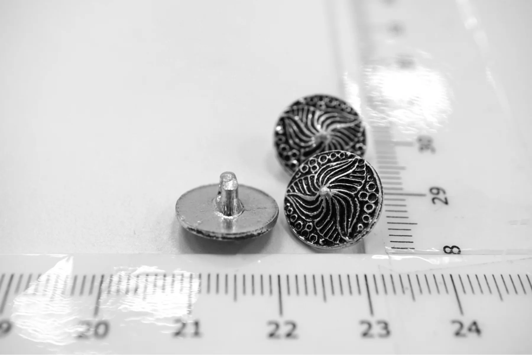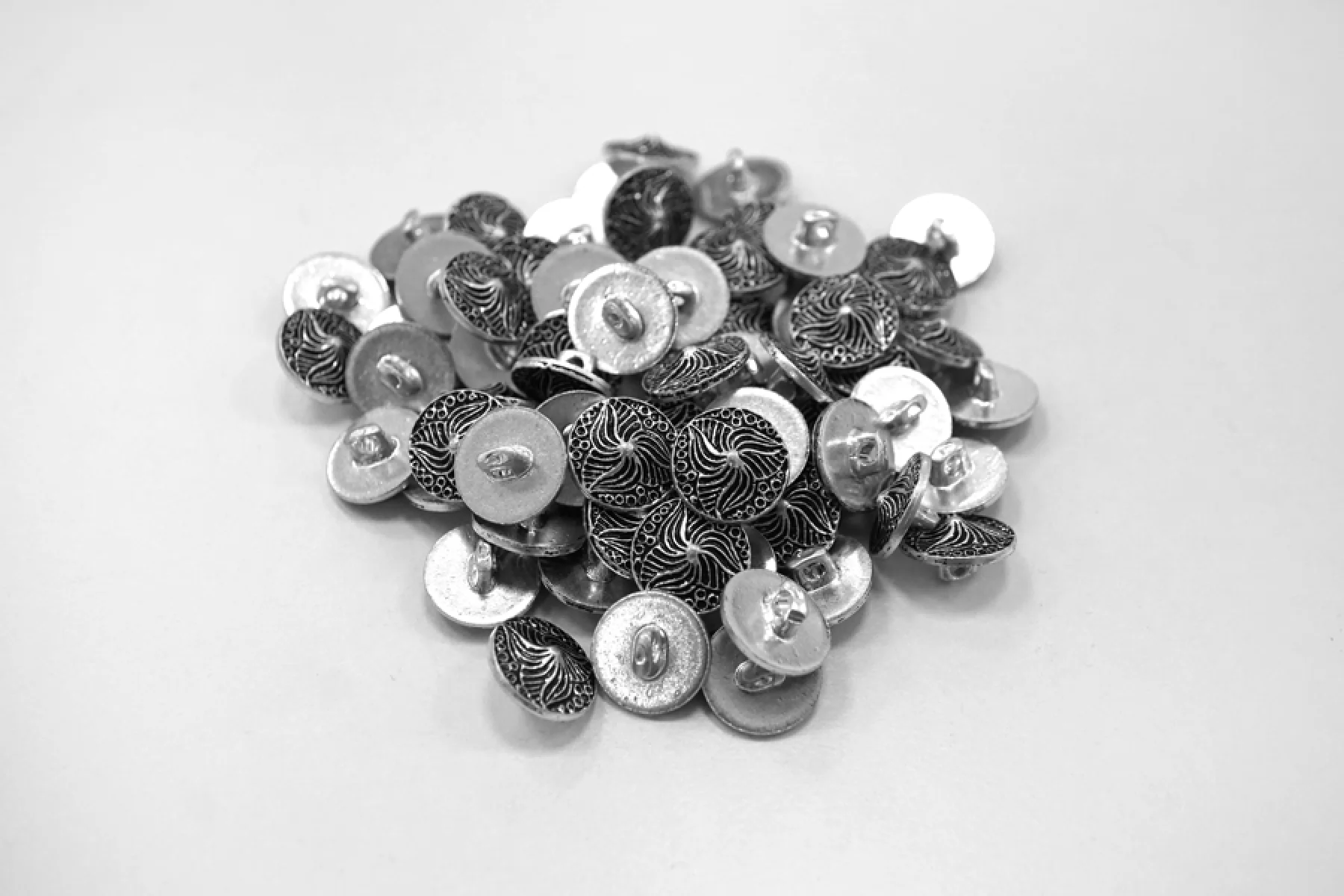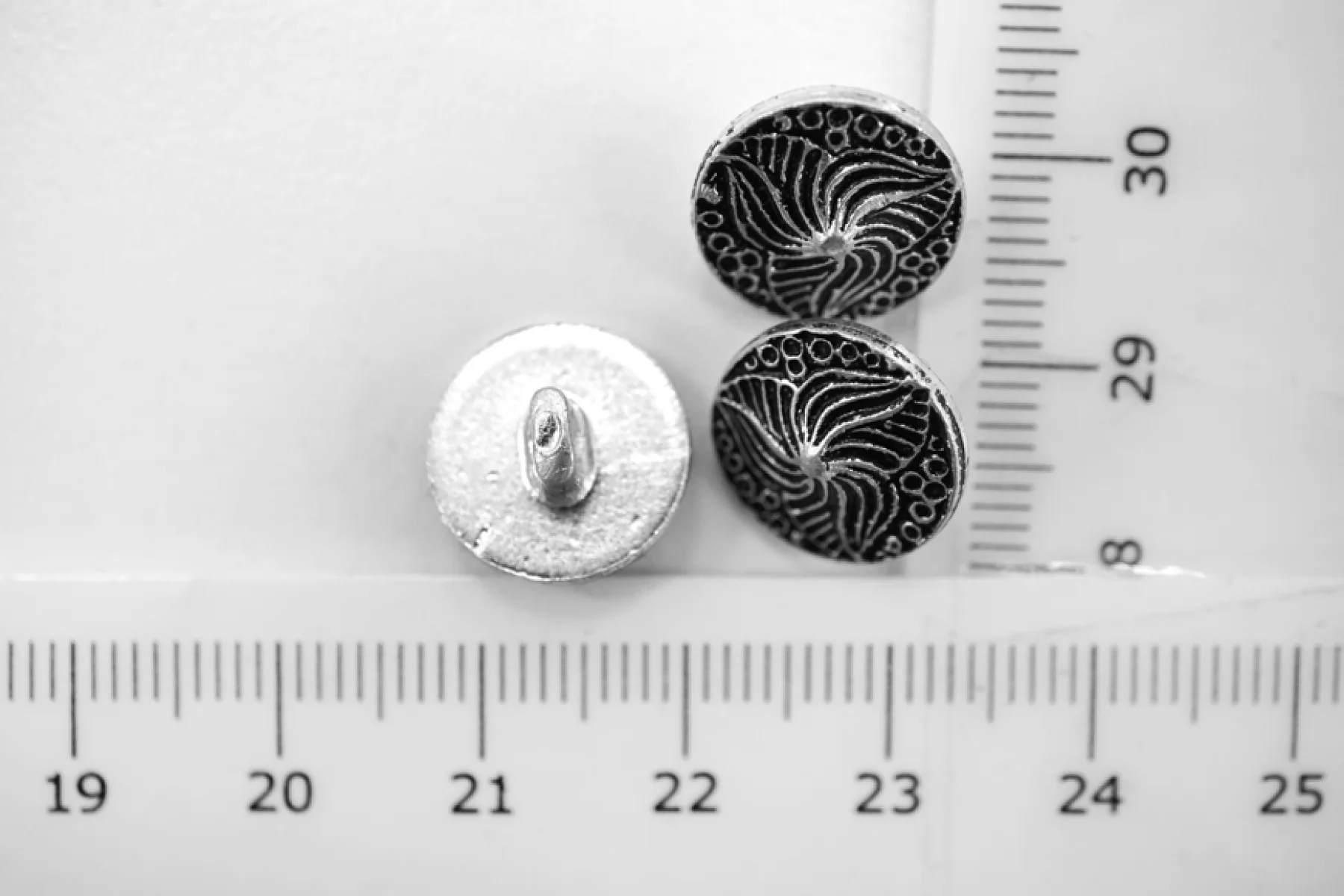 Пуговица костюмно-рубашечная на ножке металлическая серебристо-серая, размер 15 мм , с узором.