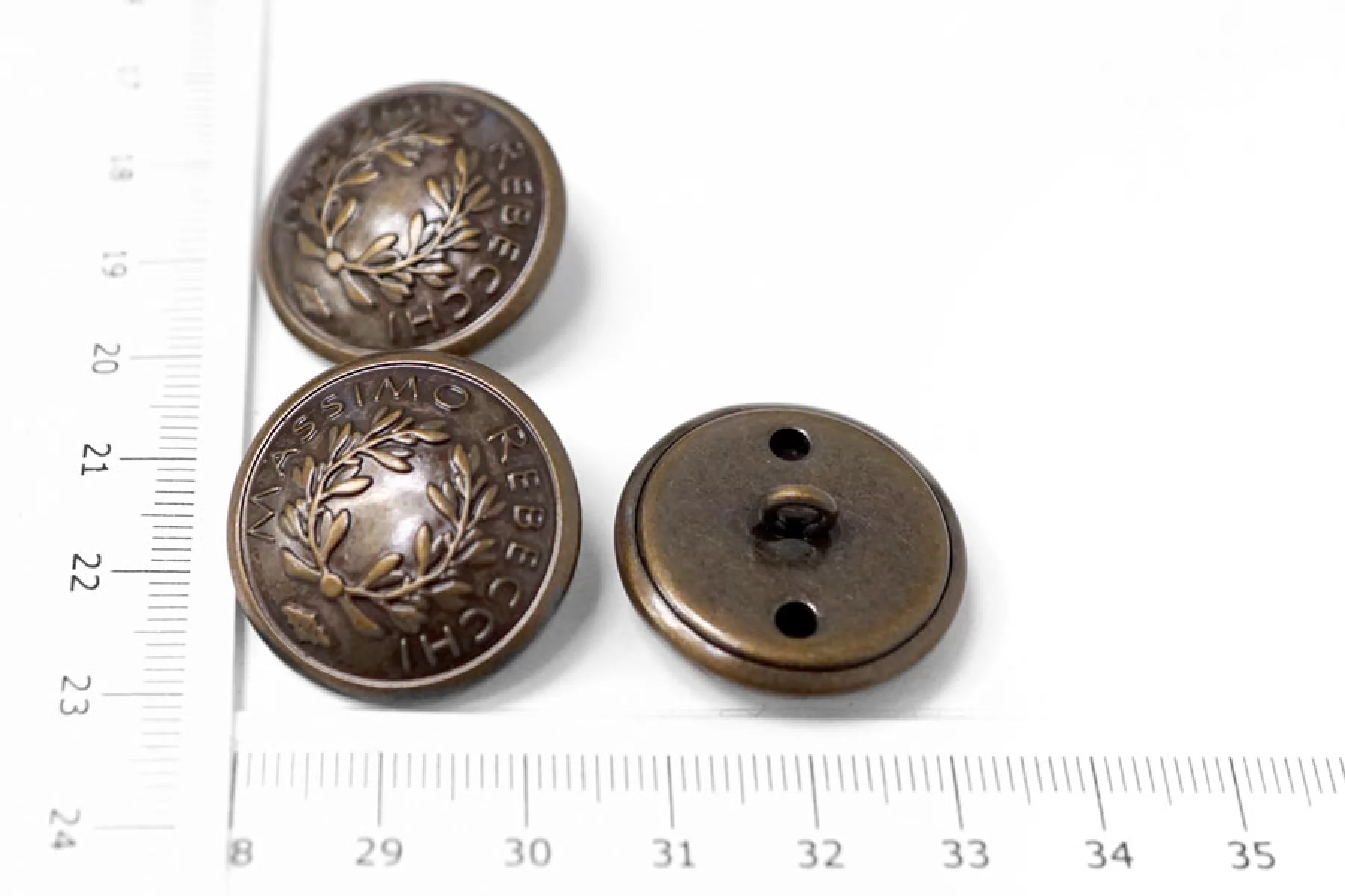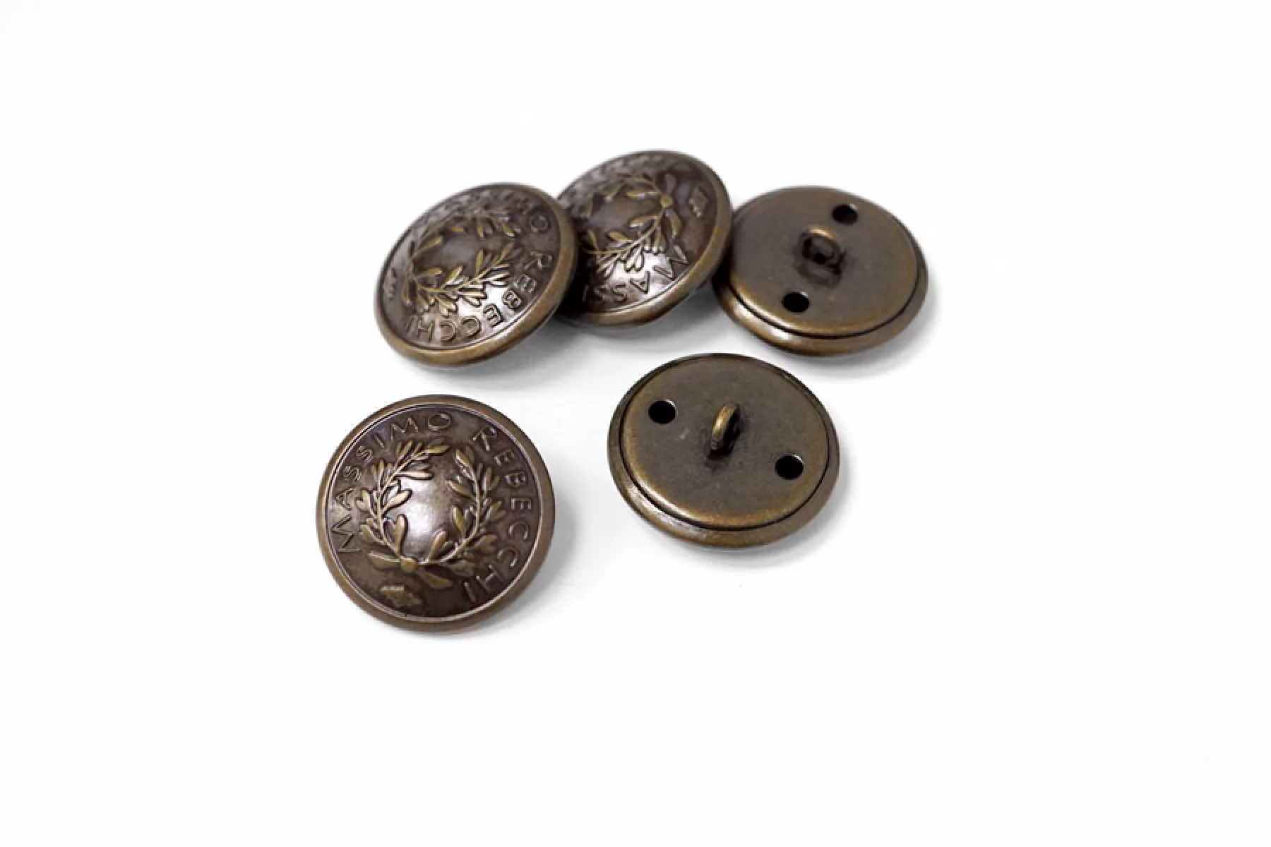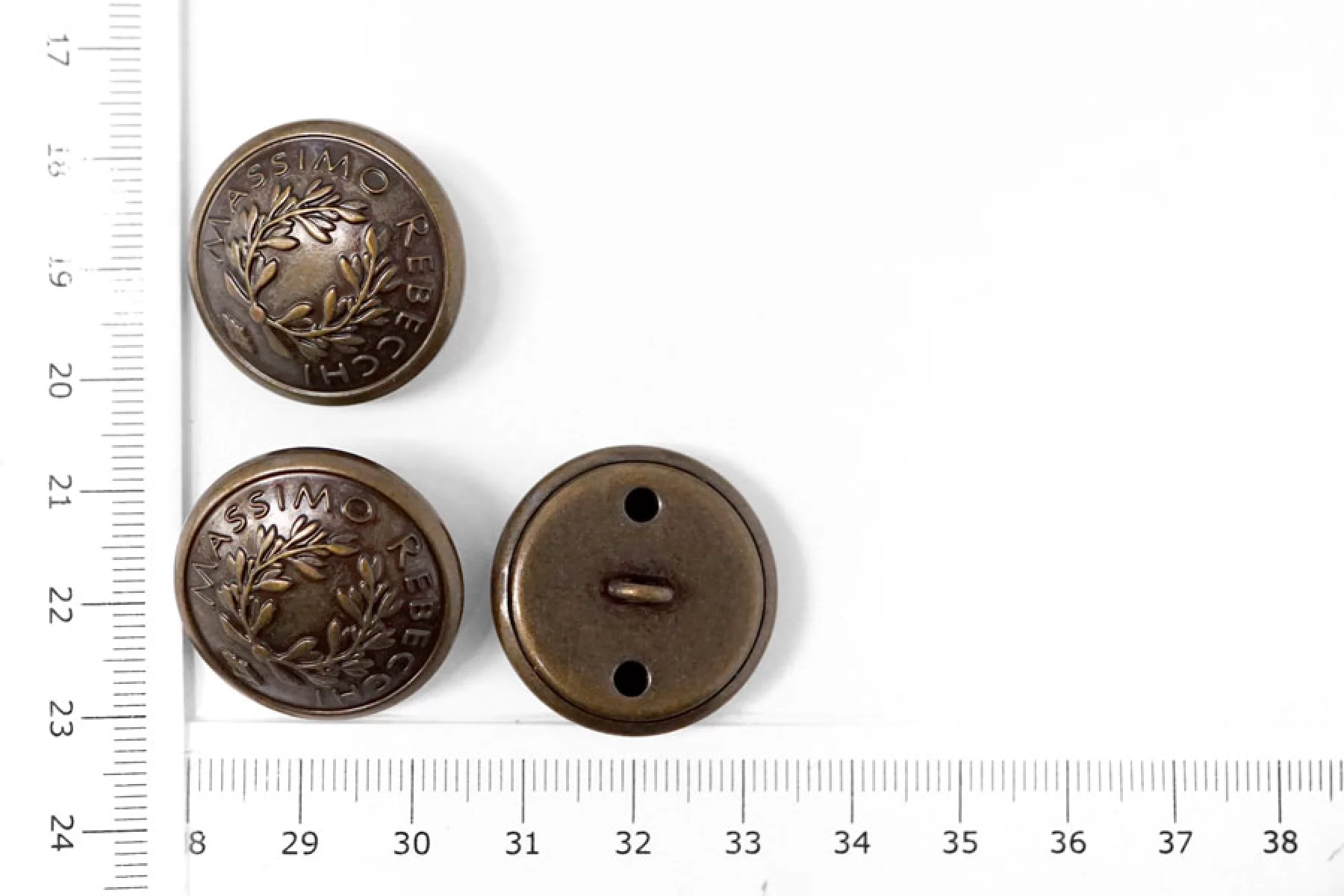 Пуговица металлическая коричневого цвета с выделкой в виде оливковой ветви и надписью MASSIMO REBECCHI. Диаметр - 26 мм.
