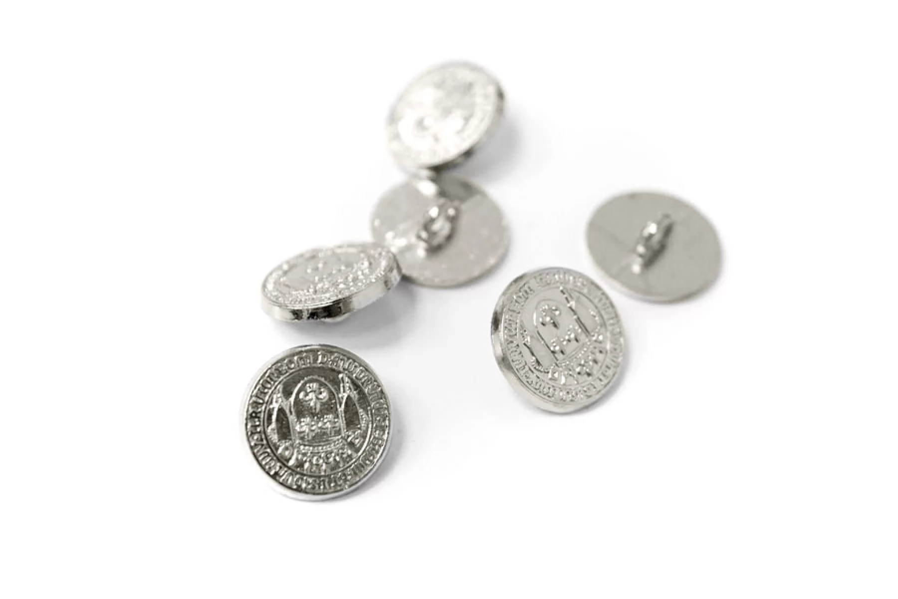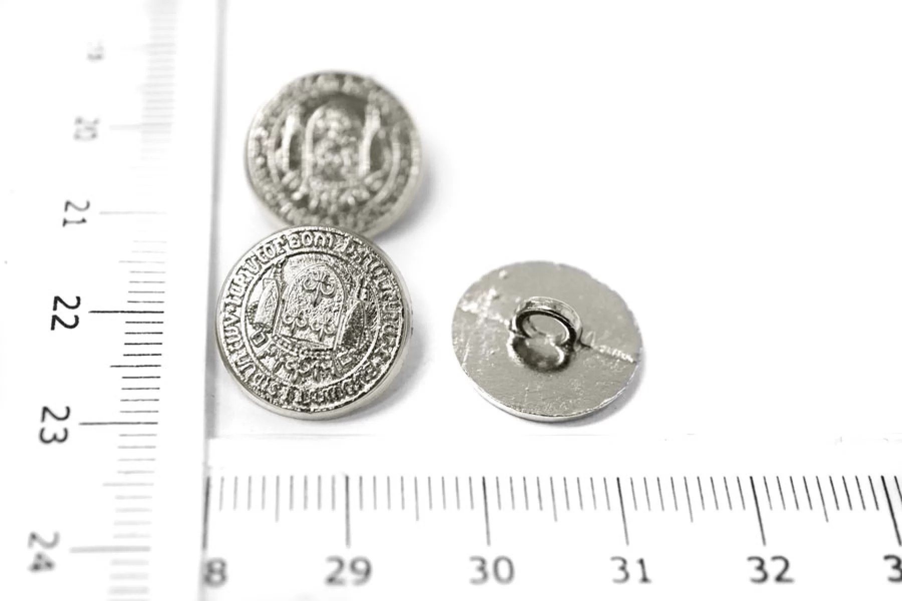 Пуговица металлическая, на ножке, серебристого цвета, с геральдикой, размер 15 мм. Пуговица партнер: 13012411 - 20 мм.