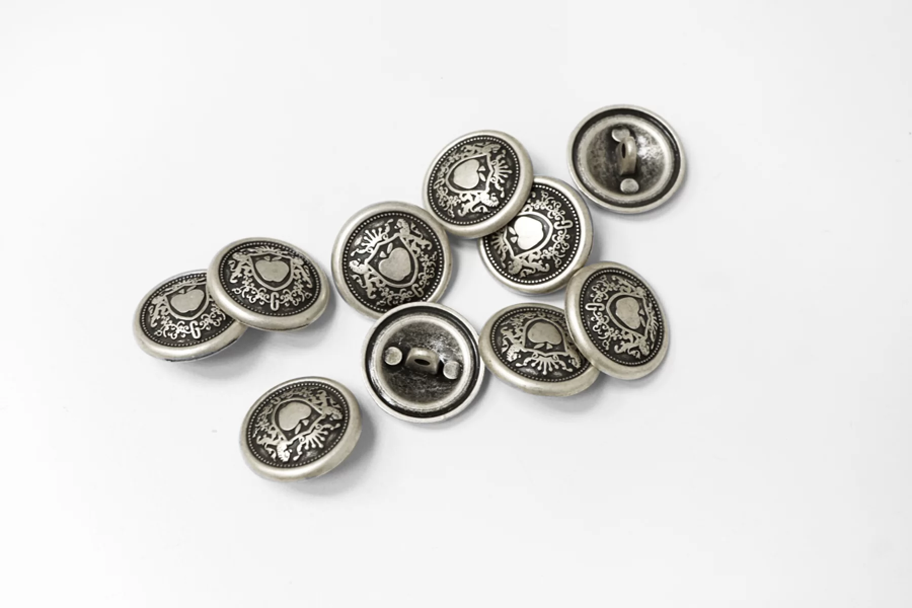 Пуговица костюмная на ножке, металлическая, серебряного цвета, размер 21 мм, с геральдикой.