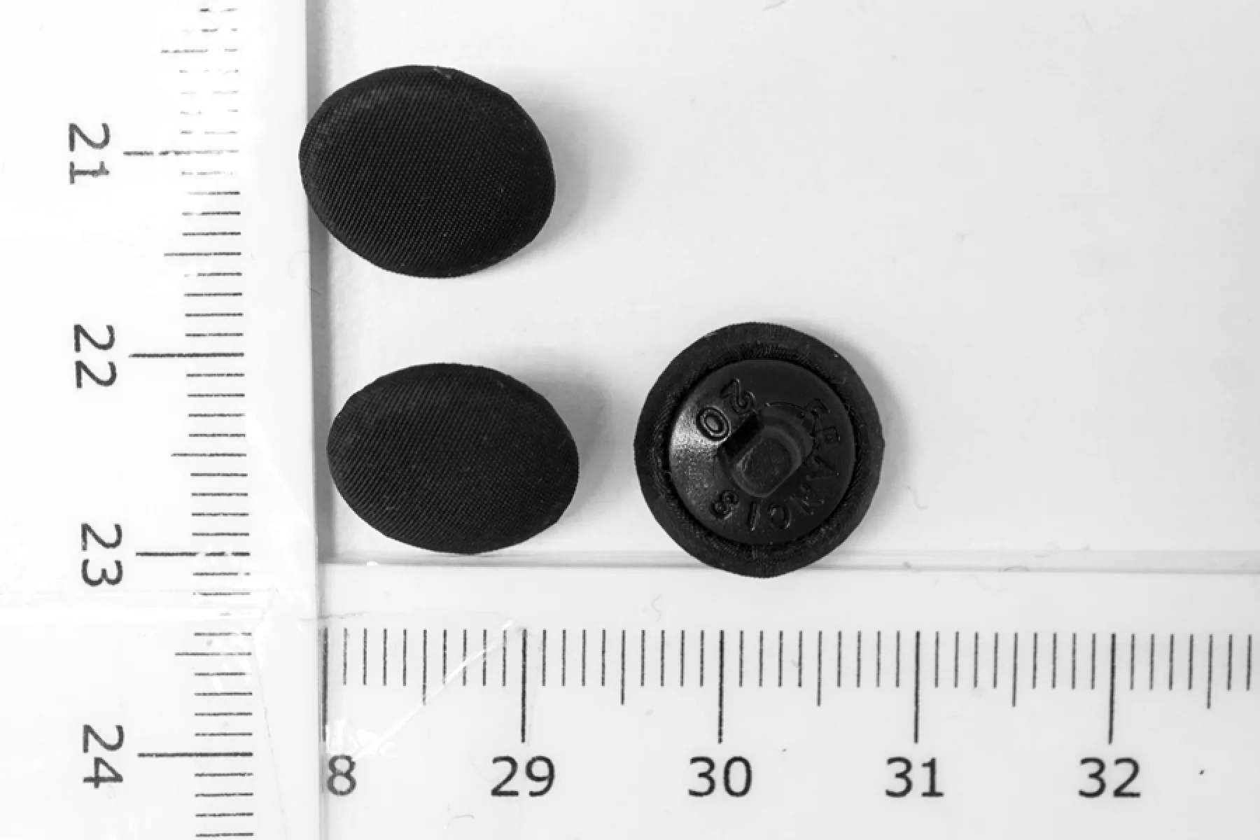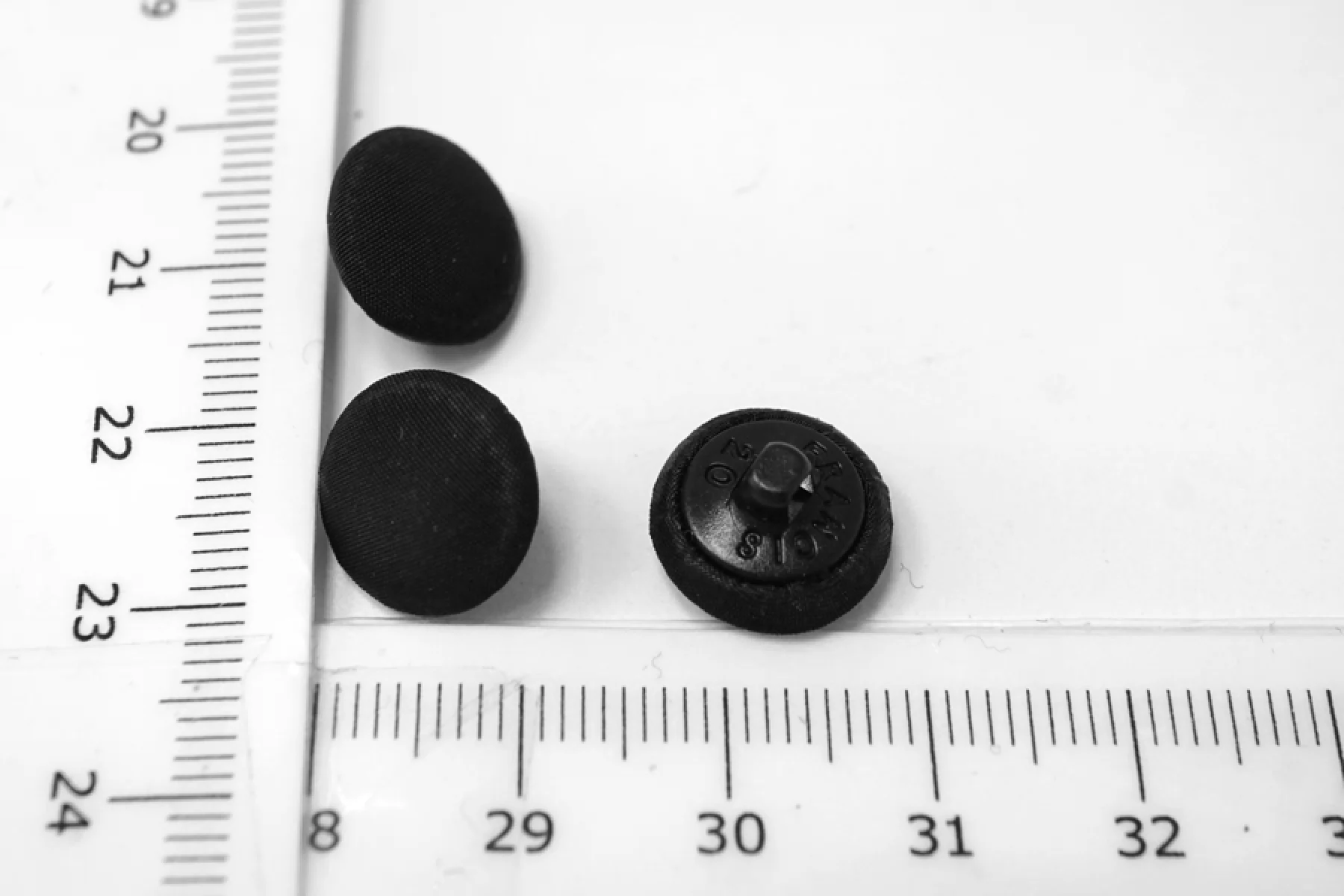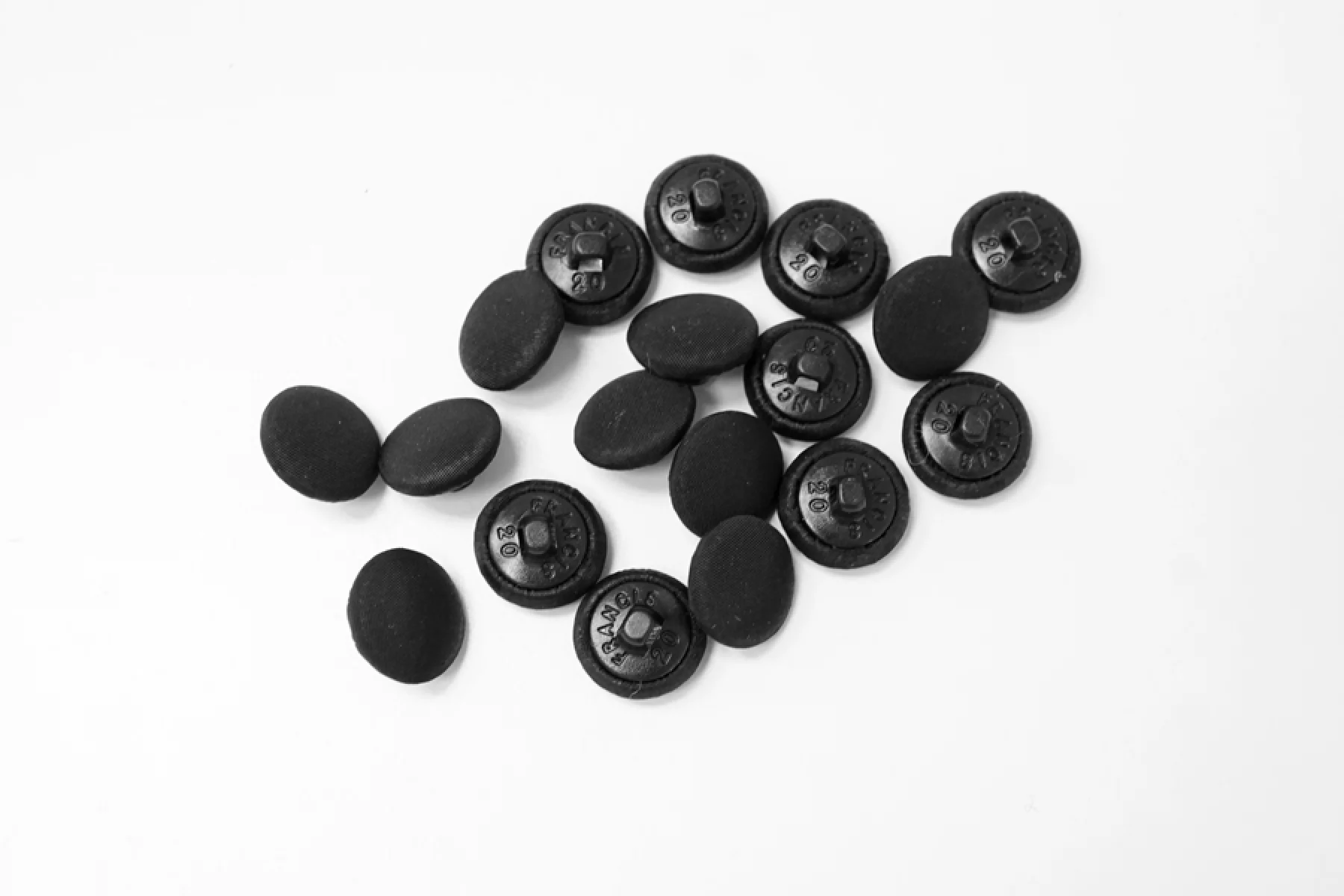 Пуговица костюмная на ножке обтянутая текстилем черного цвета, размер 20 мм. На ощупь гладкая.