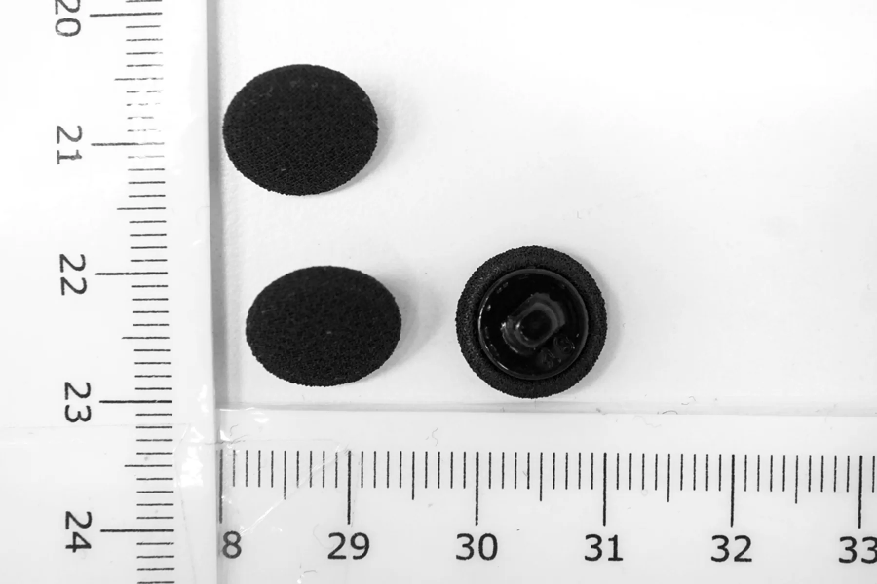 Пуговица костюмная на ножке обтянутая текстилем черного цвета, размер 20 мм. На ощупь чувствуется креповая фактура.