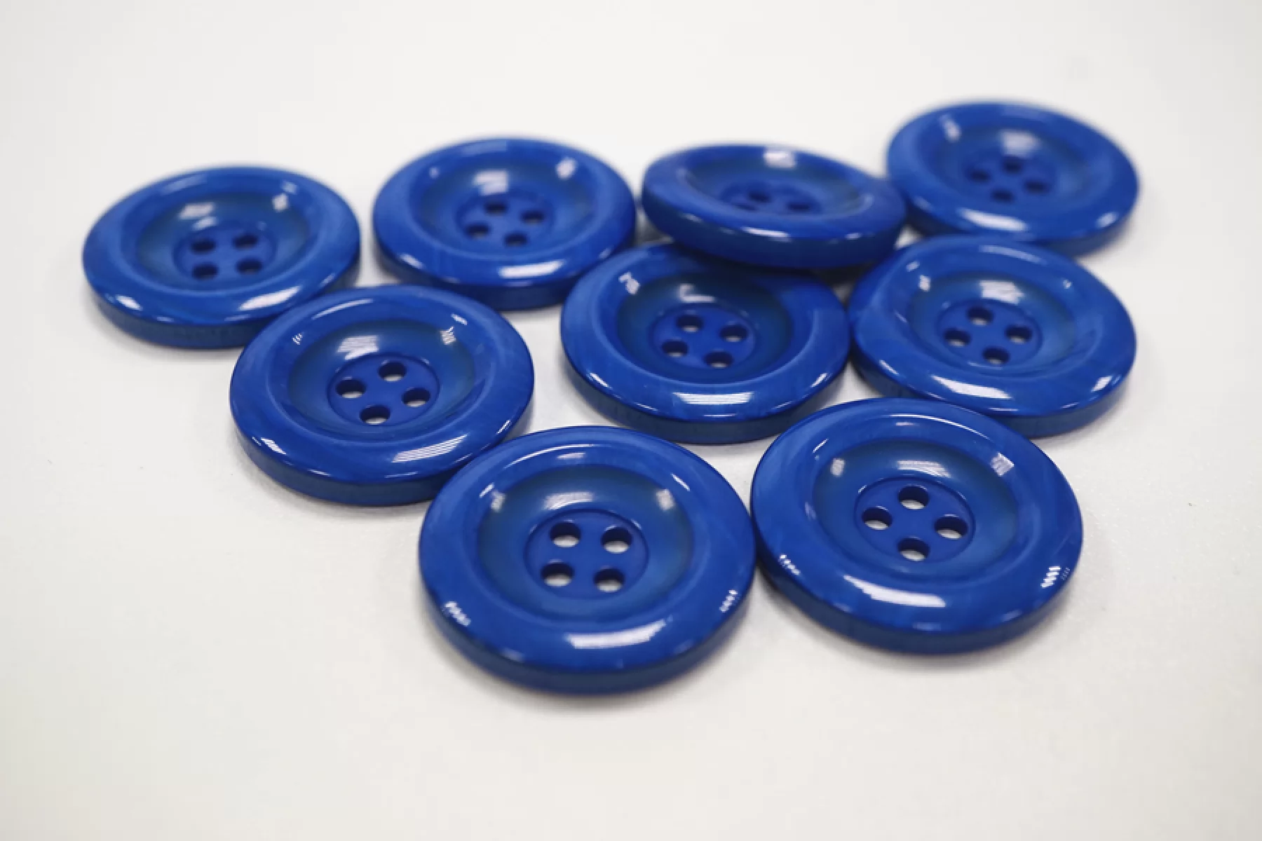 Пуговица пальтовая из пластмассы, размер 25 мм, синего цвета с гладкой глянцевой поверхностью.
