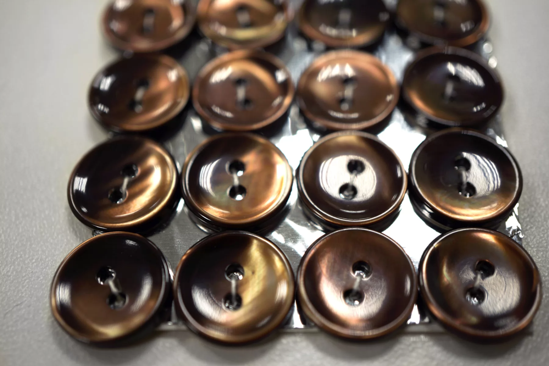 Пуговица из перламутра, размер 14 мм, цвет коричневый с переливом. Пуговицы из натурального перламутра хрупкие, могут сломаться при падении с высоты или при сильном сжатии.