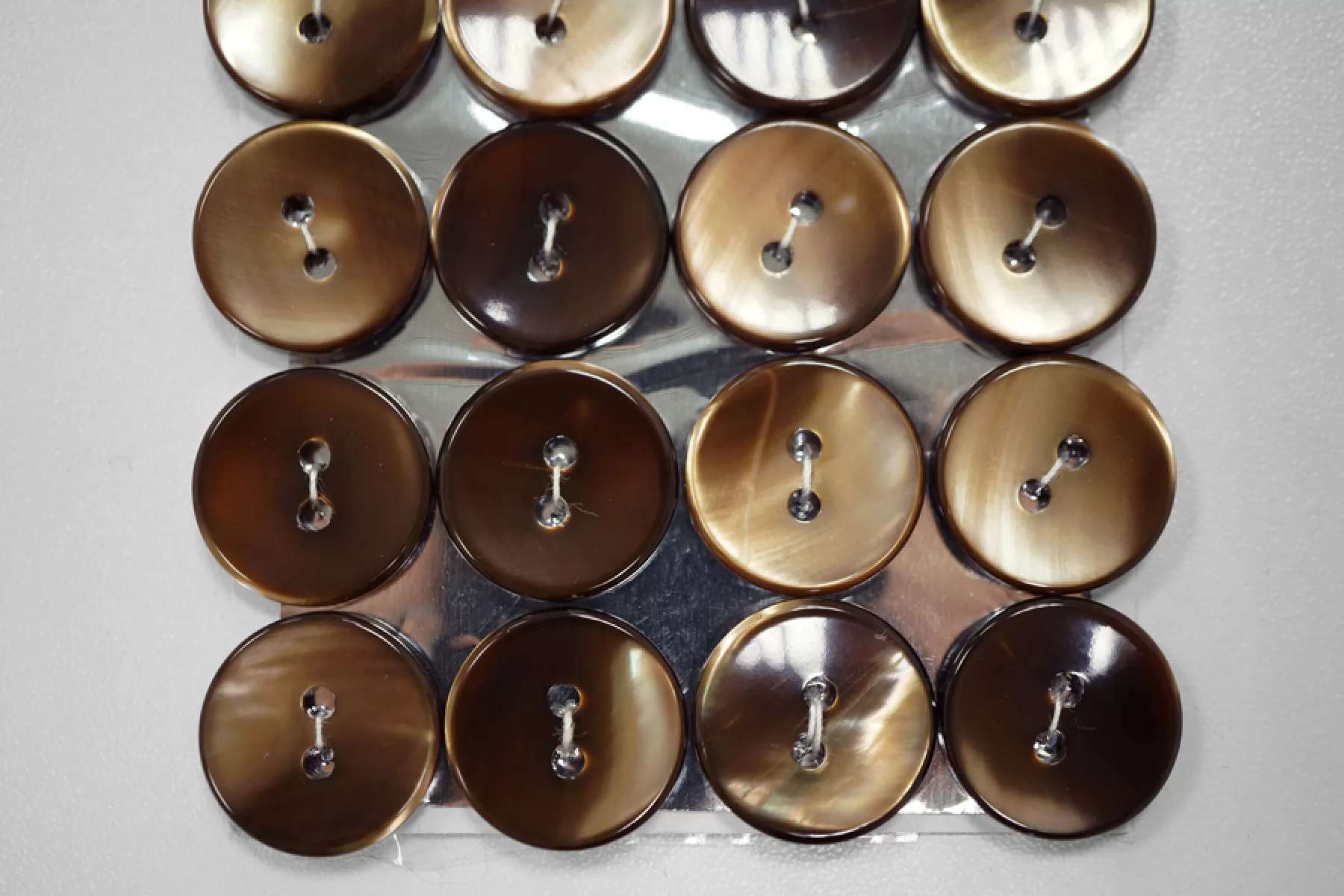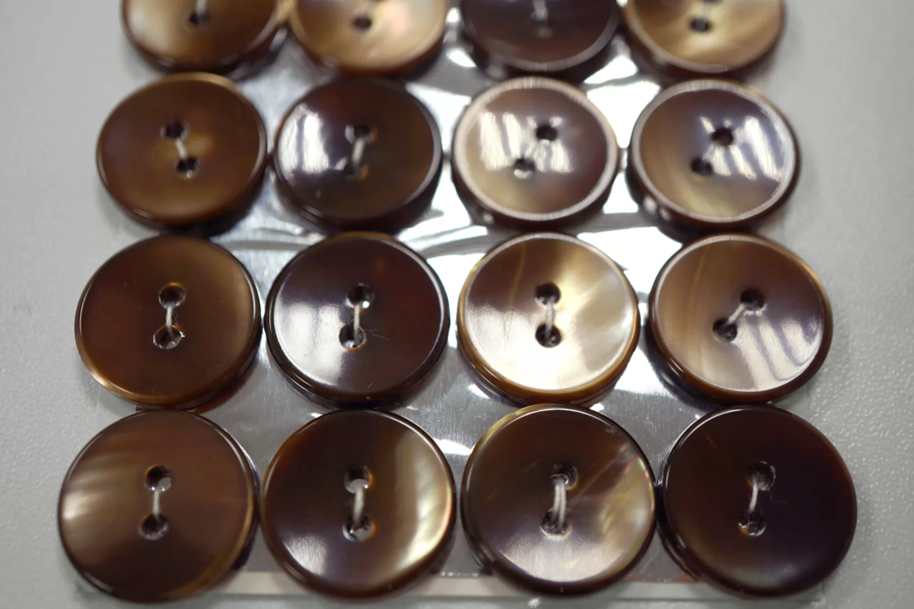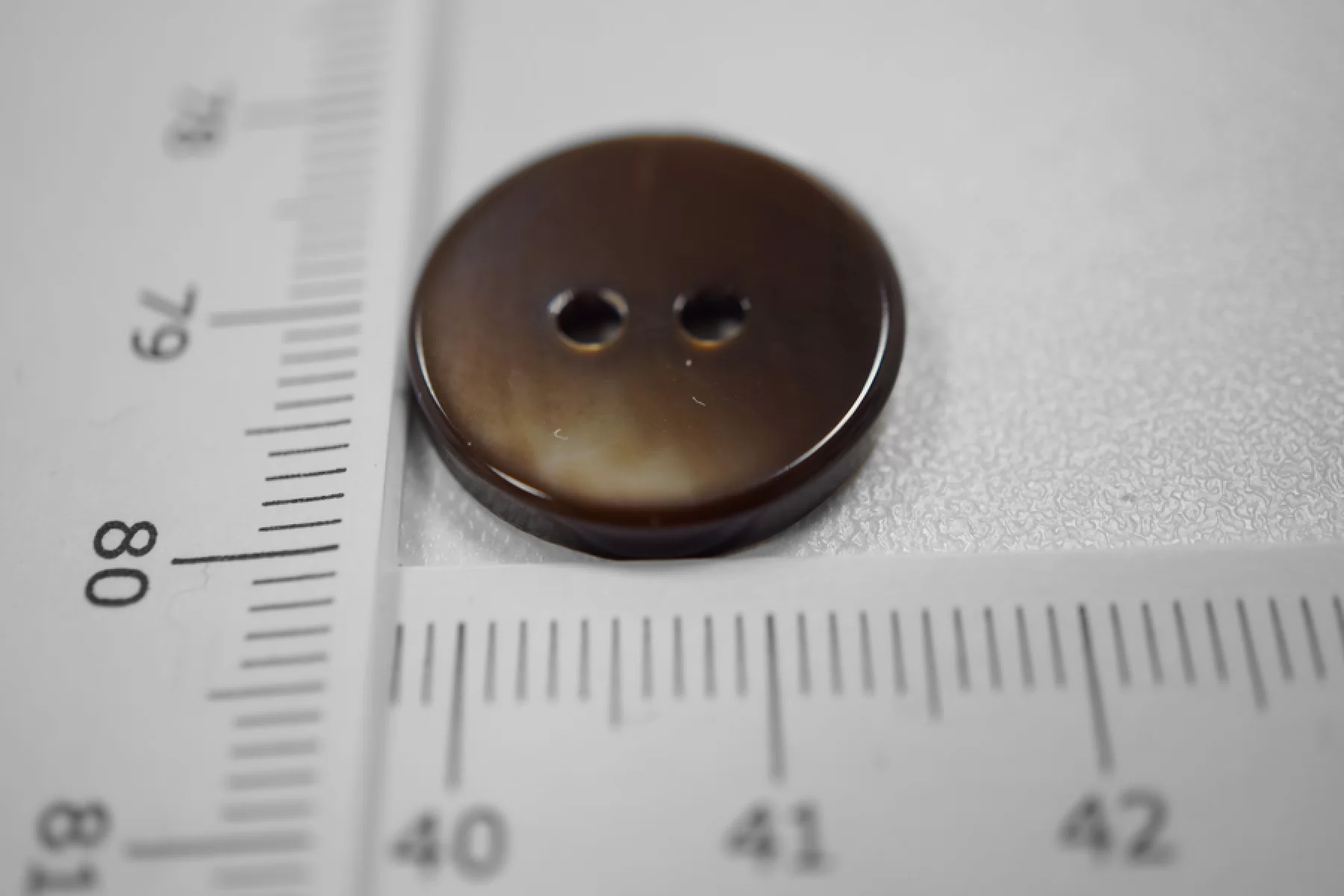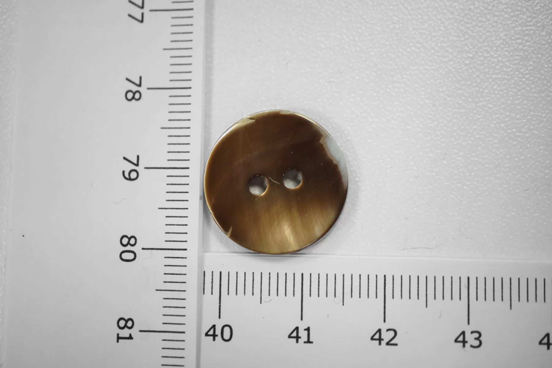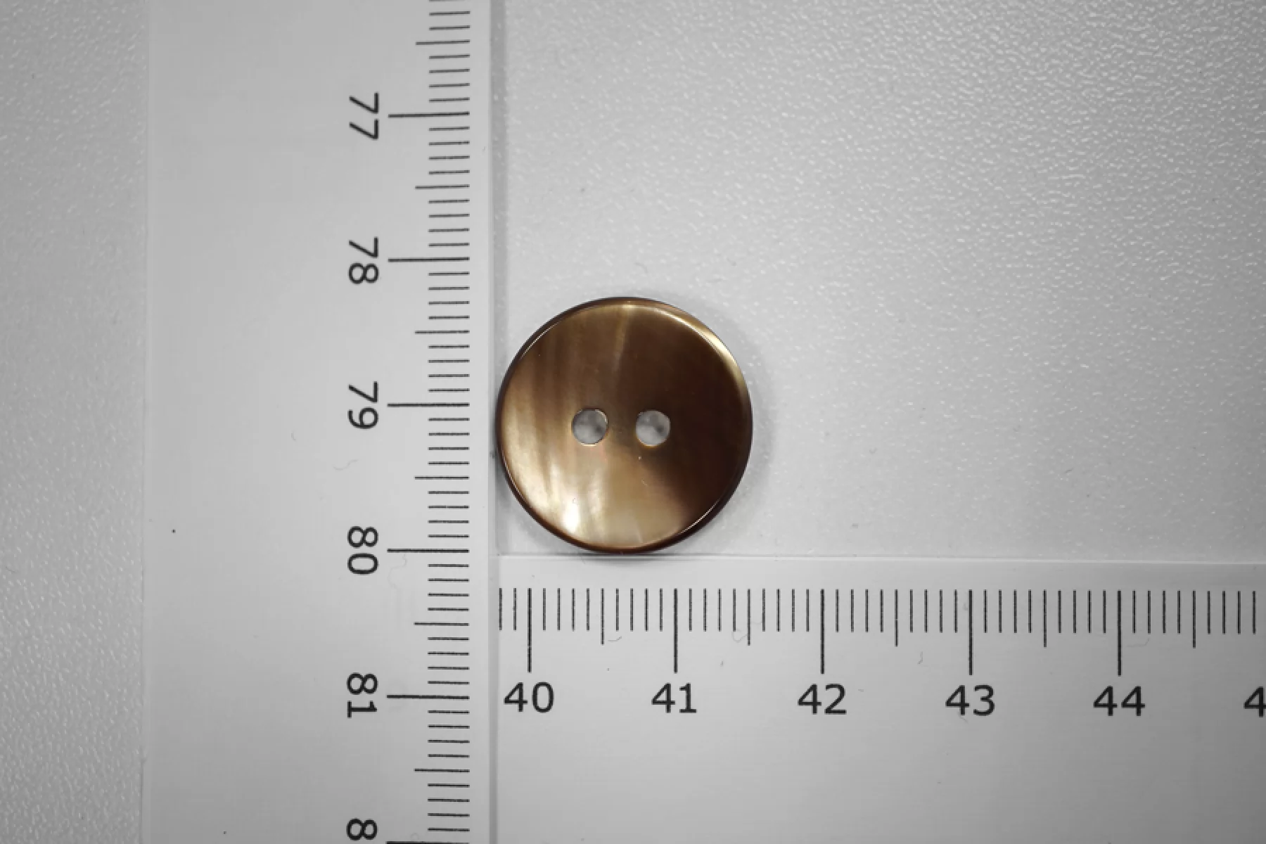 Пуговица из перламутра, размер 17 мм, цвет карамельно-коричневый с переливом. Пуговицы из натурального перламутра хрупкие, могут сломаться при падении с высоты или при сильном сжатии.
