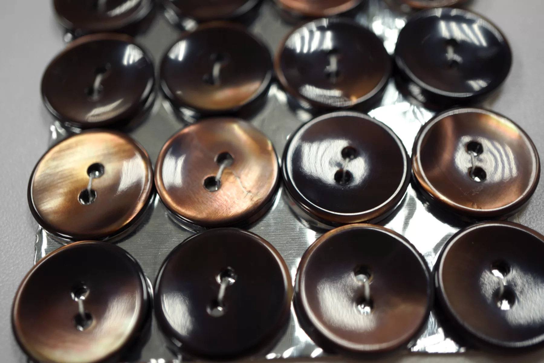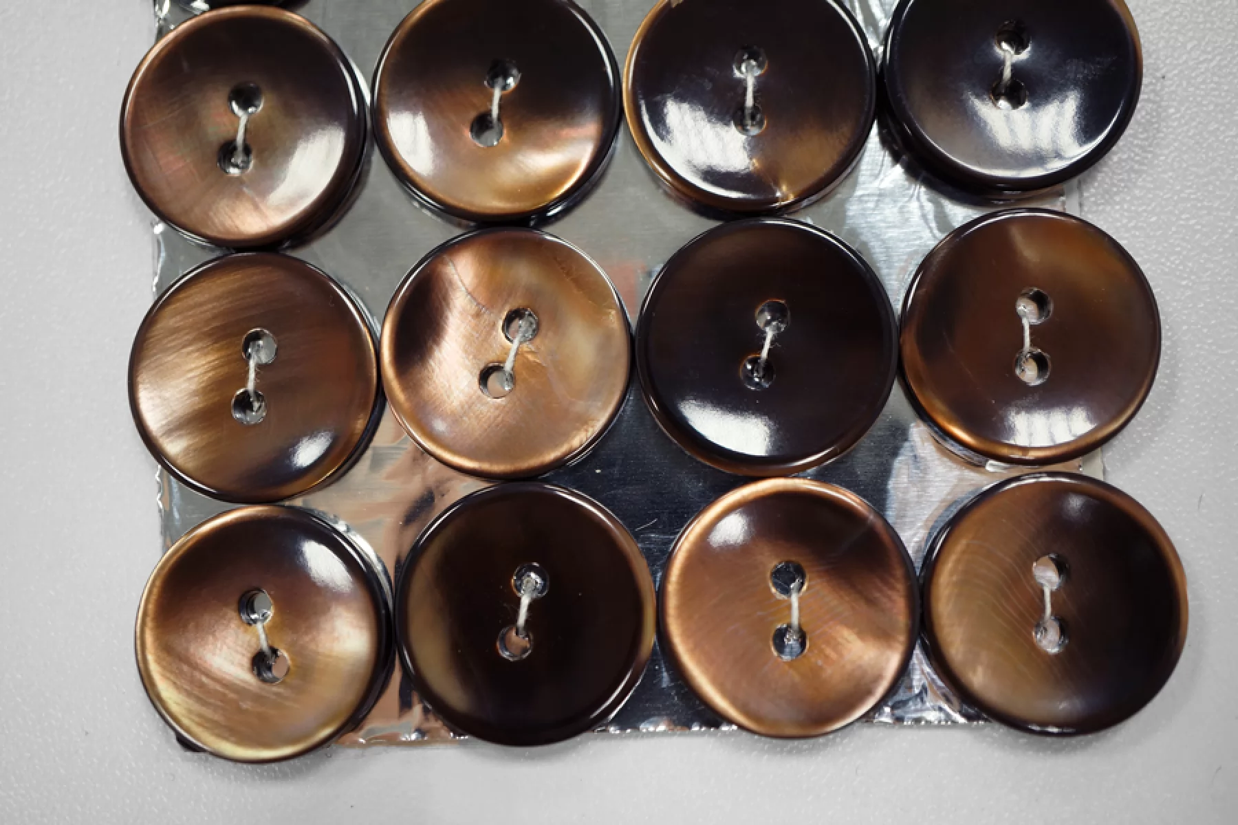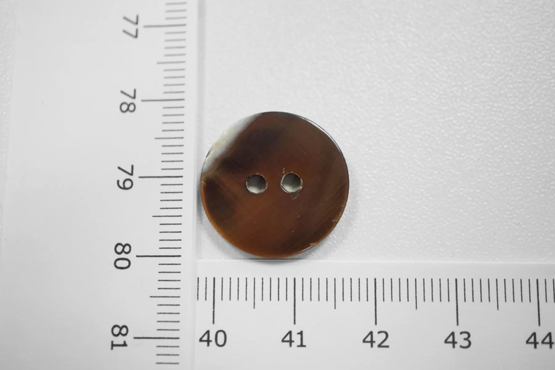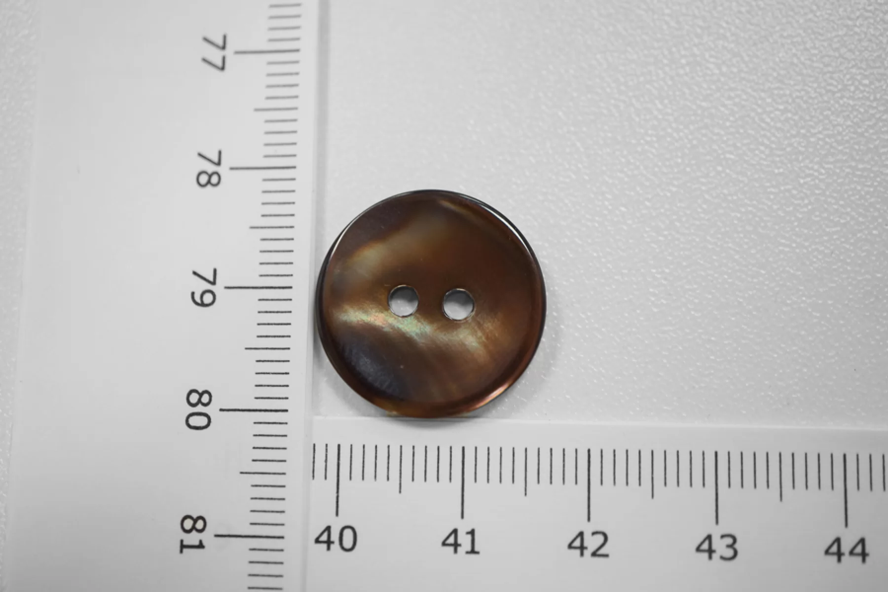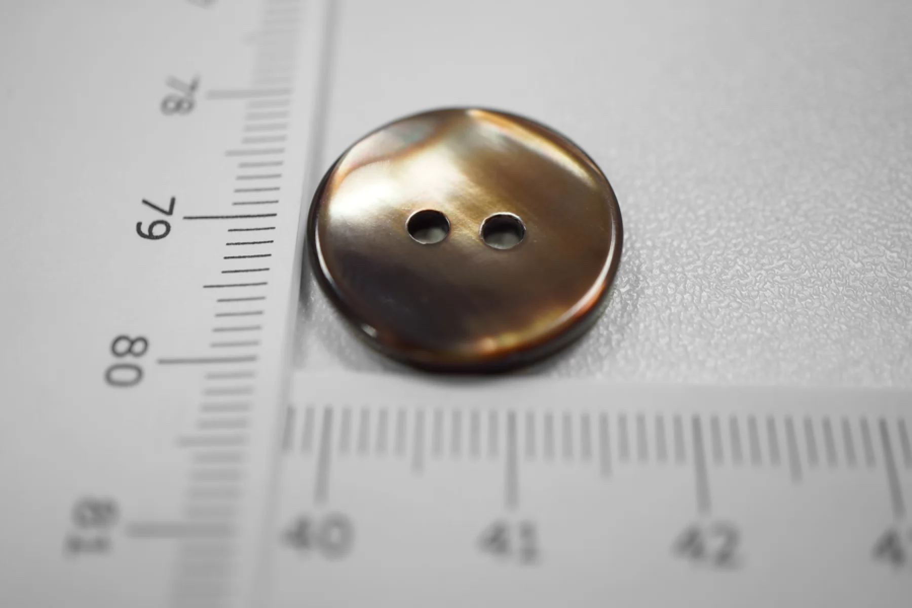 Пуговица из перламутра, размер 18 мм, цвет коричневый с переливом. Пуговицы из натурального перламутра хрупкие, могут сломаться при падении с высоты или при сильном сжатии.