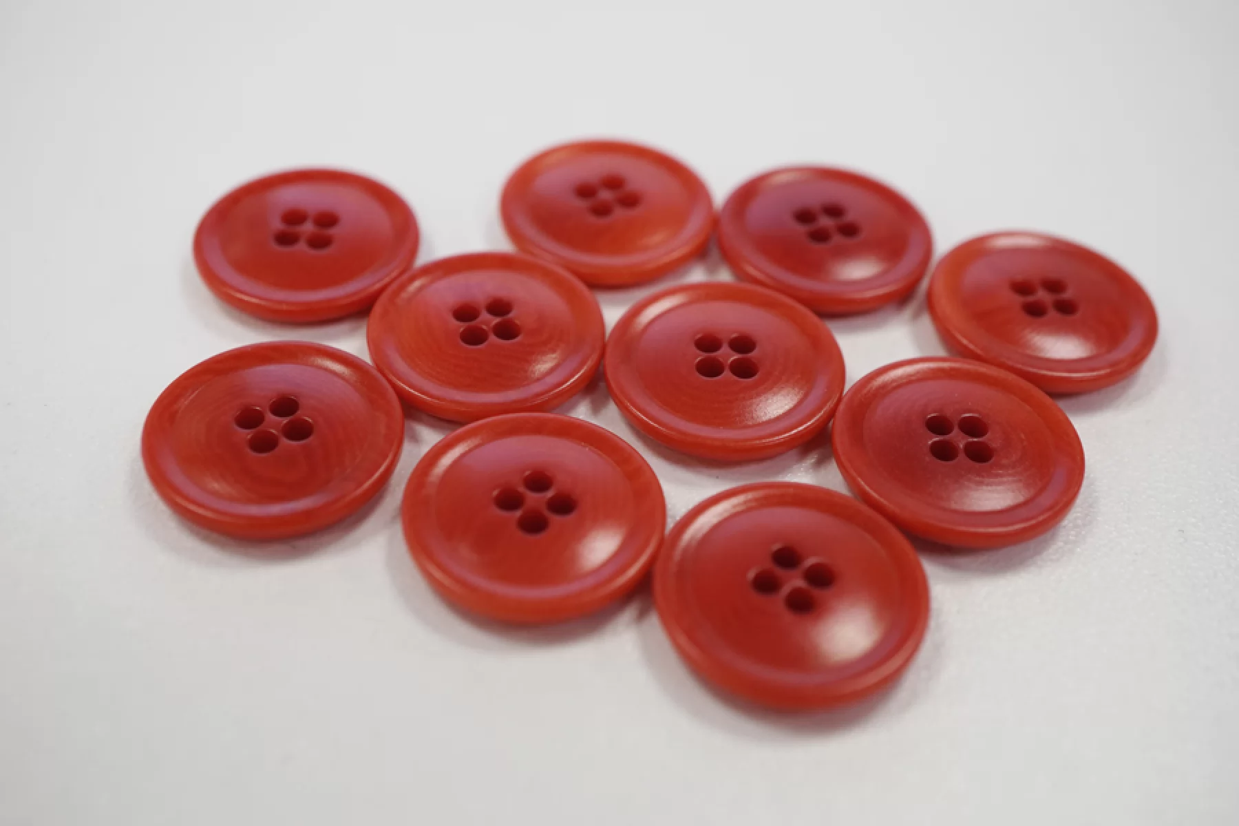 Пуговица костюмно-плательная из пластмассы, размер 17 мм, красного цвета, с волнообразной окраской и гладкой поверхностью.