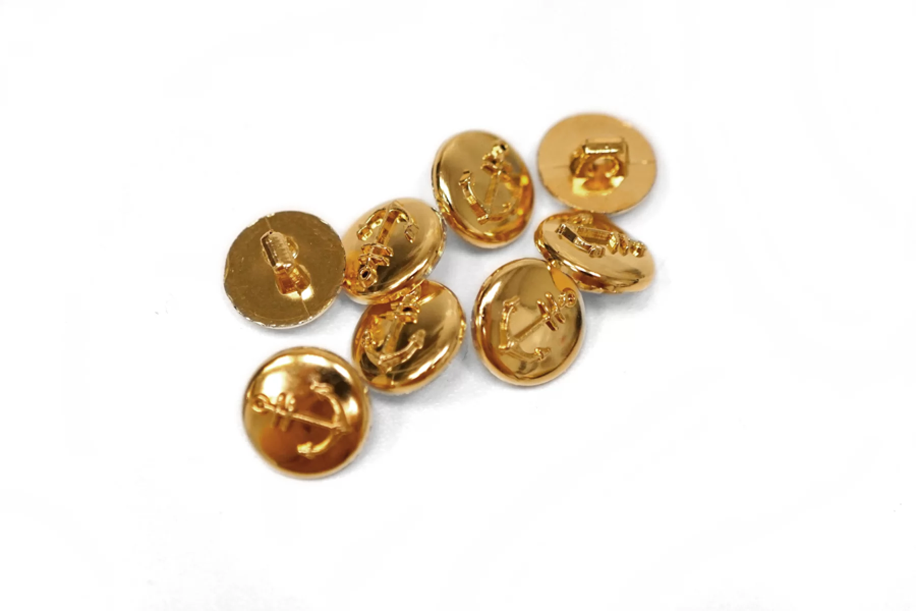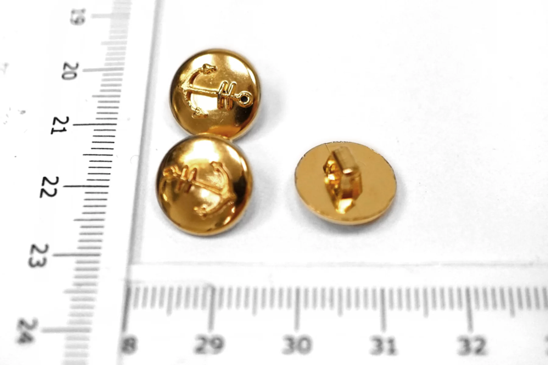 Пуговица костюмная пластиковая на ножке, размер 12 мм, золотого цвета, с узором в виде якоря.