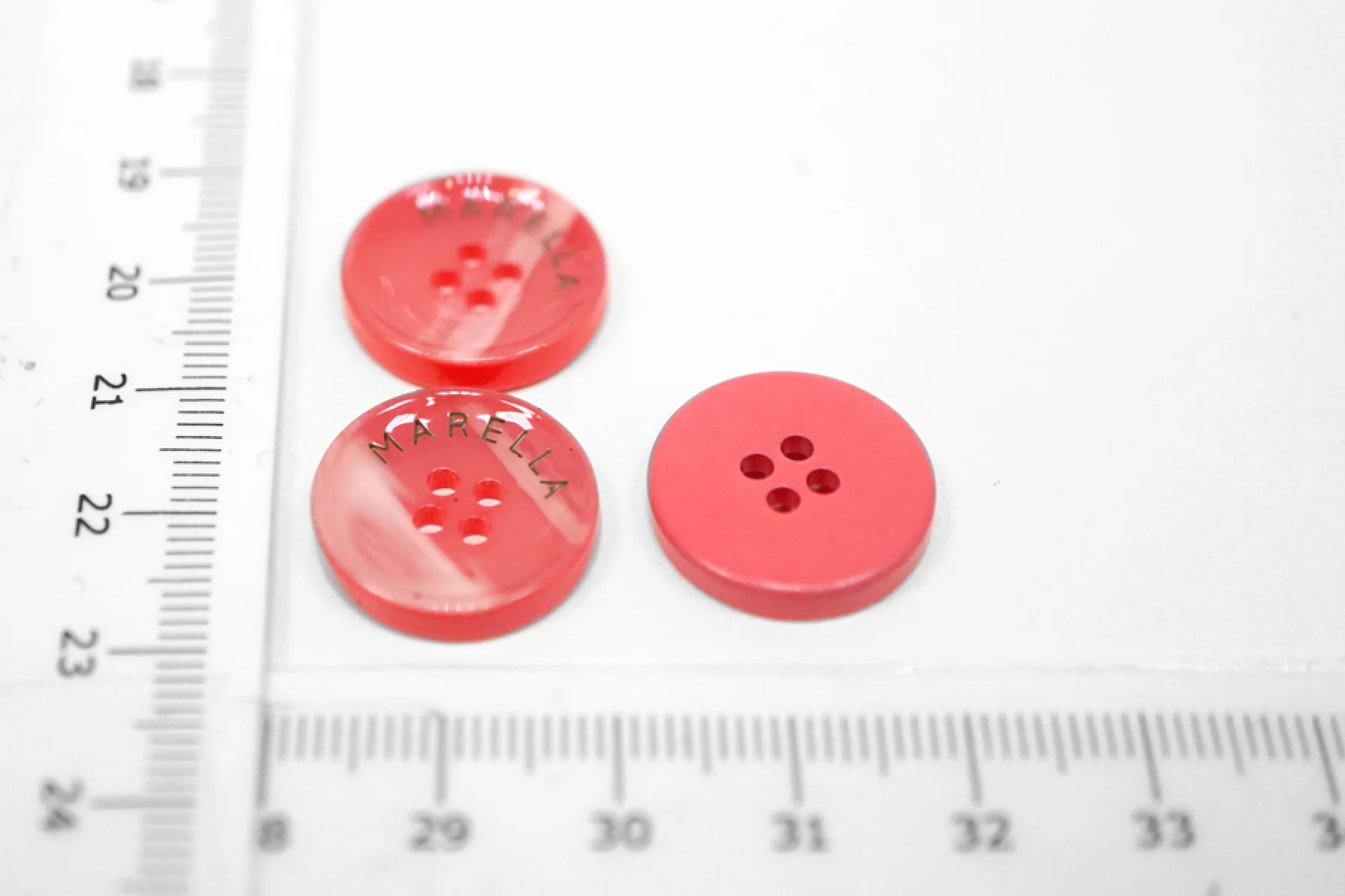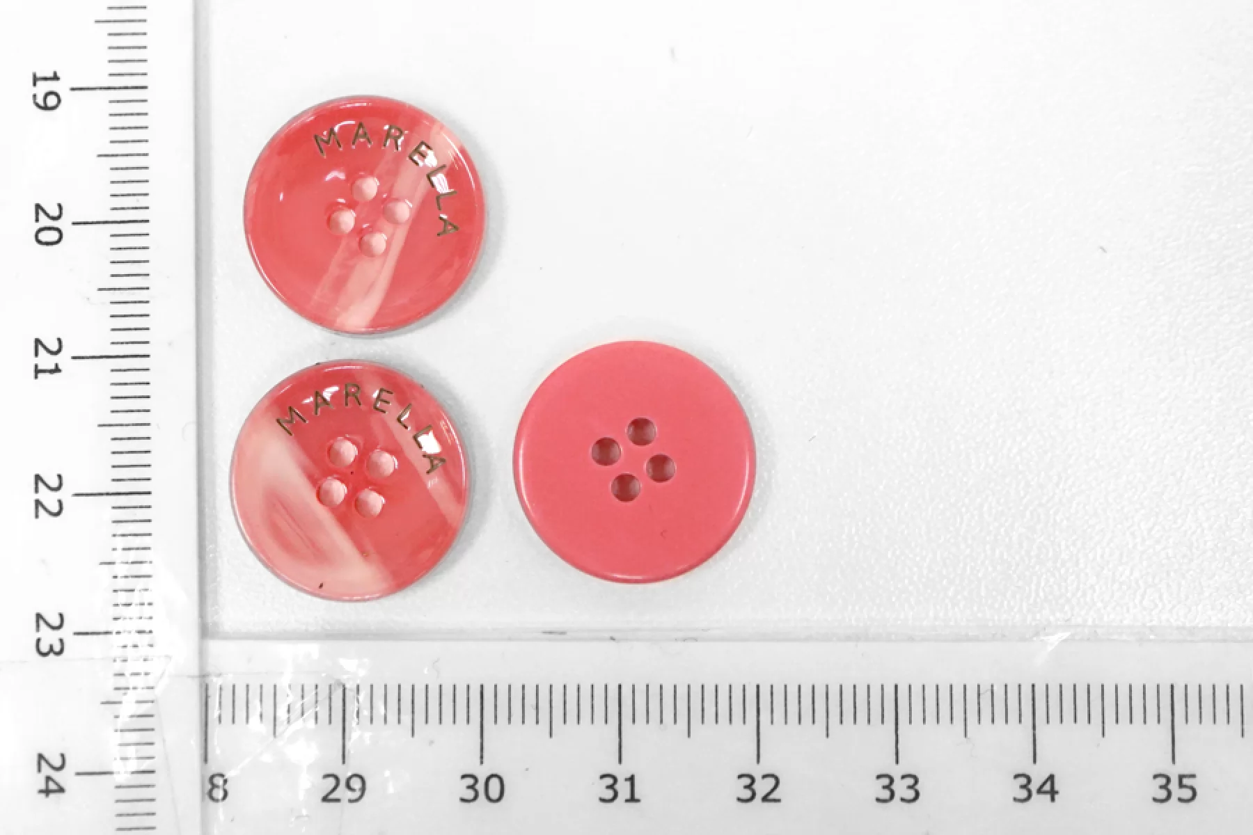 Пуговица пластиковая костюмная коралловая с белыми переливами и гравировкой MARELLA. Размер 18 мм.