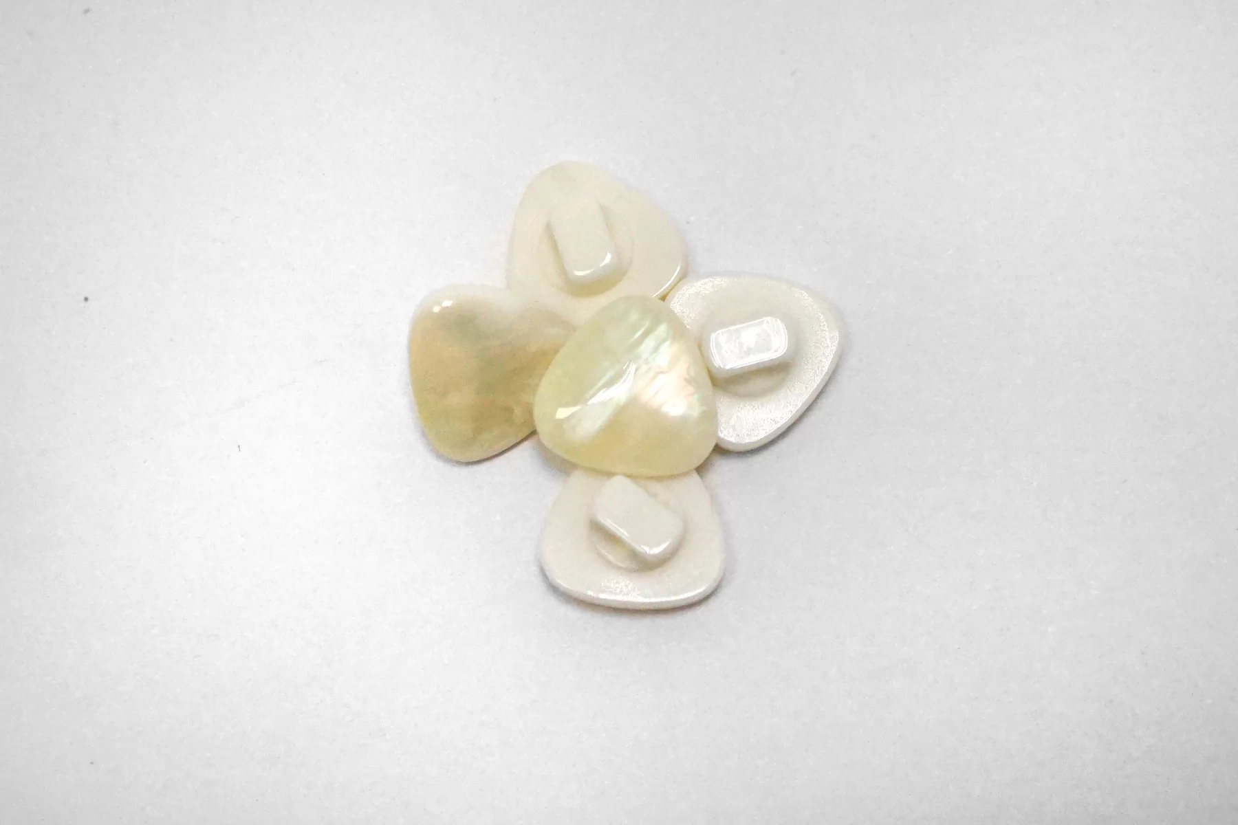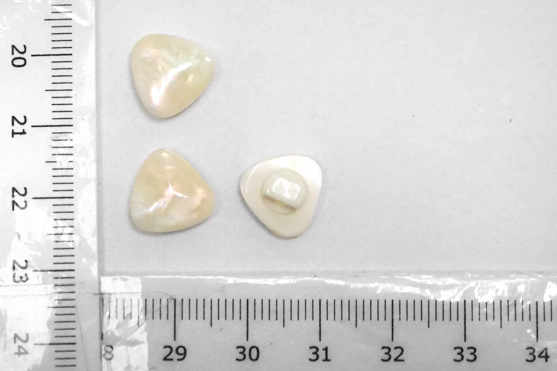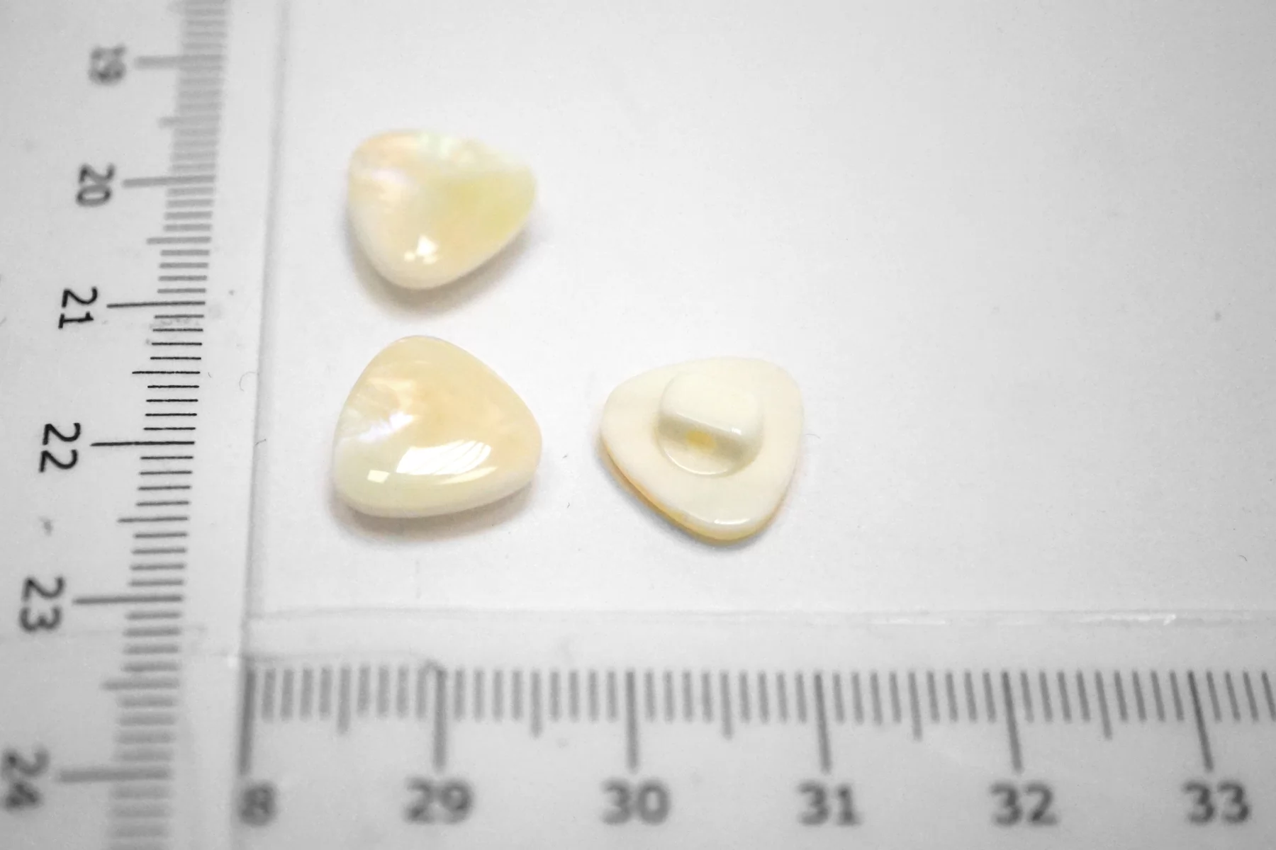 Пластиковая рубашечная пуговица на ножке , треугольной формы, молочного цвета с перламутром . Размер 12 мм .