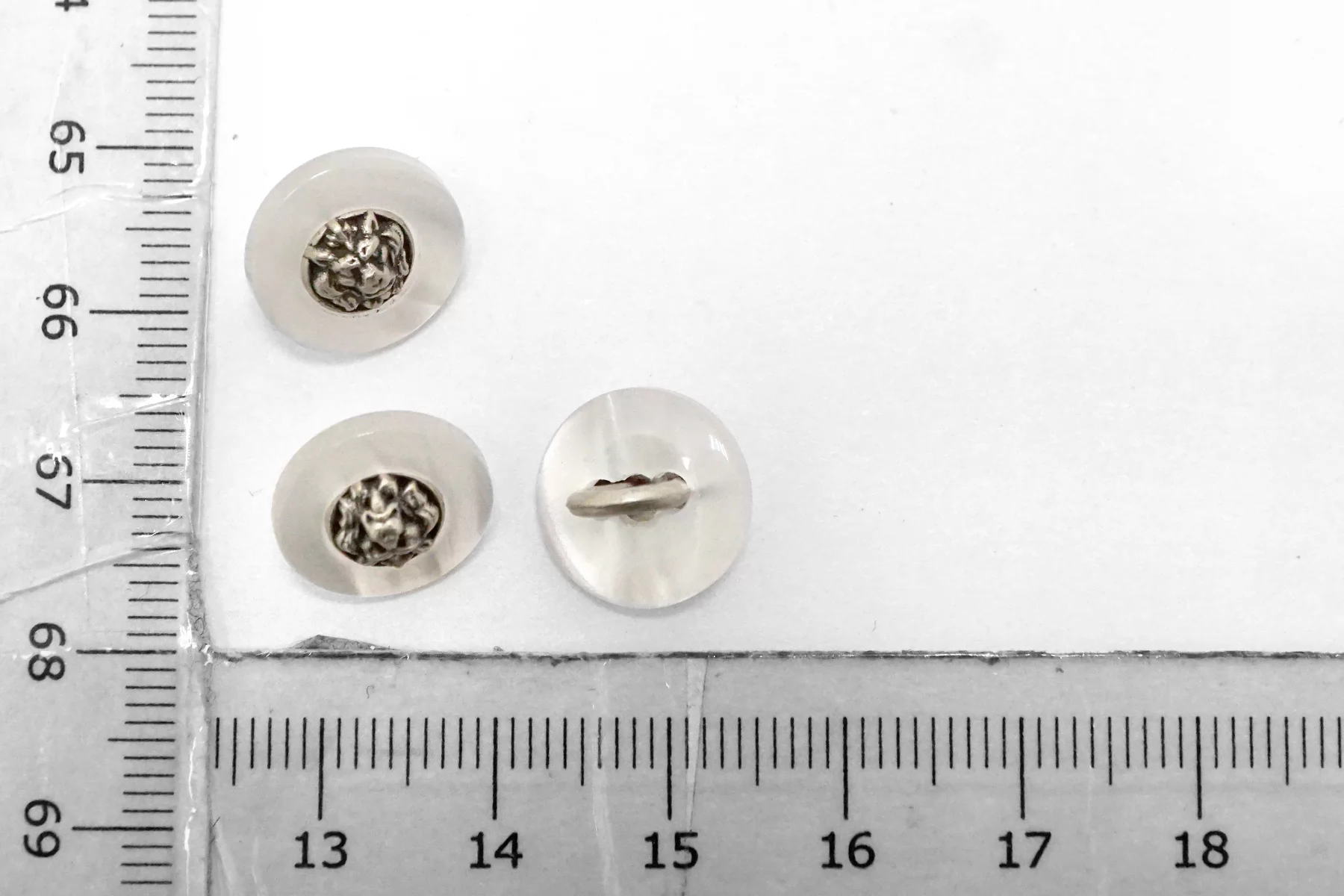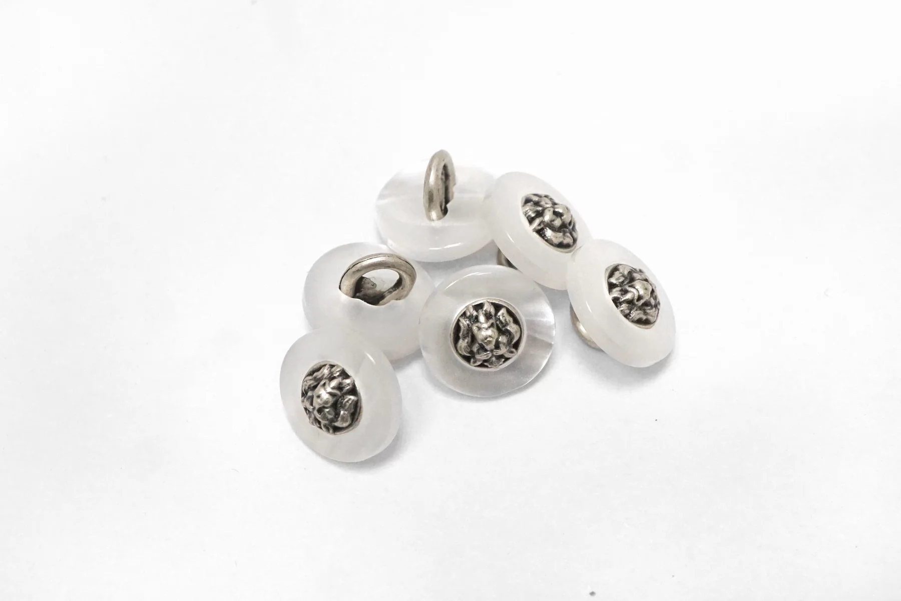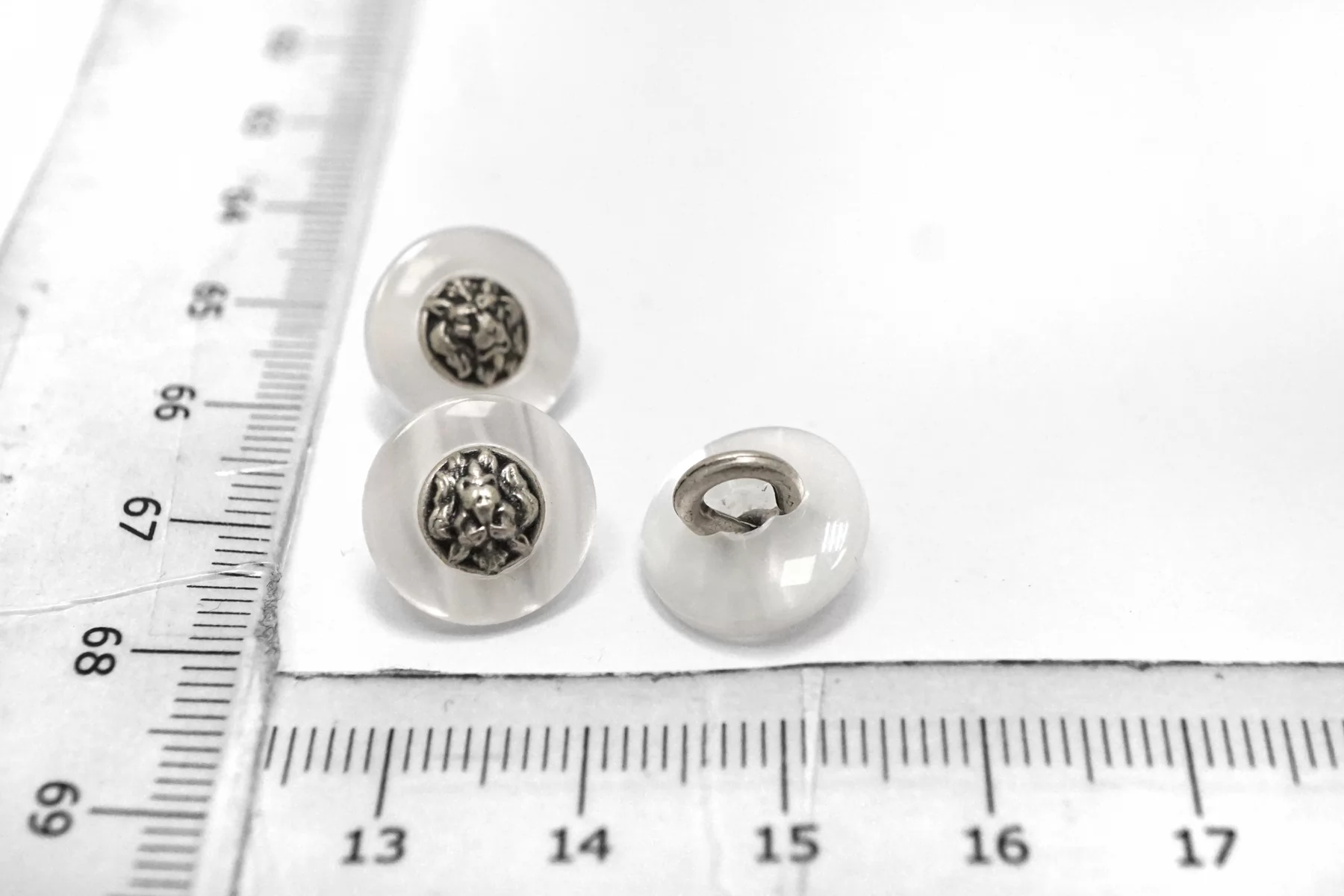 Пуговица пластик на металлической ножке, перламутровая , белого цвета с серебряной вставкой из металла , размер 12 мм.