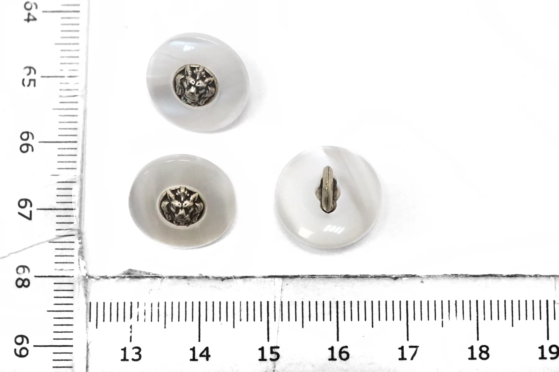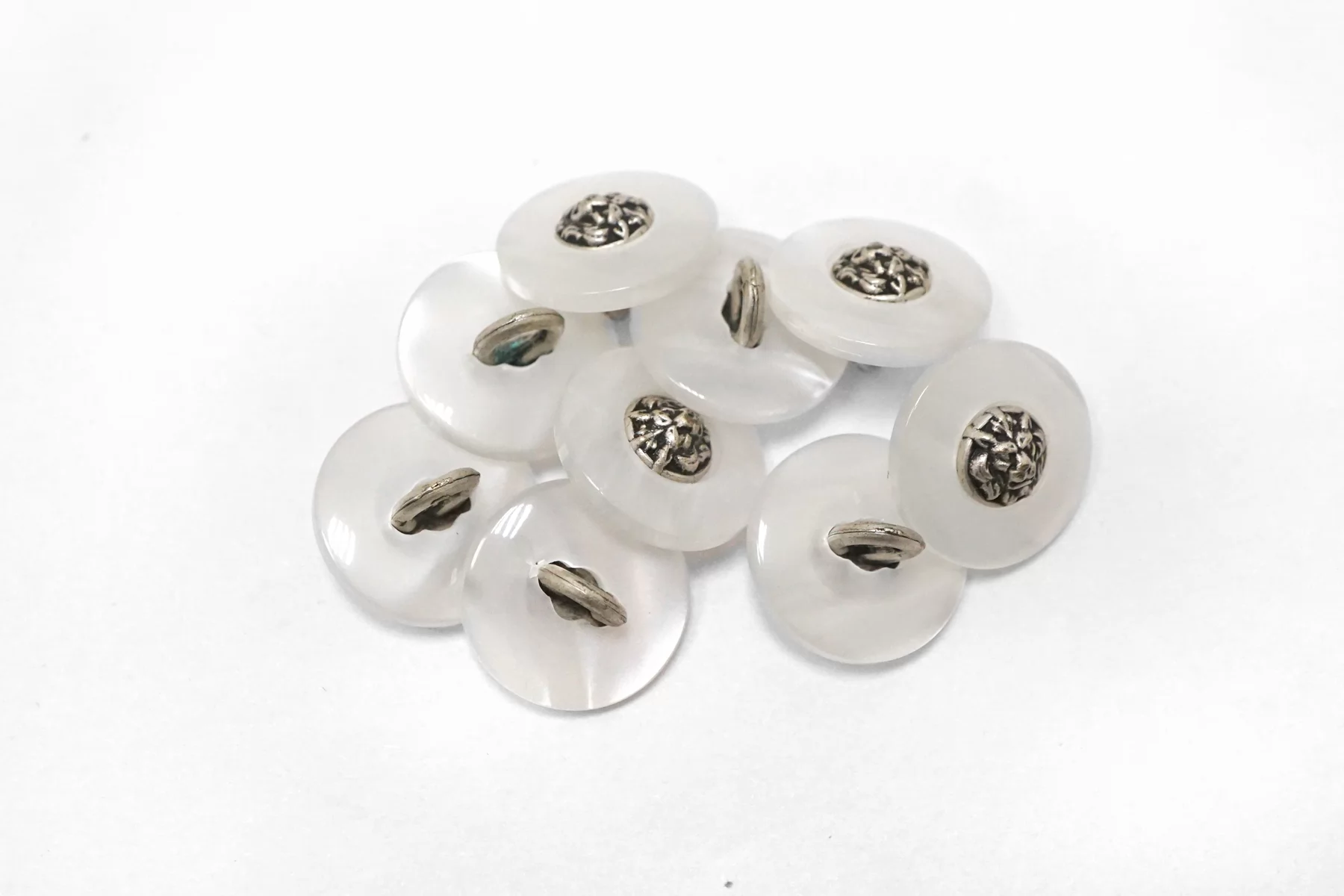 Пуговица пластик на металлической ножке, перламутровая , белого цвета с серебряной вставкой из металла , размер 15 мм.