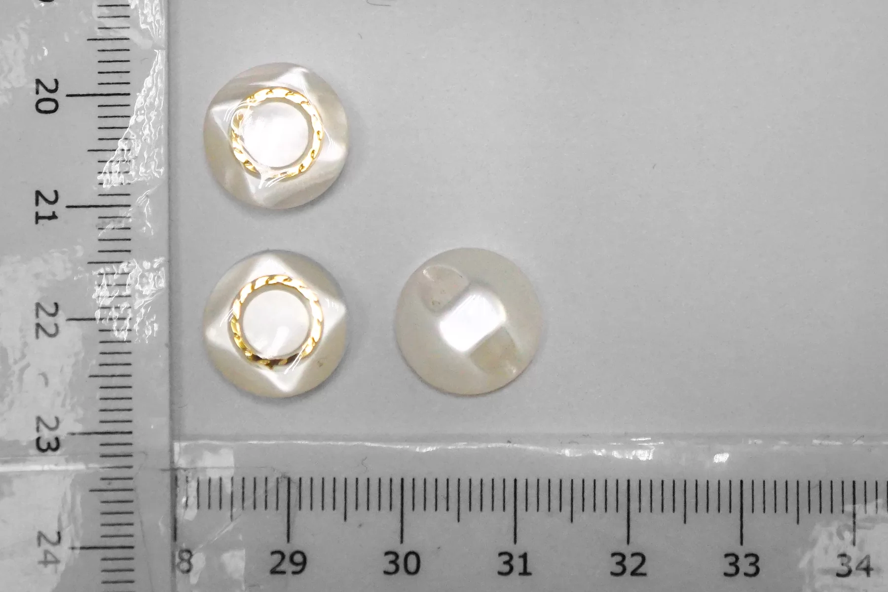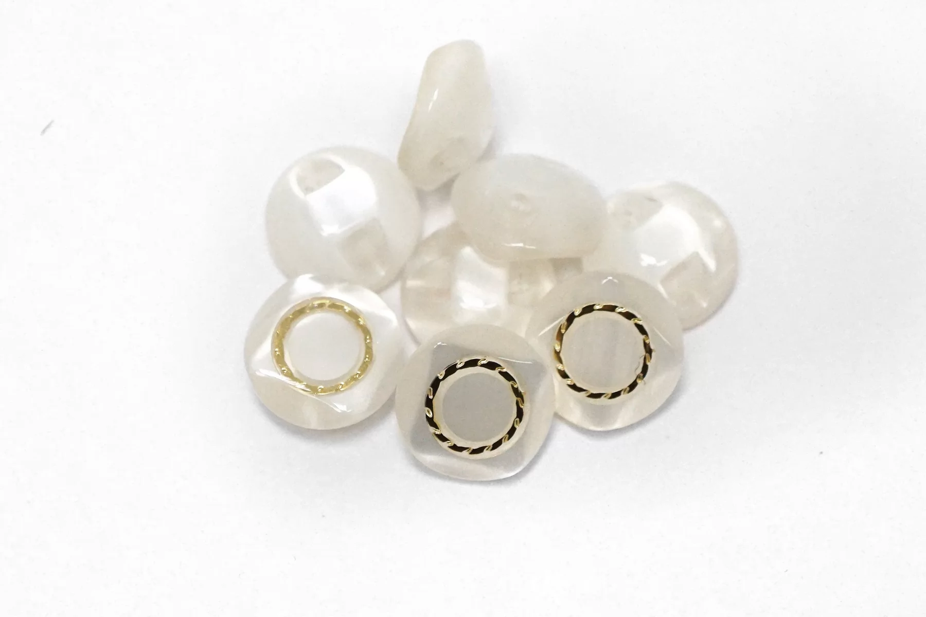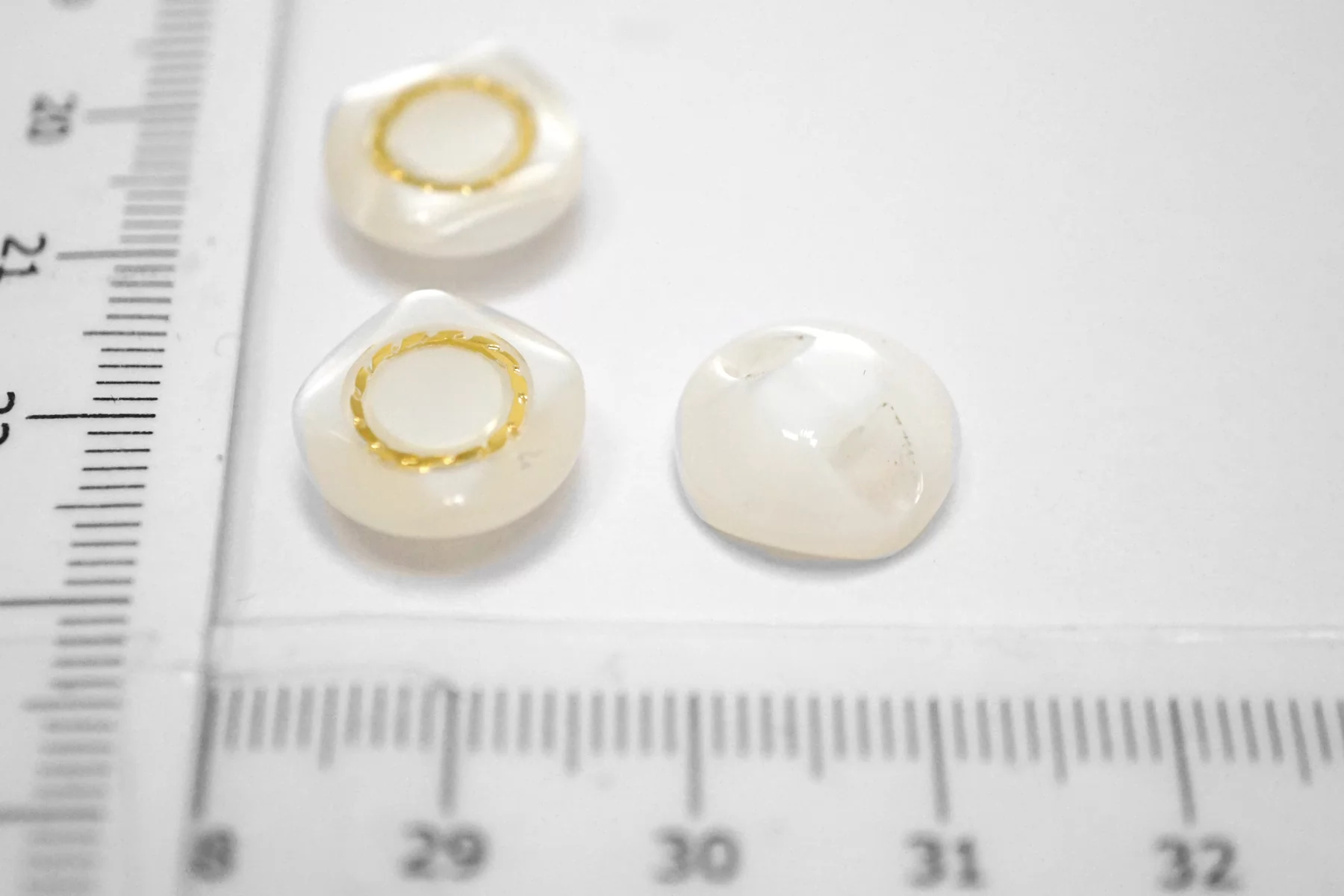 Пуговица пластик на ножке, перламутровая , белого цвета с золотой вставкой из металла , размер 12 мм.