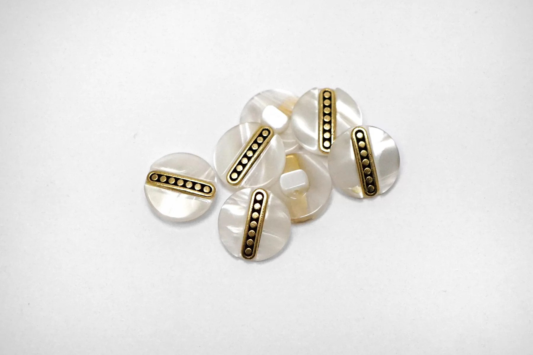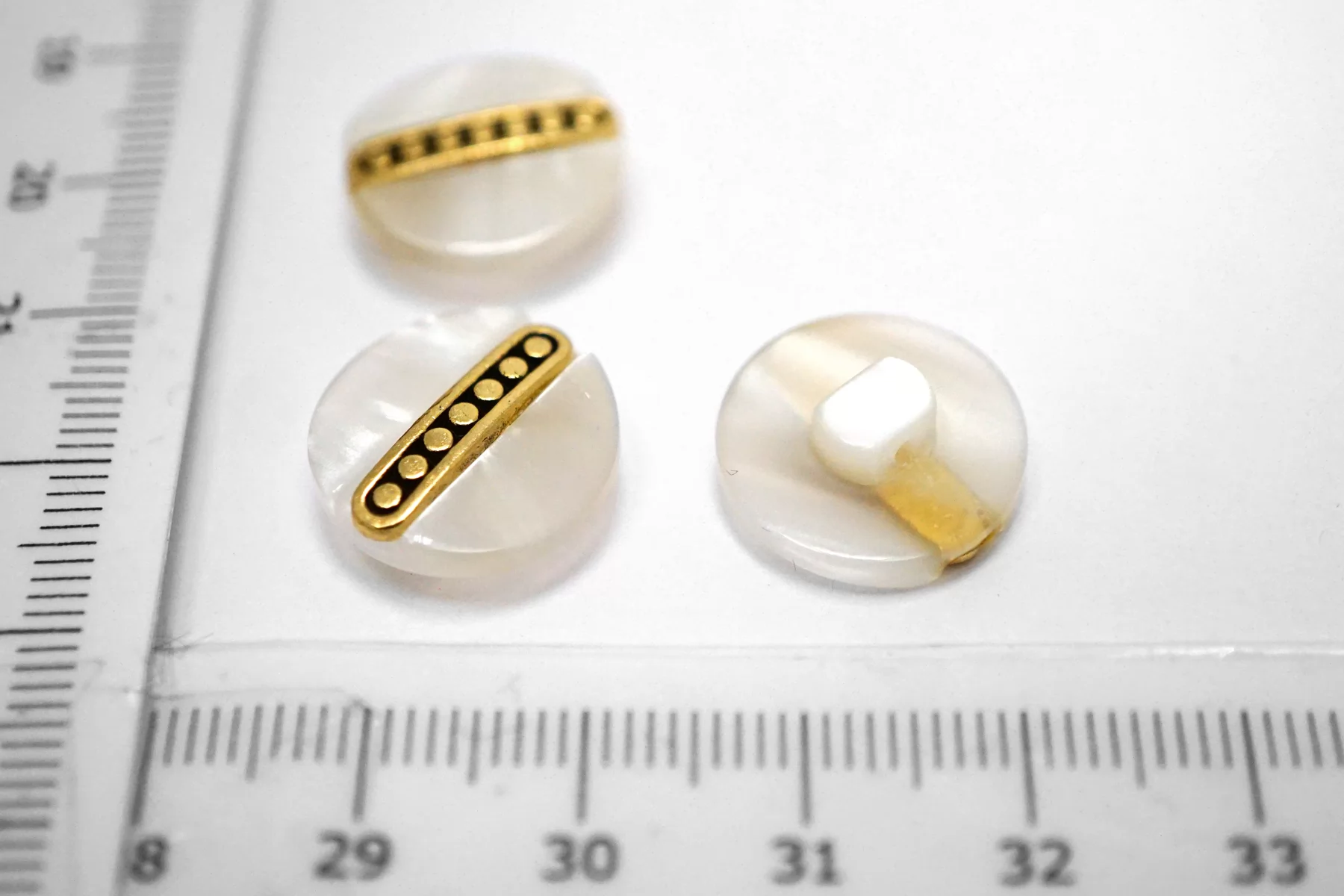 Пуговица пластик на ножке, перламутровая , белого цвета с золотой вставкой из металла , размер 15 мм.
