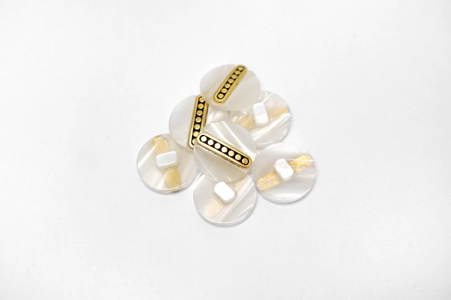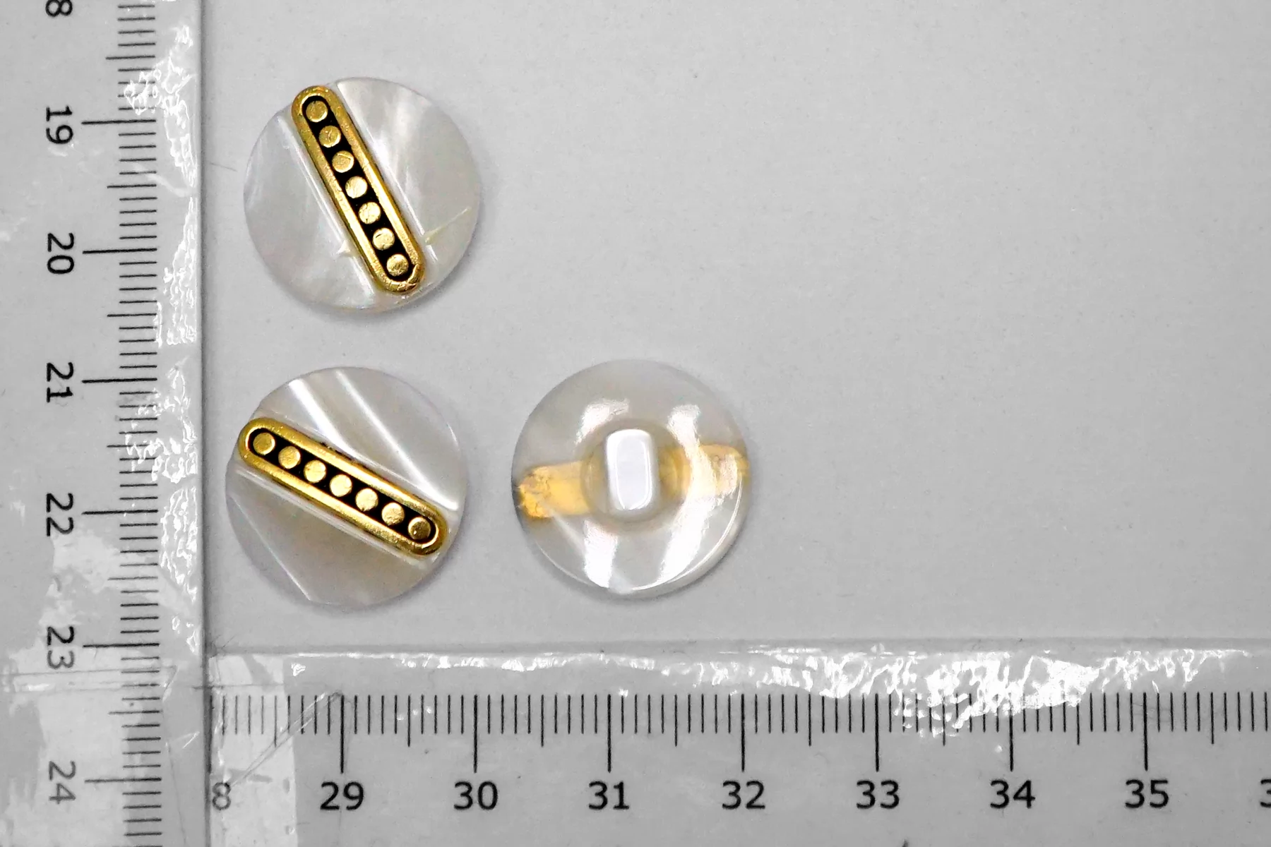 Пуговица пластик на ножке, перламутровая , белого цвета с золотой вставкой из металла , размер 18 мм.