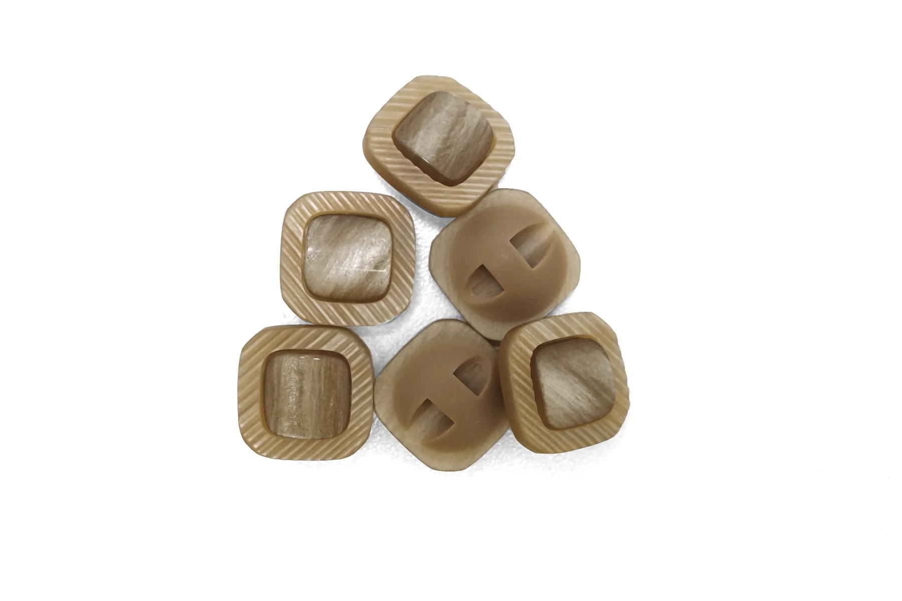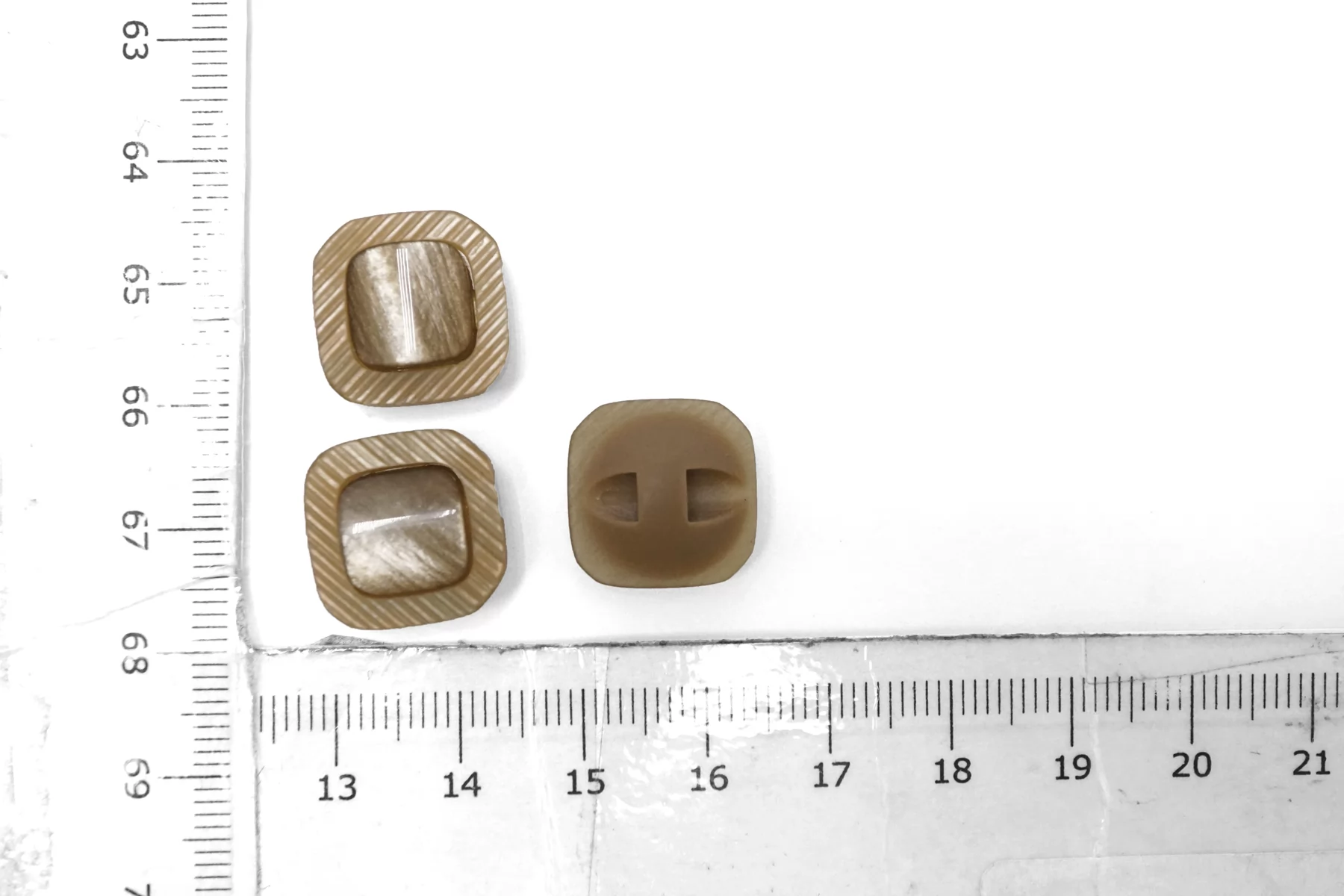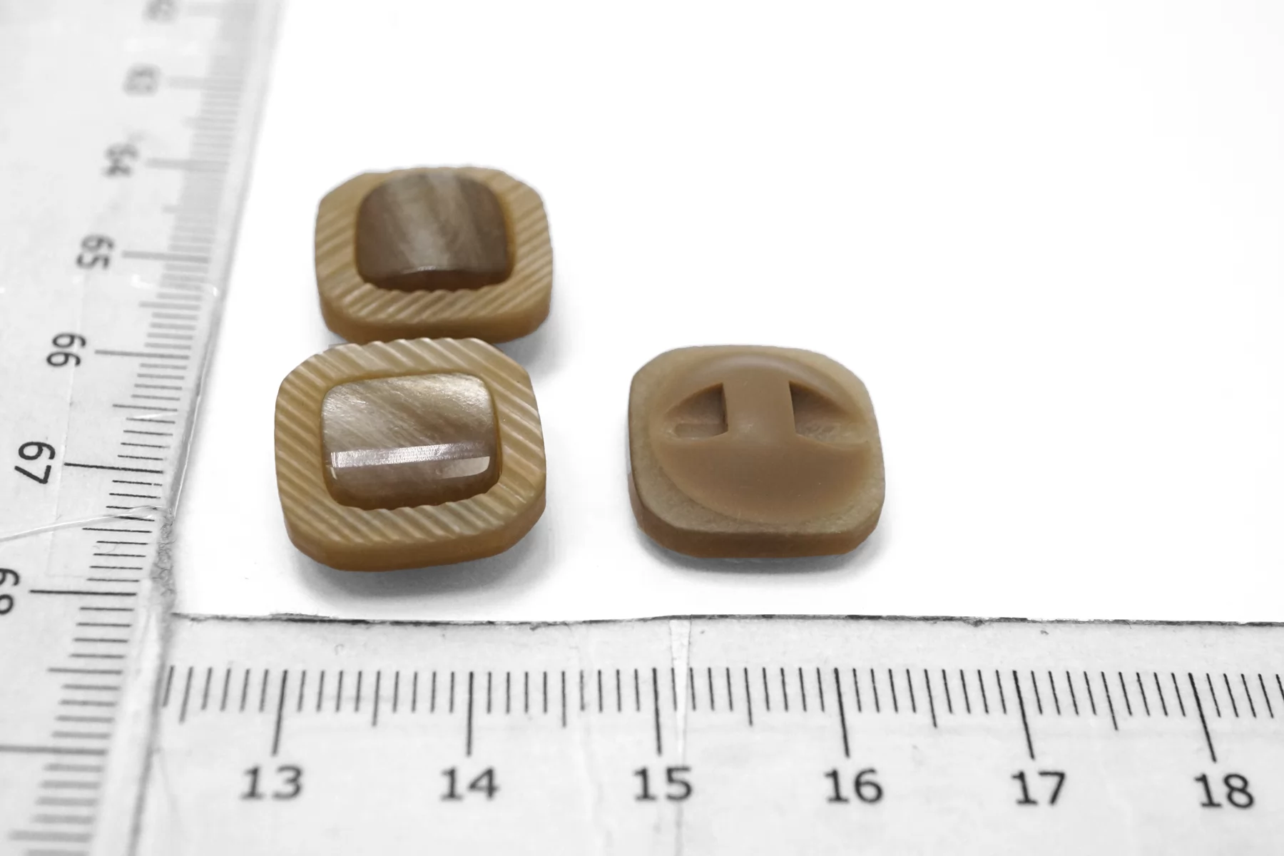 Пуговица пластиковая квадратная на ножке , бежевого цвета с перламутровой вставкой , размер 15 мм.