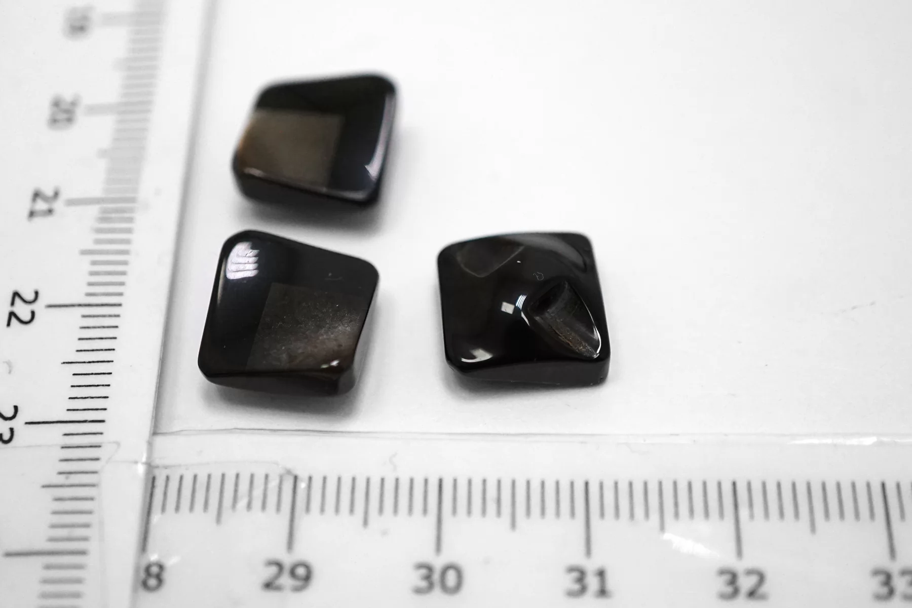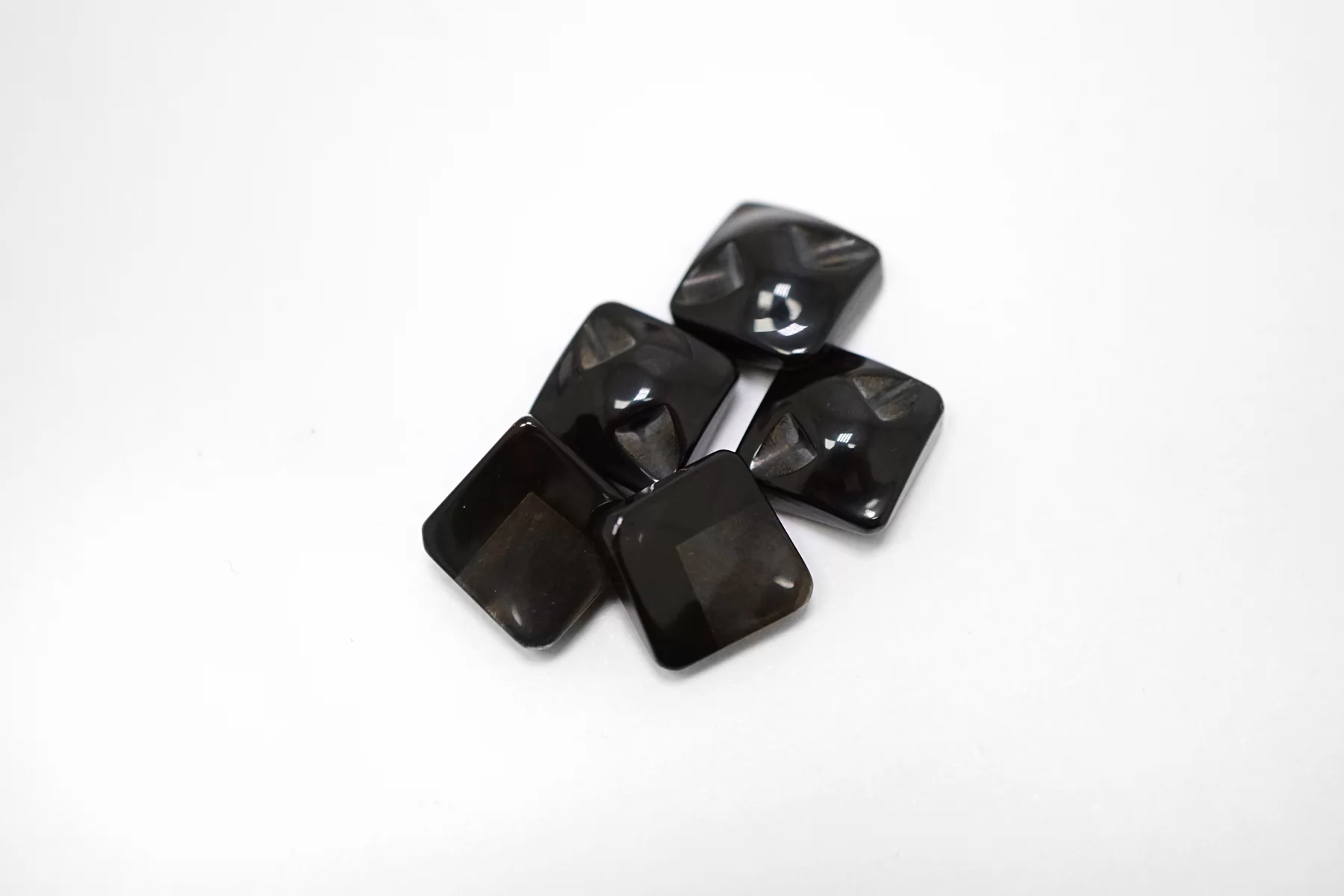 Пластиковая пуговица квадратная , черного цвета на ножке с перламутровой коричневой вставкой . Размер 12 мм .