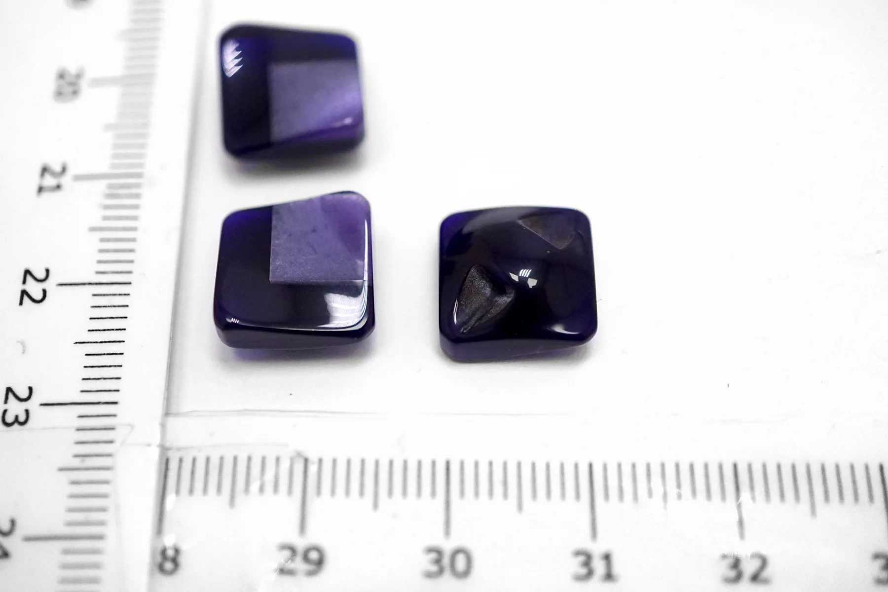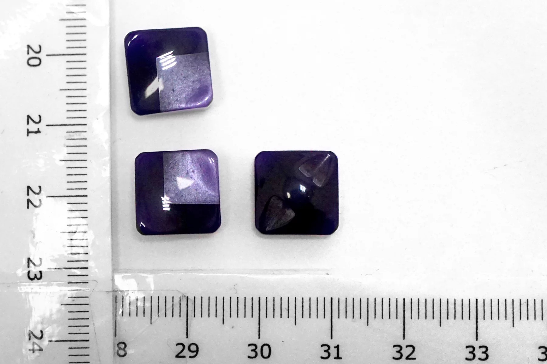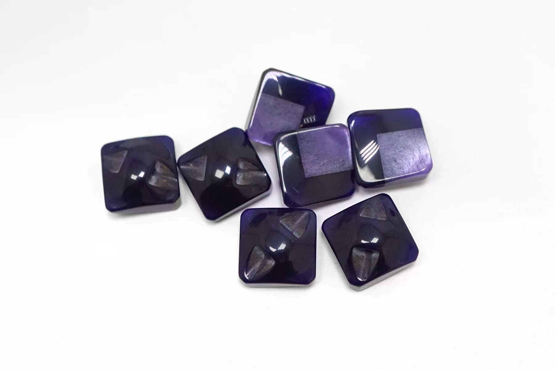 Пластиковая пуговица квадратная , фиолетового цвета на ножке с перламутровой вставкой . Размер 12 мм .