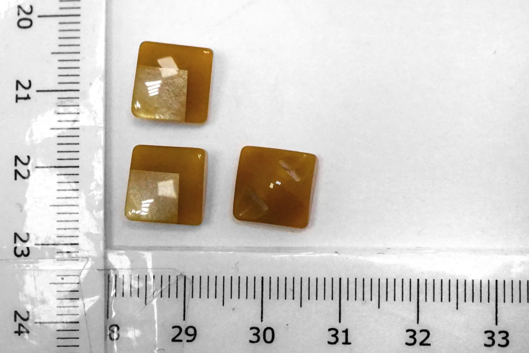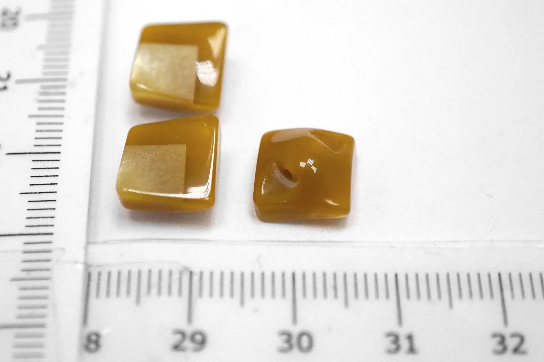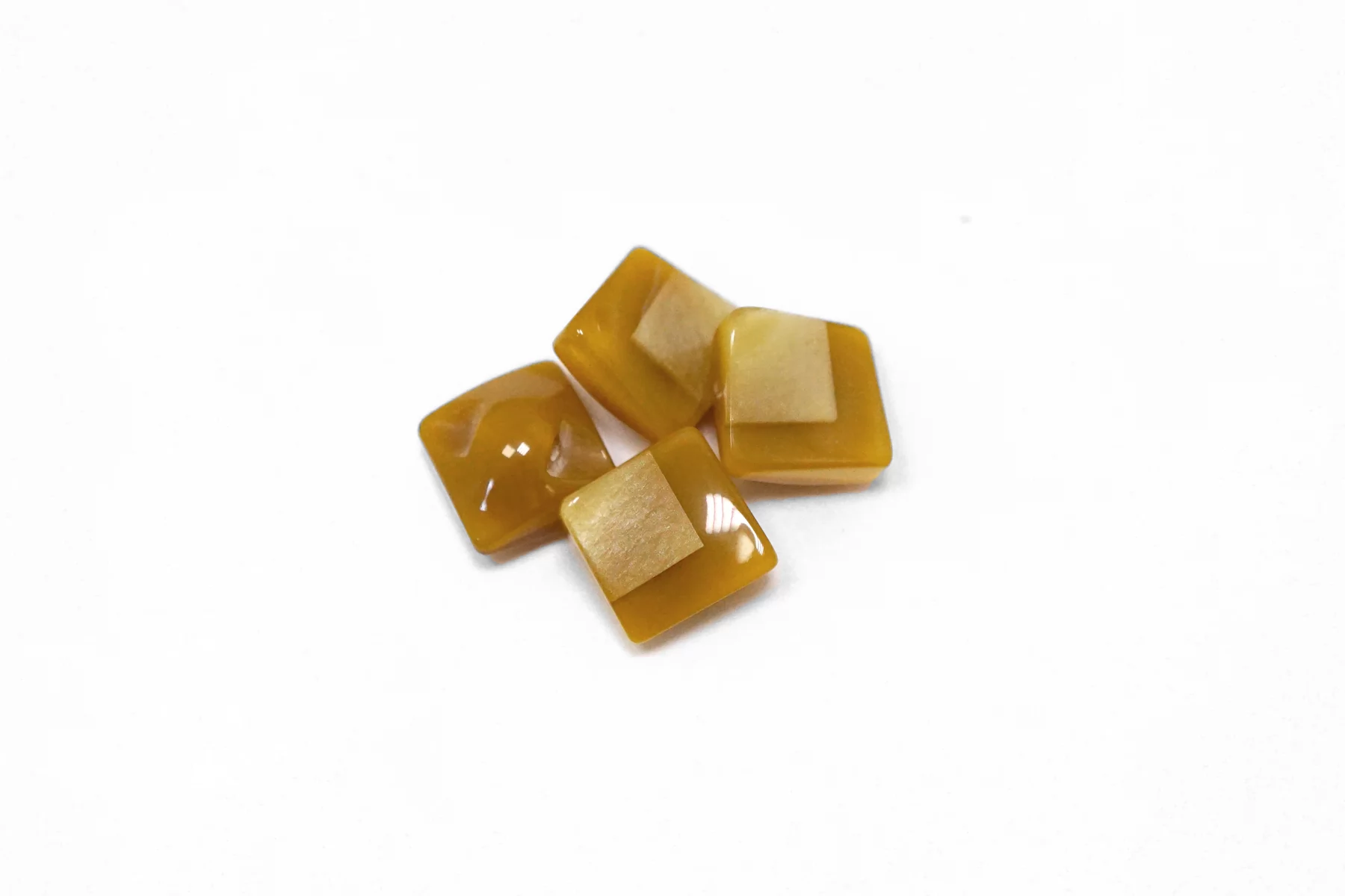 Пластиковая пуговица квадратная , горчичного цвета на ножке с перламутровой вставкой . Размер 10 мм .