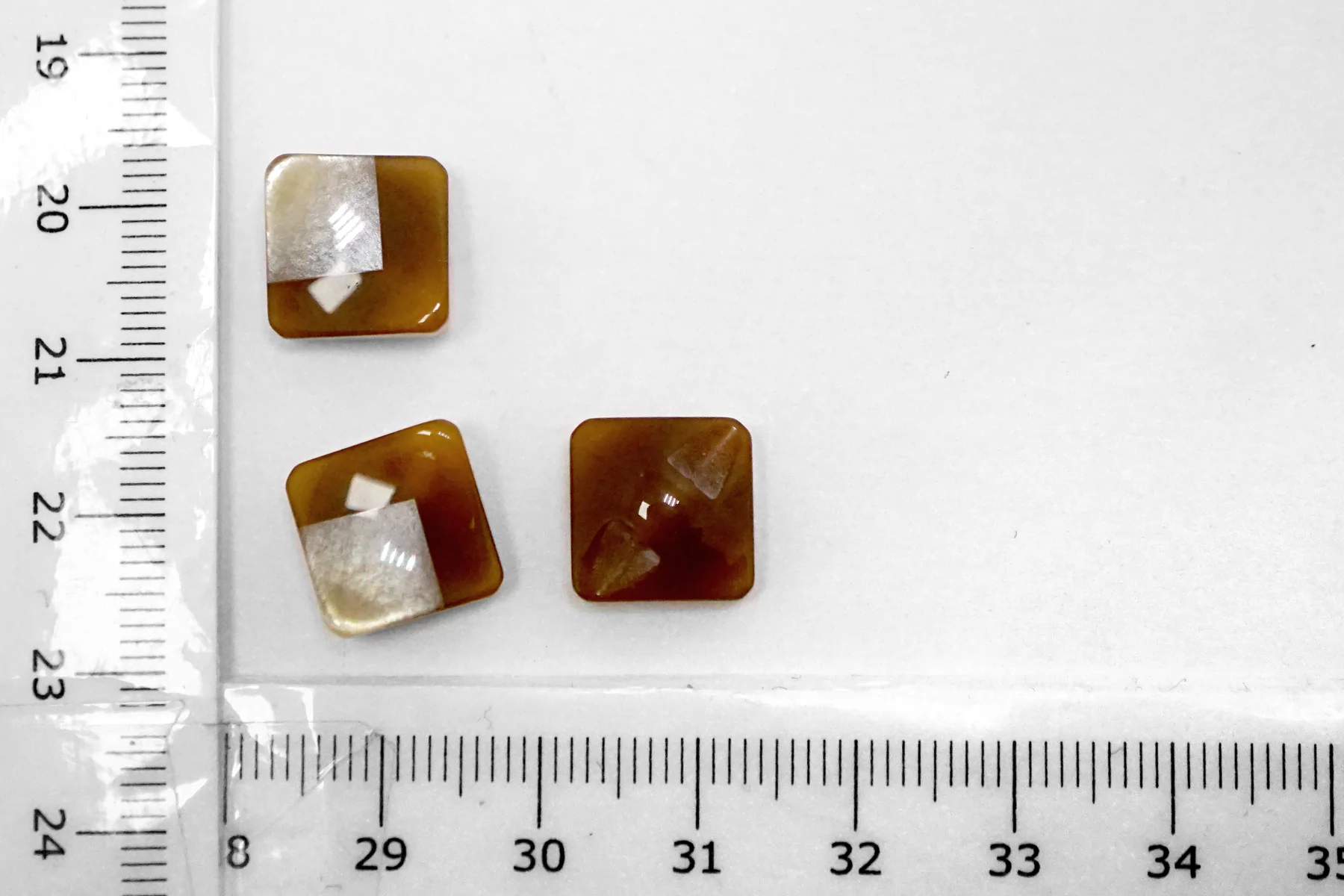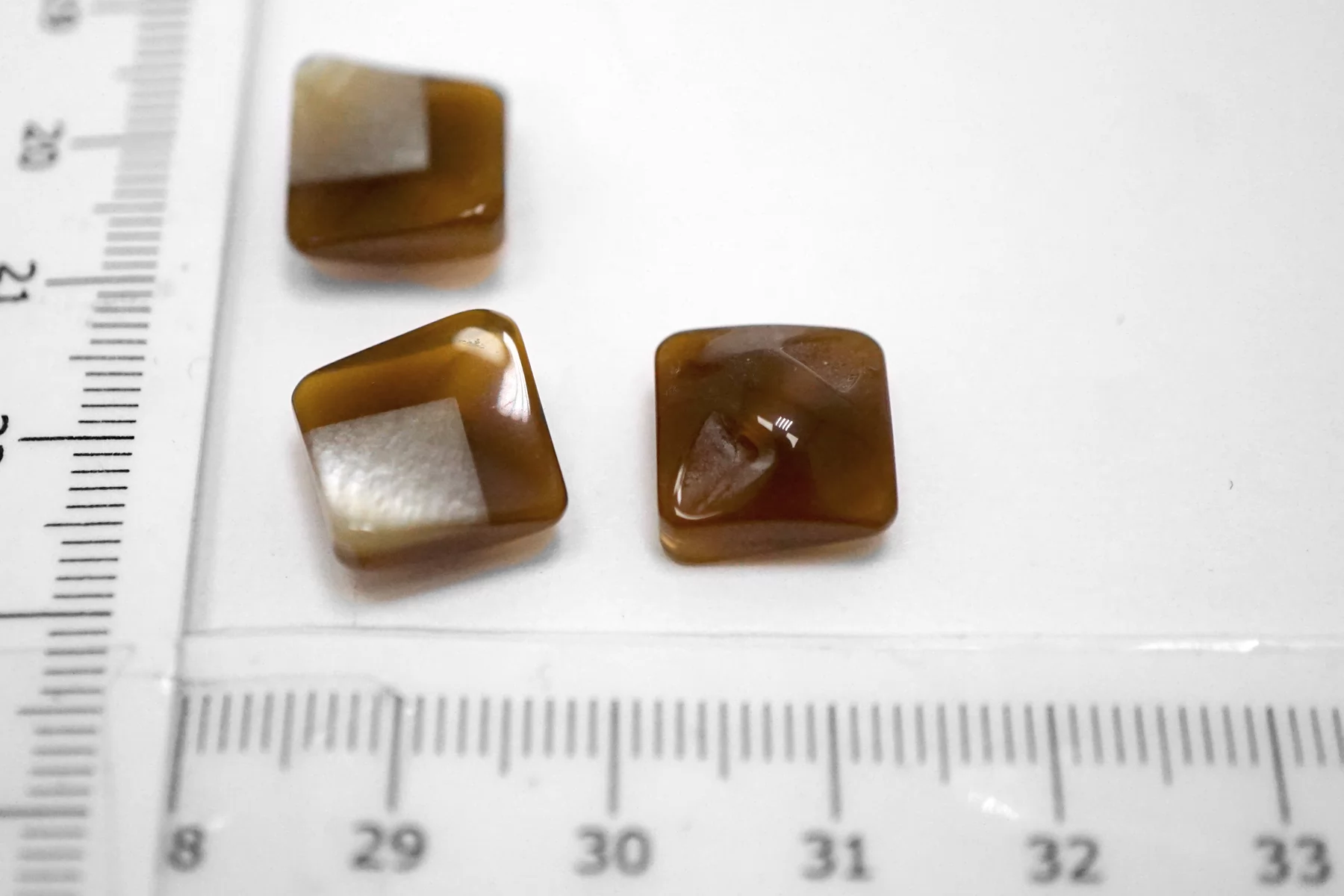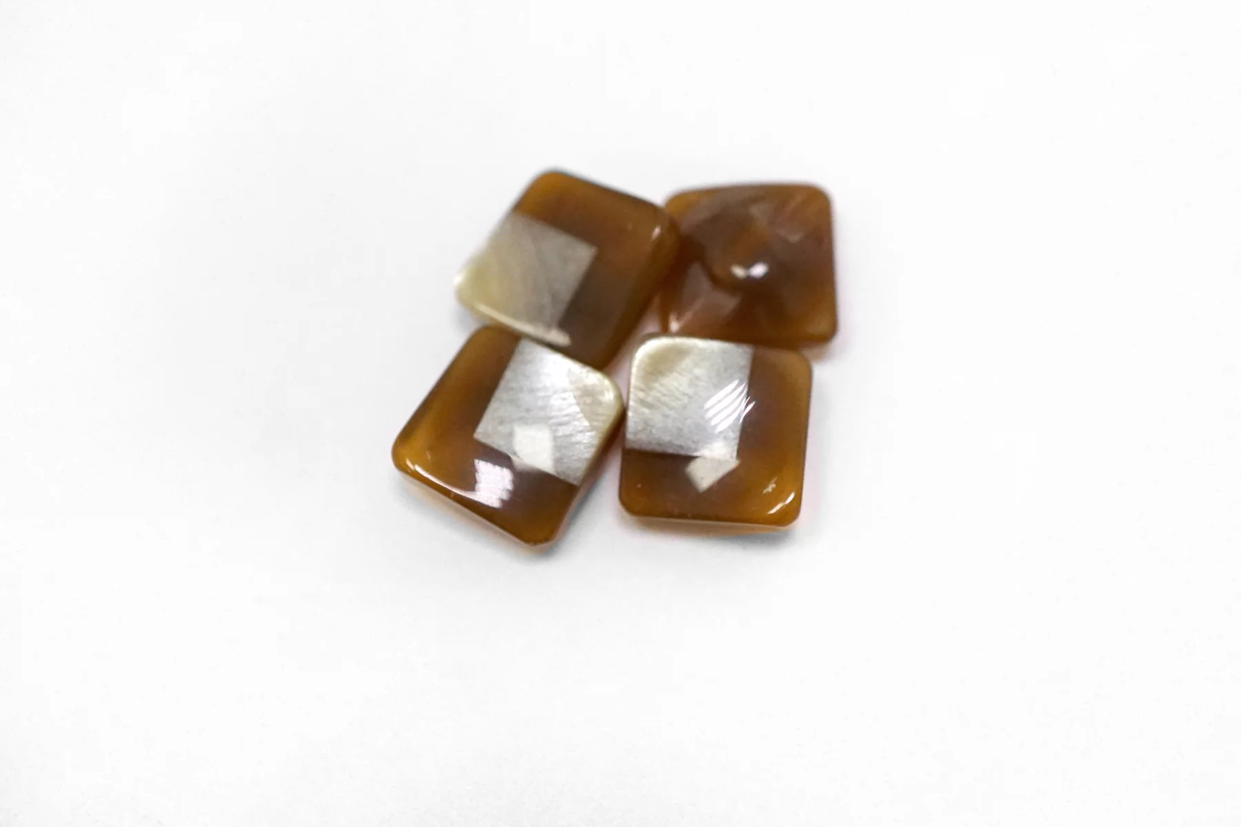 Пластиковая пуговица квадратная , коричневого цвета на ножке с перламутровой вставкой . Размер 12 мм .