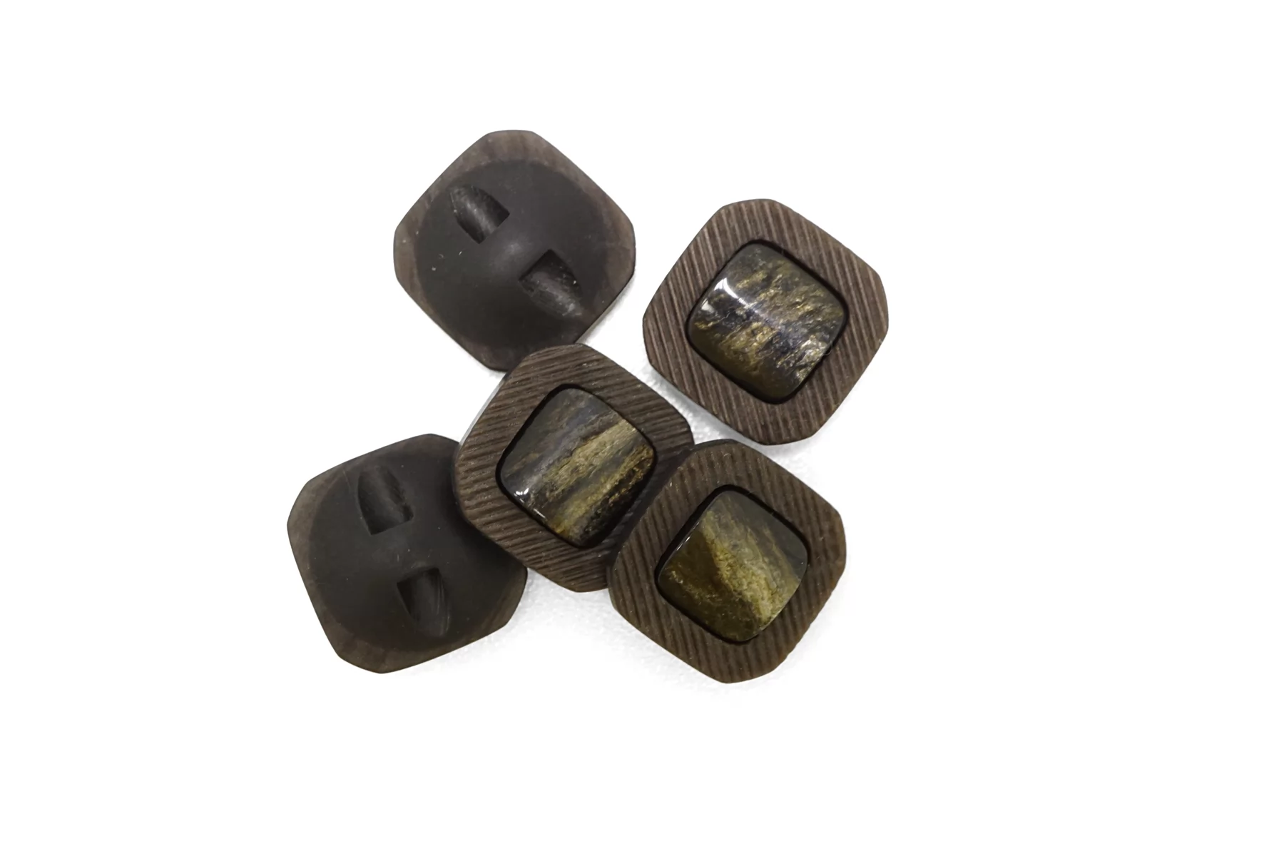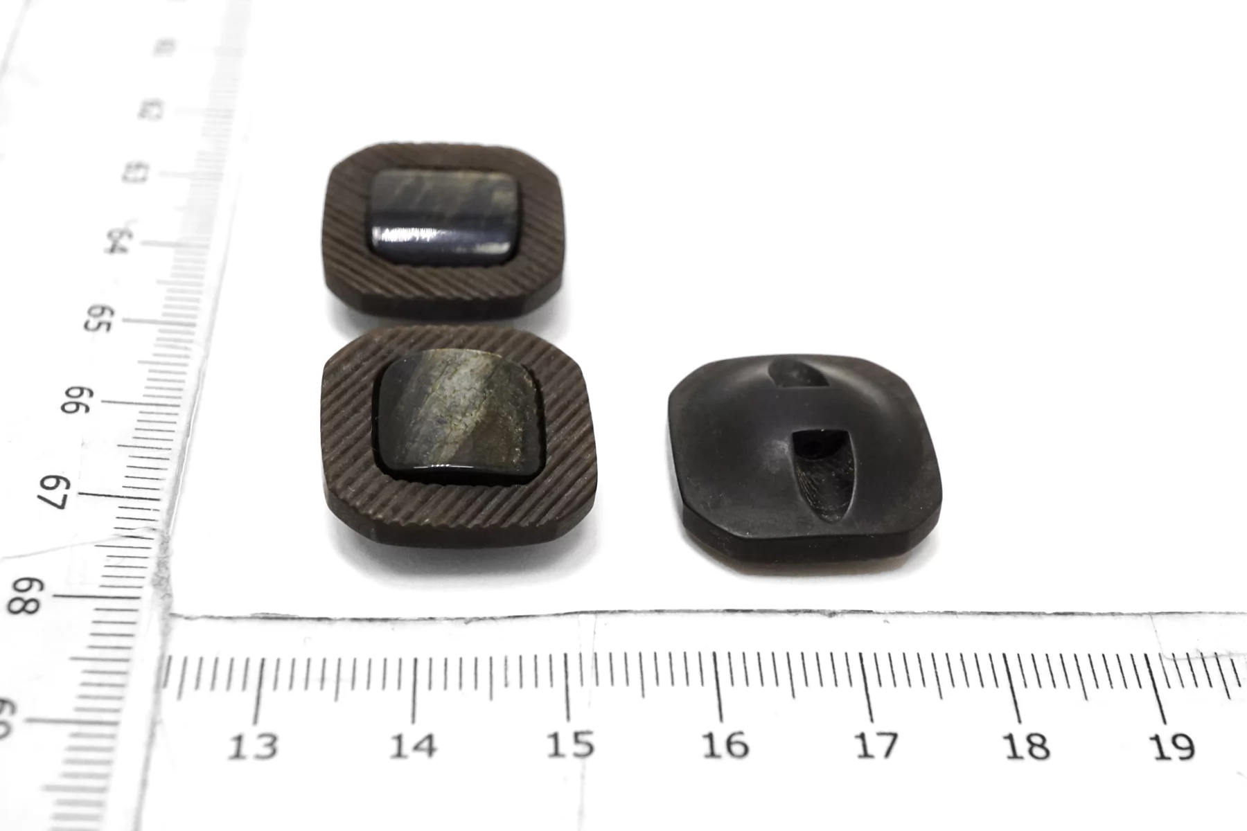 Пуговица пластиковая квадратная на ножке , коричневого цвета с перламутровой вставкой , размер 20 мм.