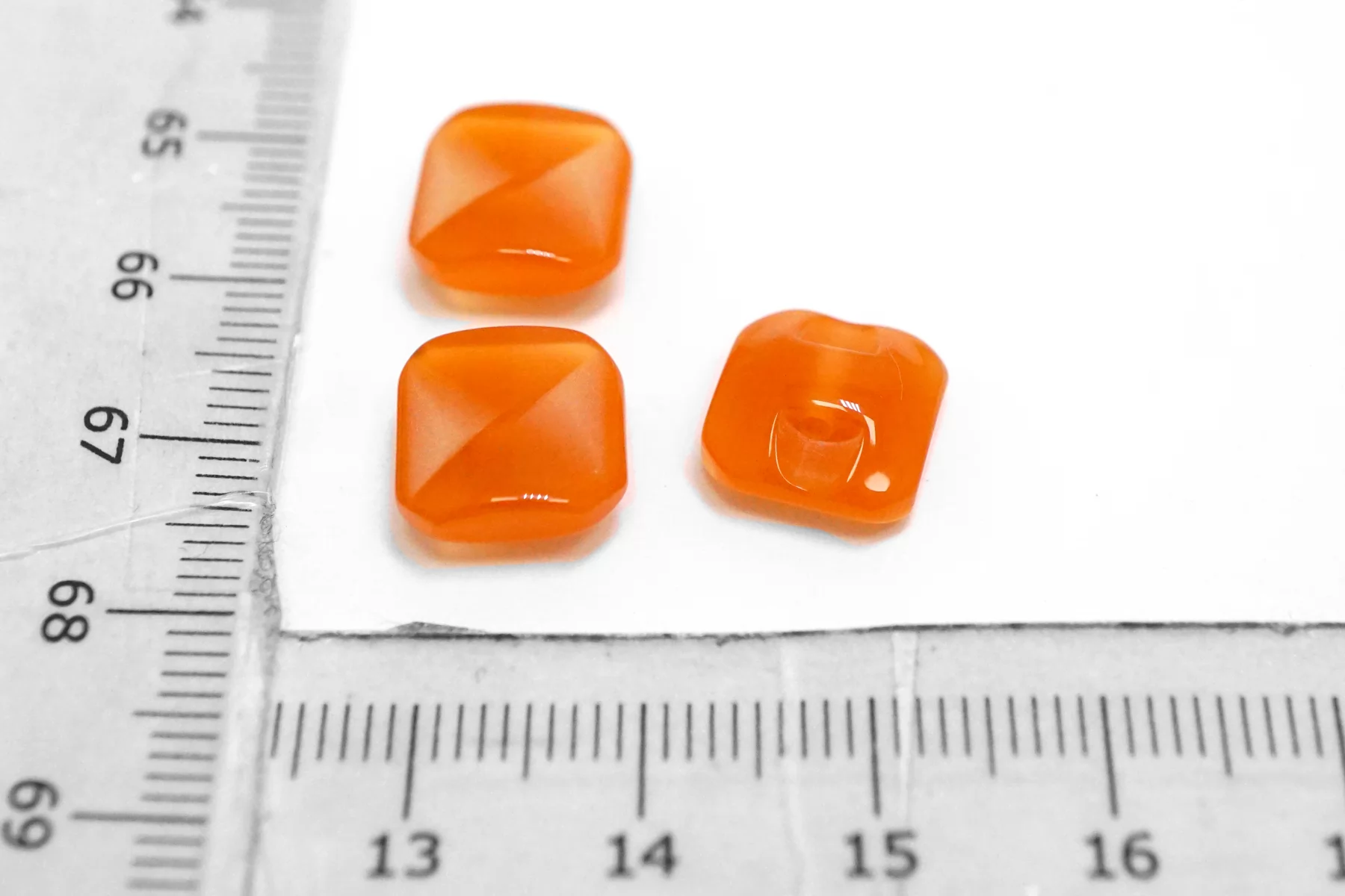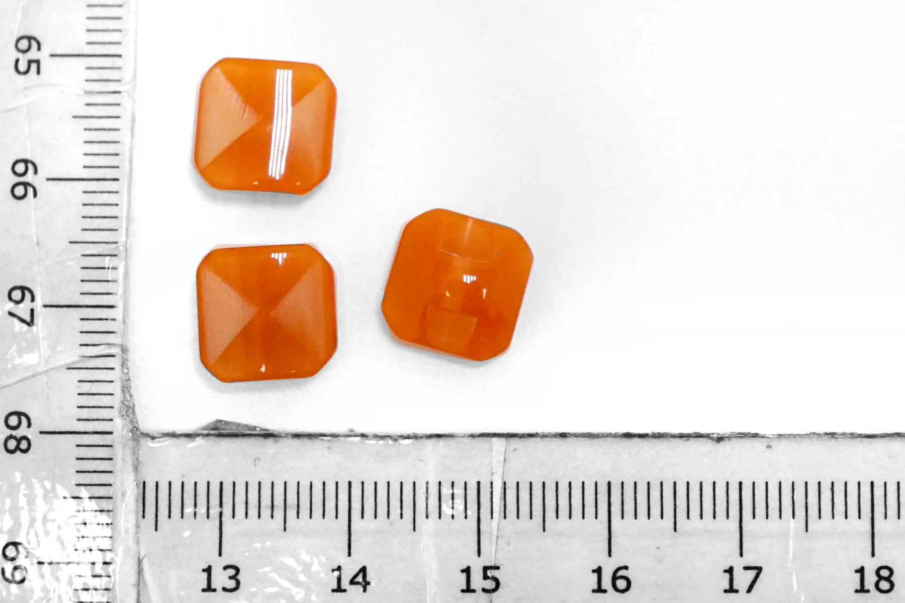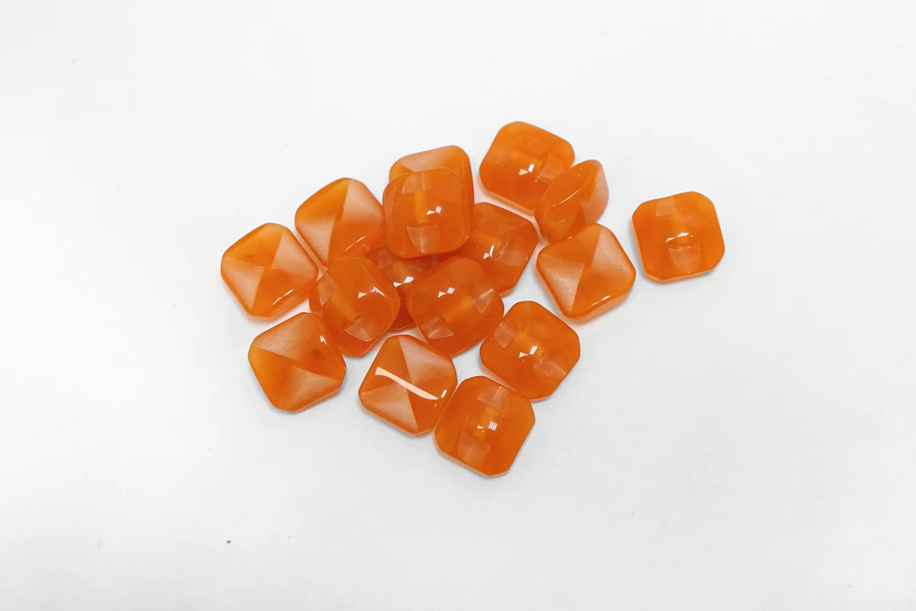 Пластиковая пуговица квадратная , оранжевого цвета на ножке. Размер 10 мм .