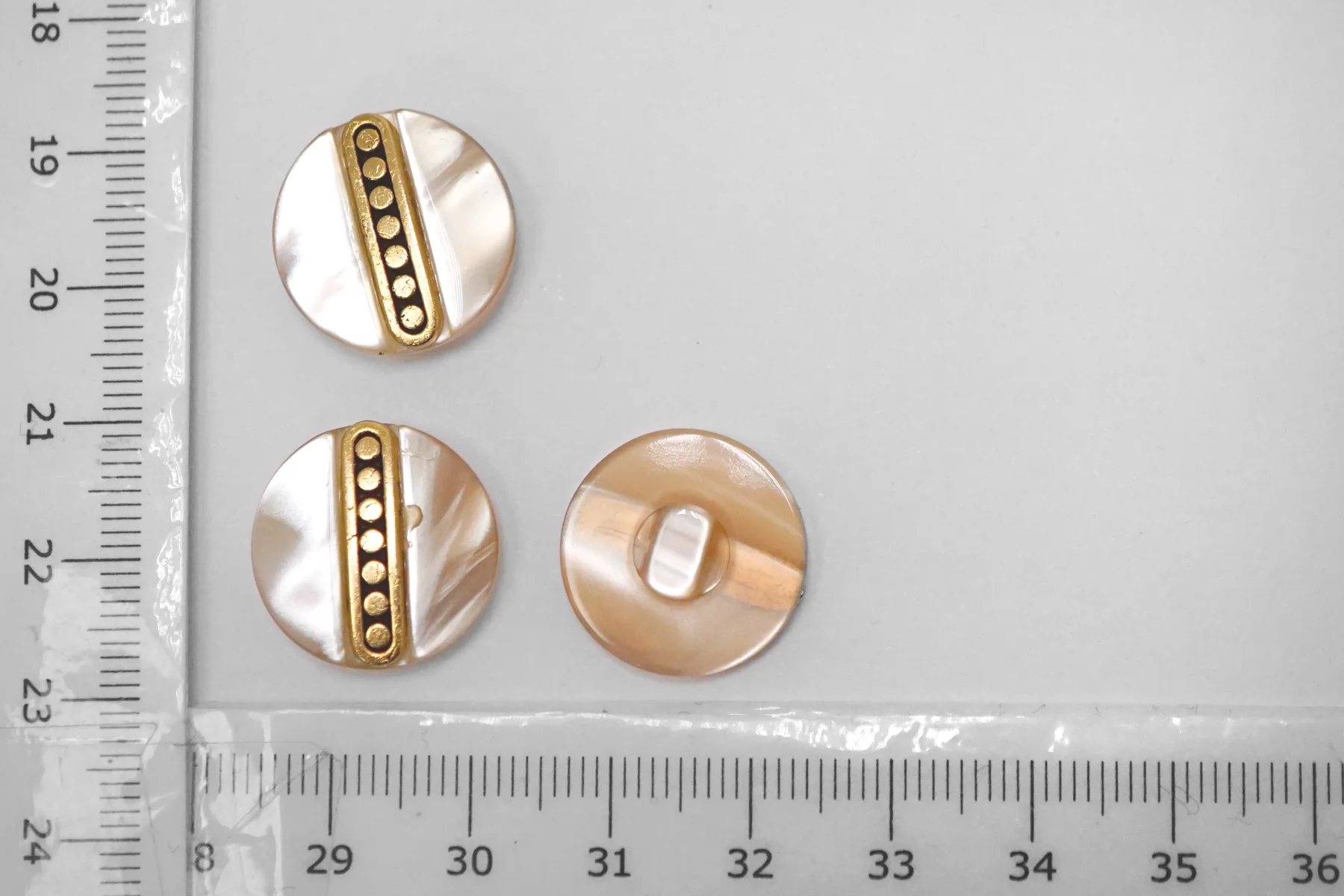 Пуговица пластик на ножке, перламутровая , персикового цвета с золотой вставкой из металла , размер 15 мм.