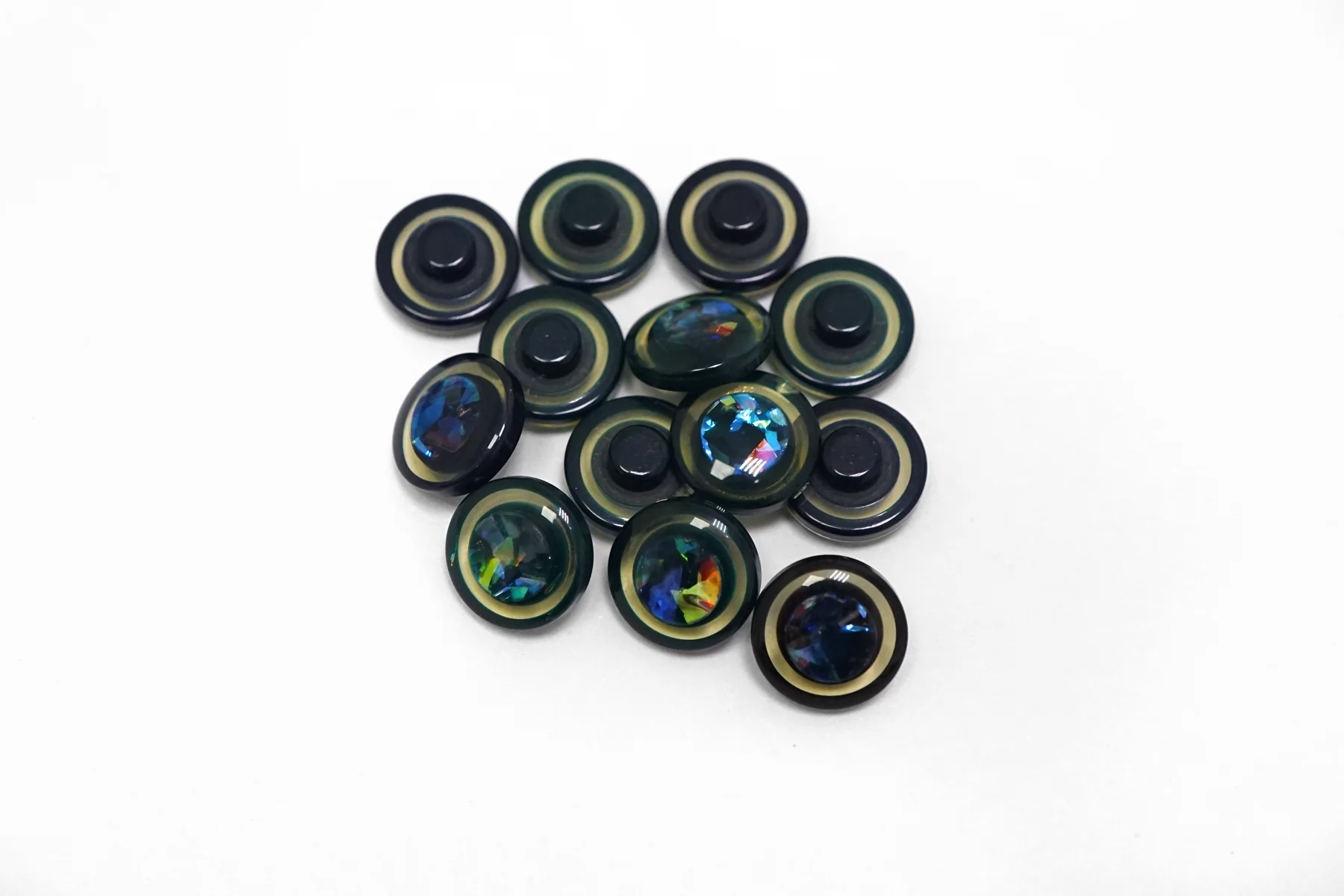 Пуговица на ножке из темного пластика с разноцветными вкраплениями . Размер 11 мм .