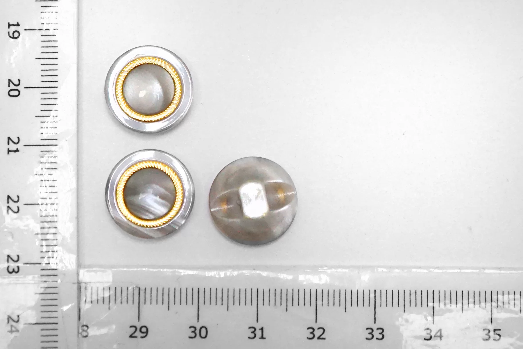 Пуговица пластик на ножке, перламутровая , серого цвета с золотой вставкой из металла , размер 15 мм.