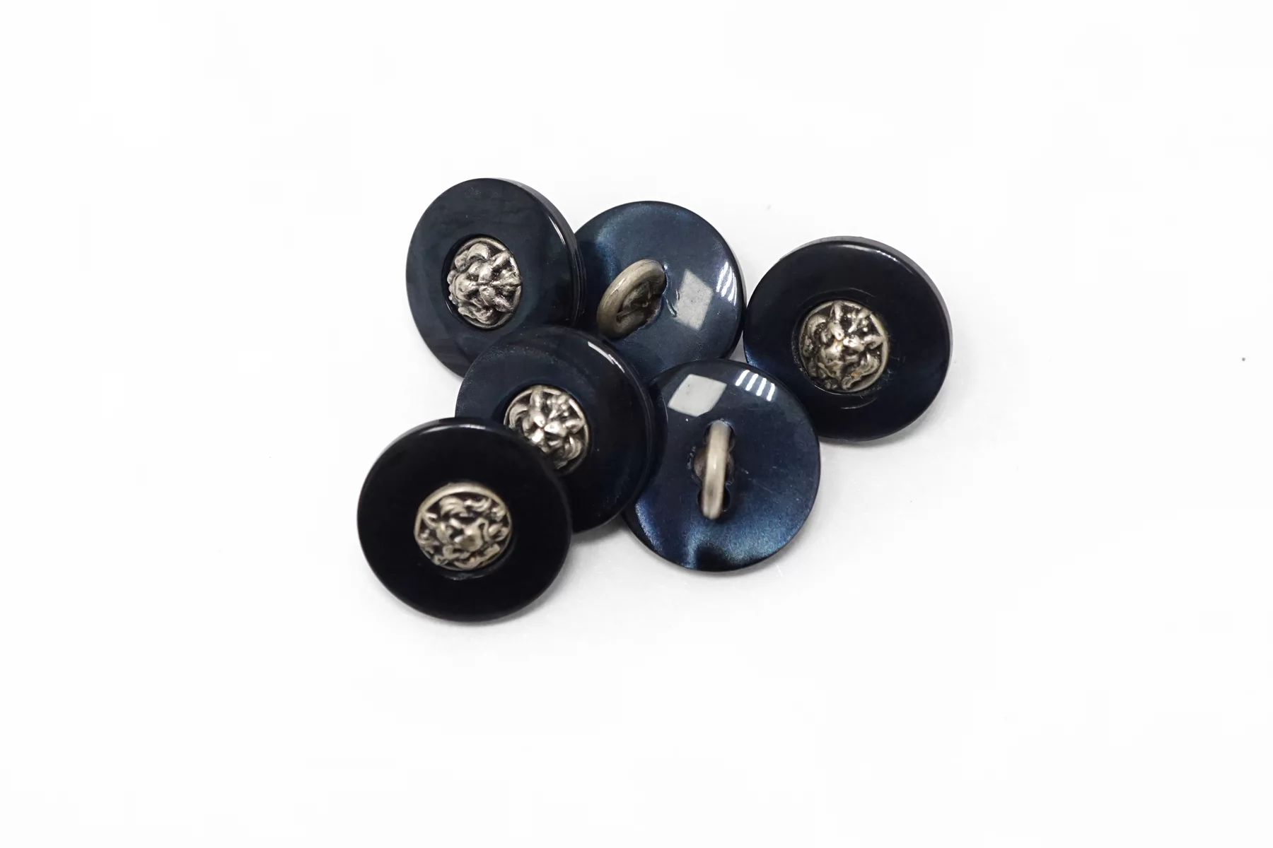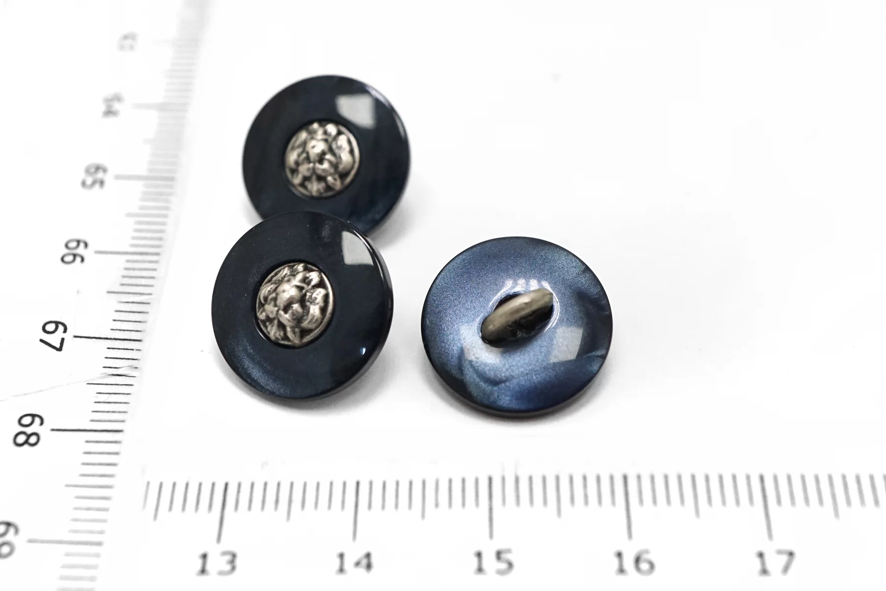 Пуговица пластик на металлической ножке, перламутровая ,синего цвета с серебряной вставкой из металла , размер 15 мм.