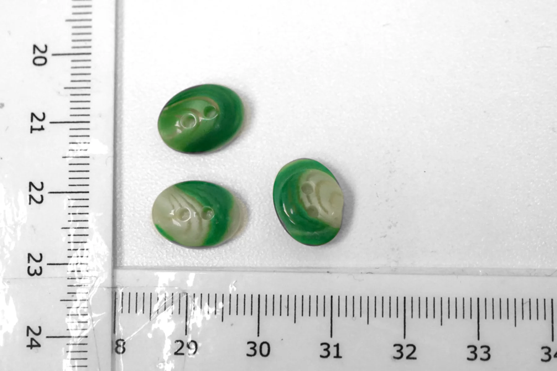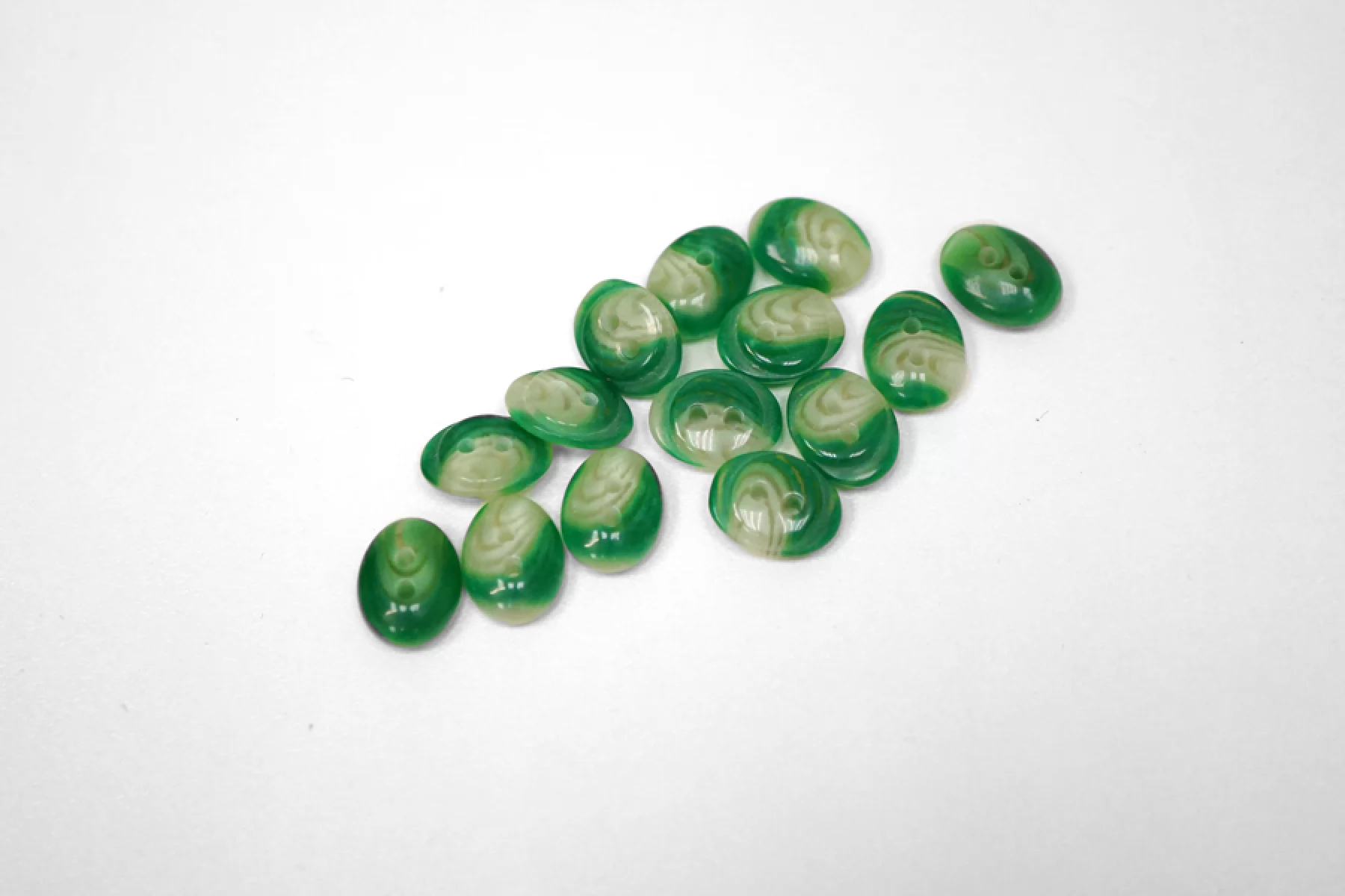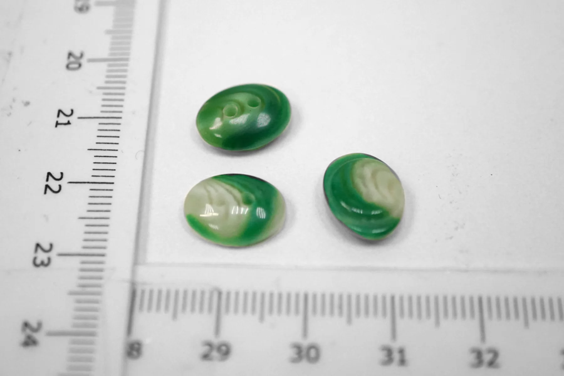 Пуговица пластиковая зелёного цвета в разводах , размер 12 мм.