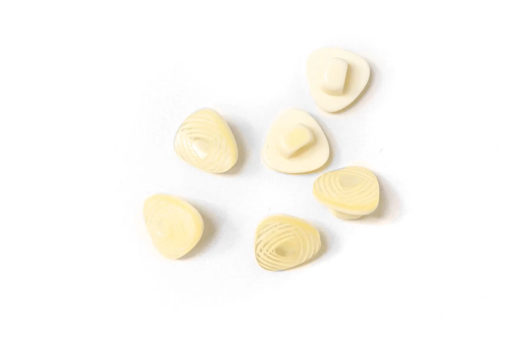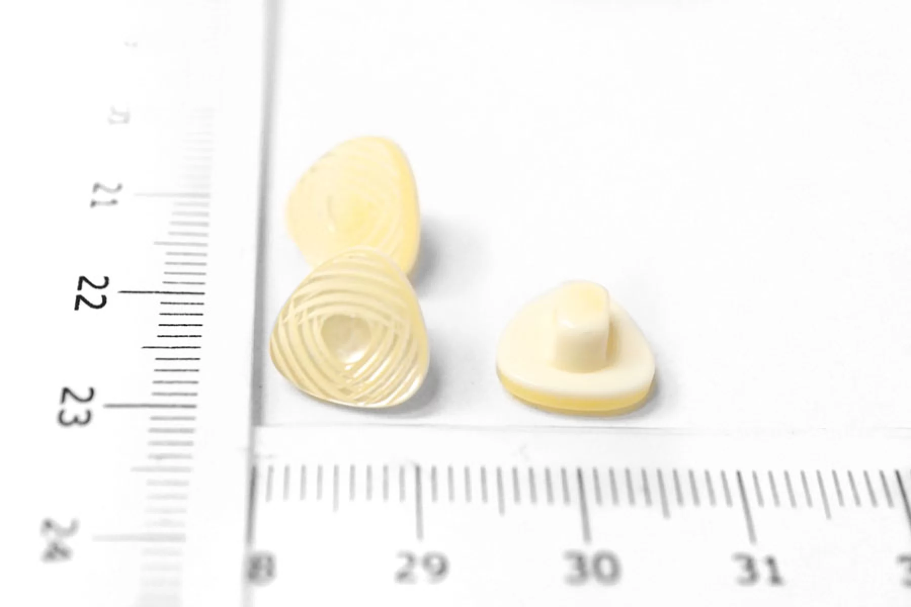 Пуговица на ножке плательная из пластика, бледно-желтого оттенка треугольной формы с закругленными углами, красиво переливается. С кругленькой вставкой в середине которая переливается приятным блеском. Диаметр - 10 мм.