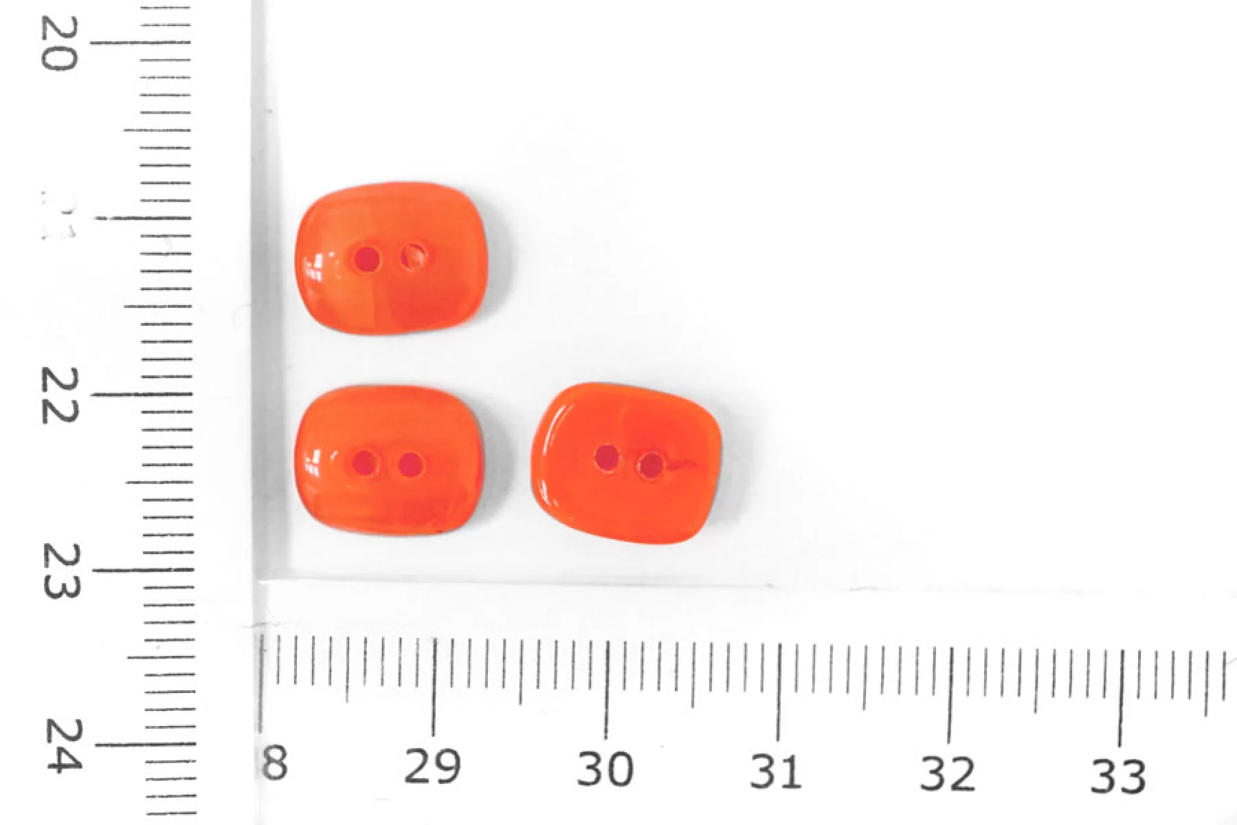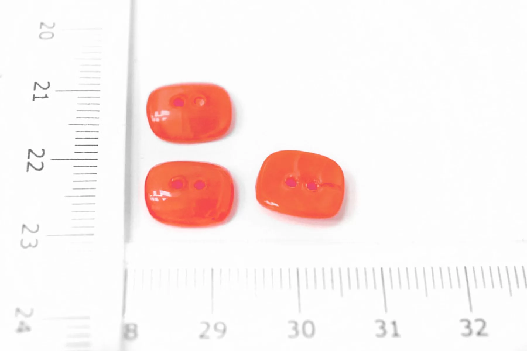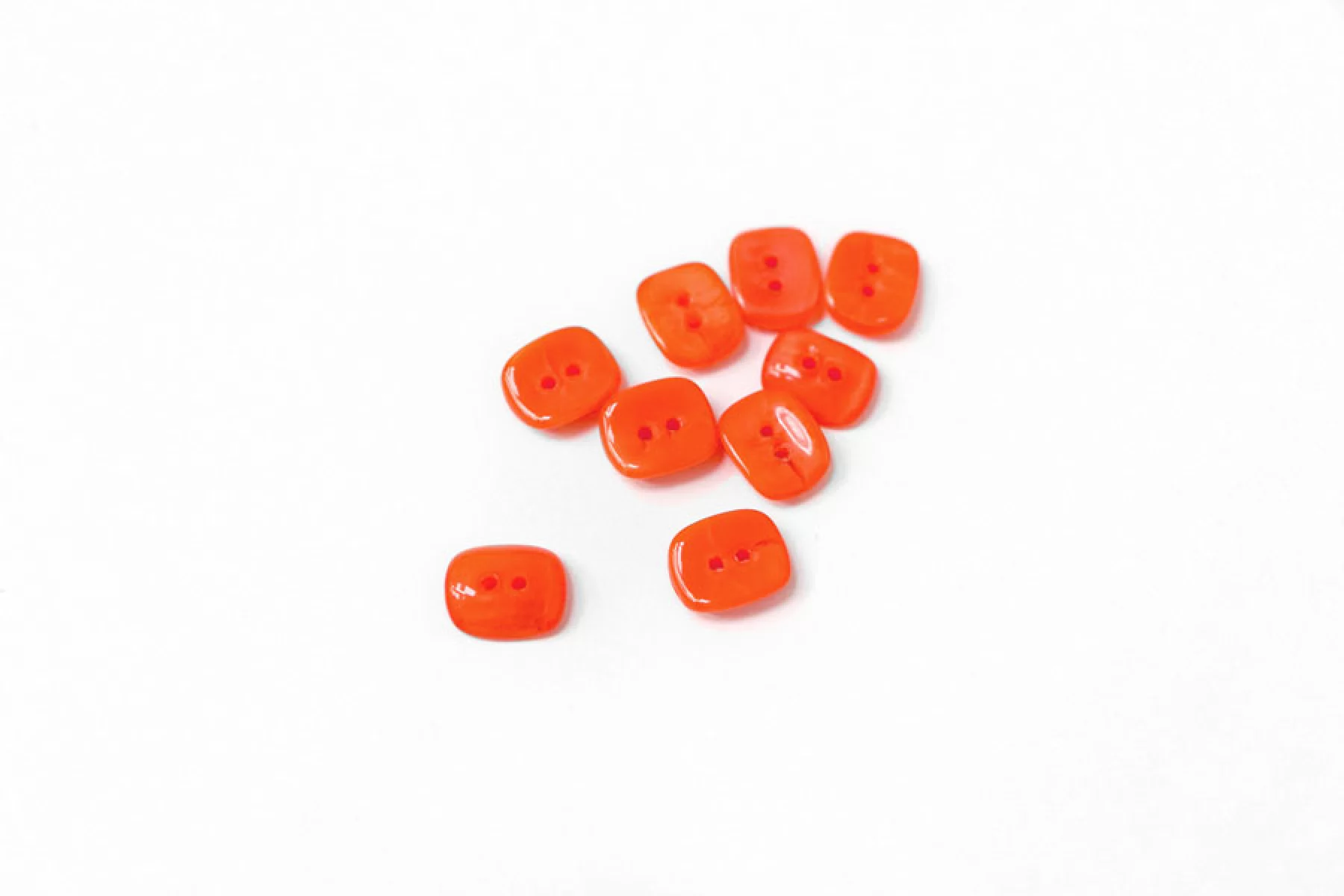 Пуговица из перламутра, кораллово-оранжевого оттенка прямоугольной формы с закругленными угламы, размер 11 мм, 2 прокола. Пуговицы из натурального перламутра, хрупкие, скалываются при падении с высоты или при сильном сжатии.