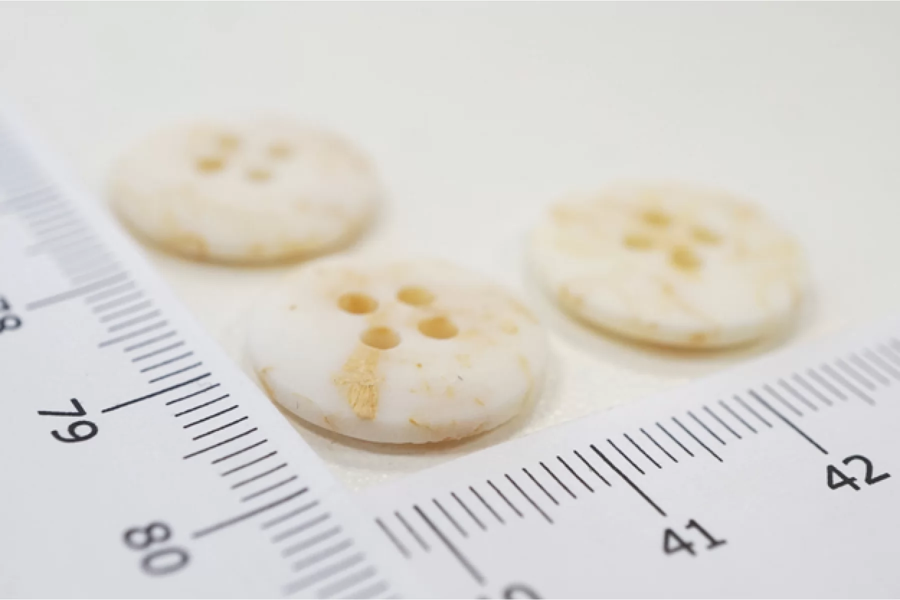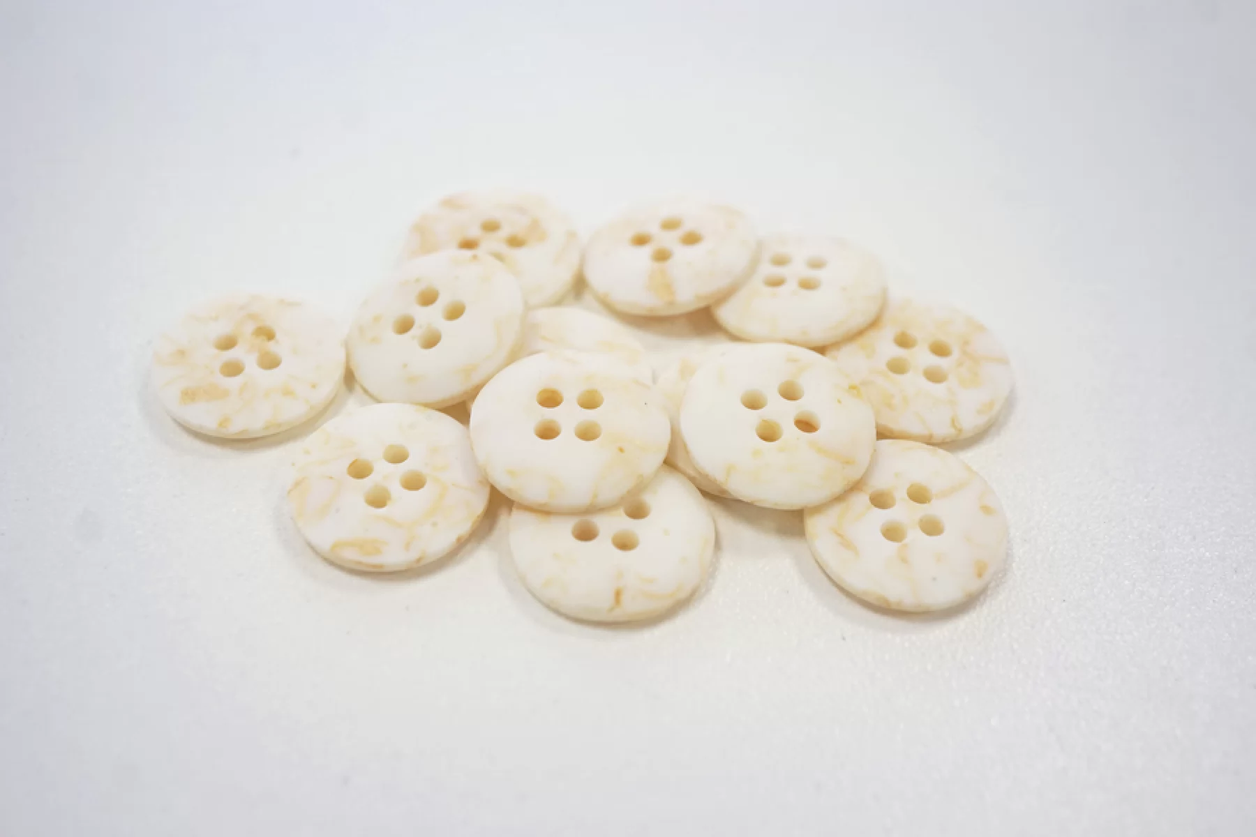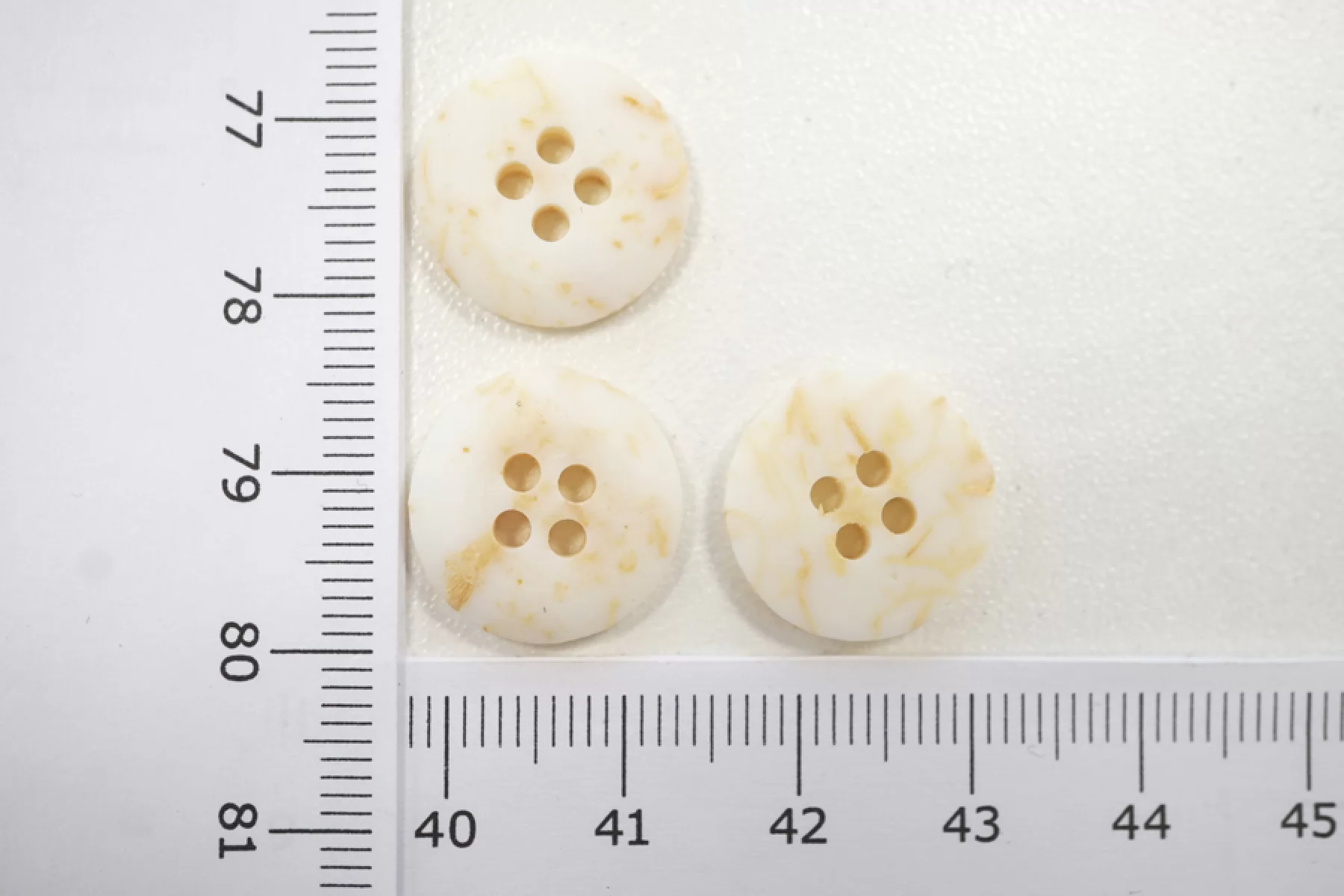 Пуговица костюмно-плательная пластиковая, размер 15 мм, белого цвета, с оранжевато-бежевыми вкраплениями древесной стружки.