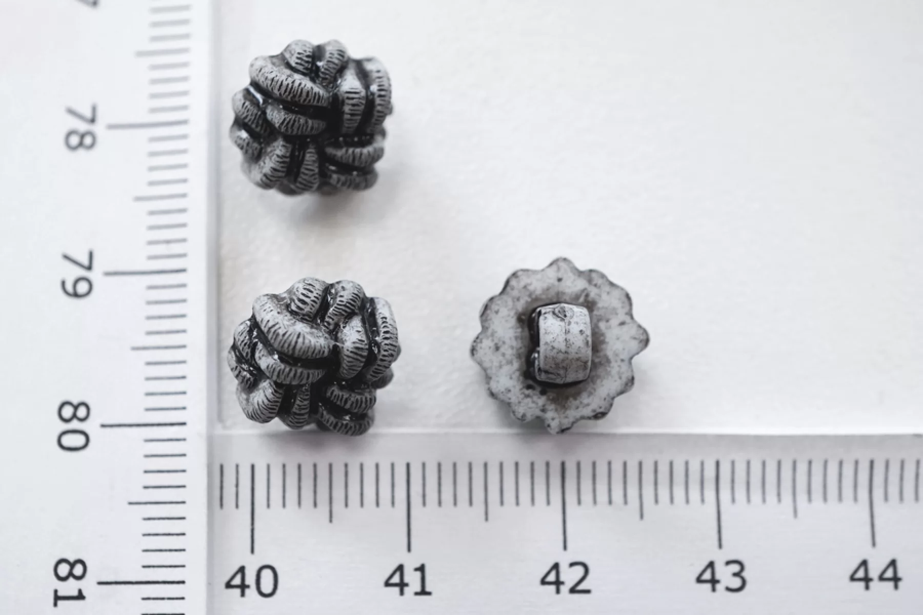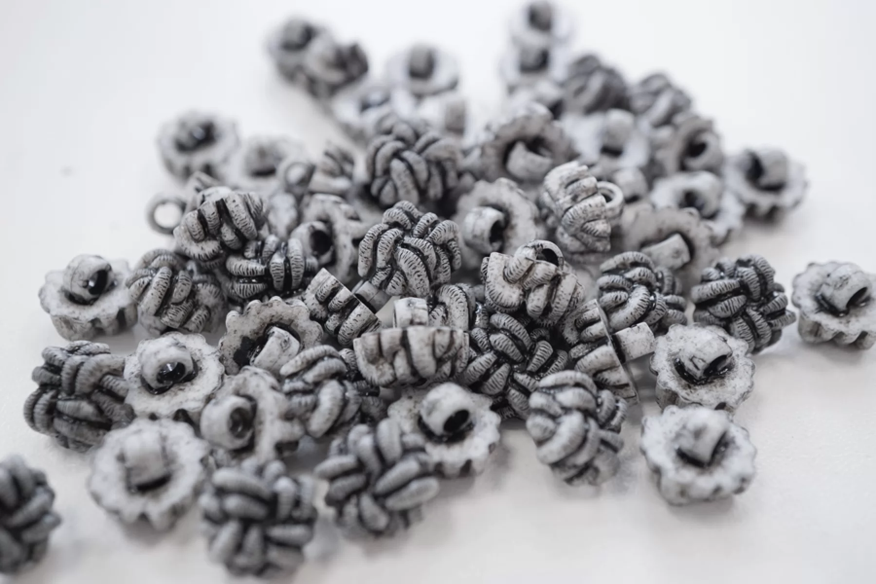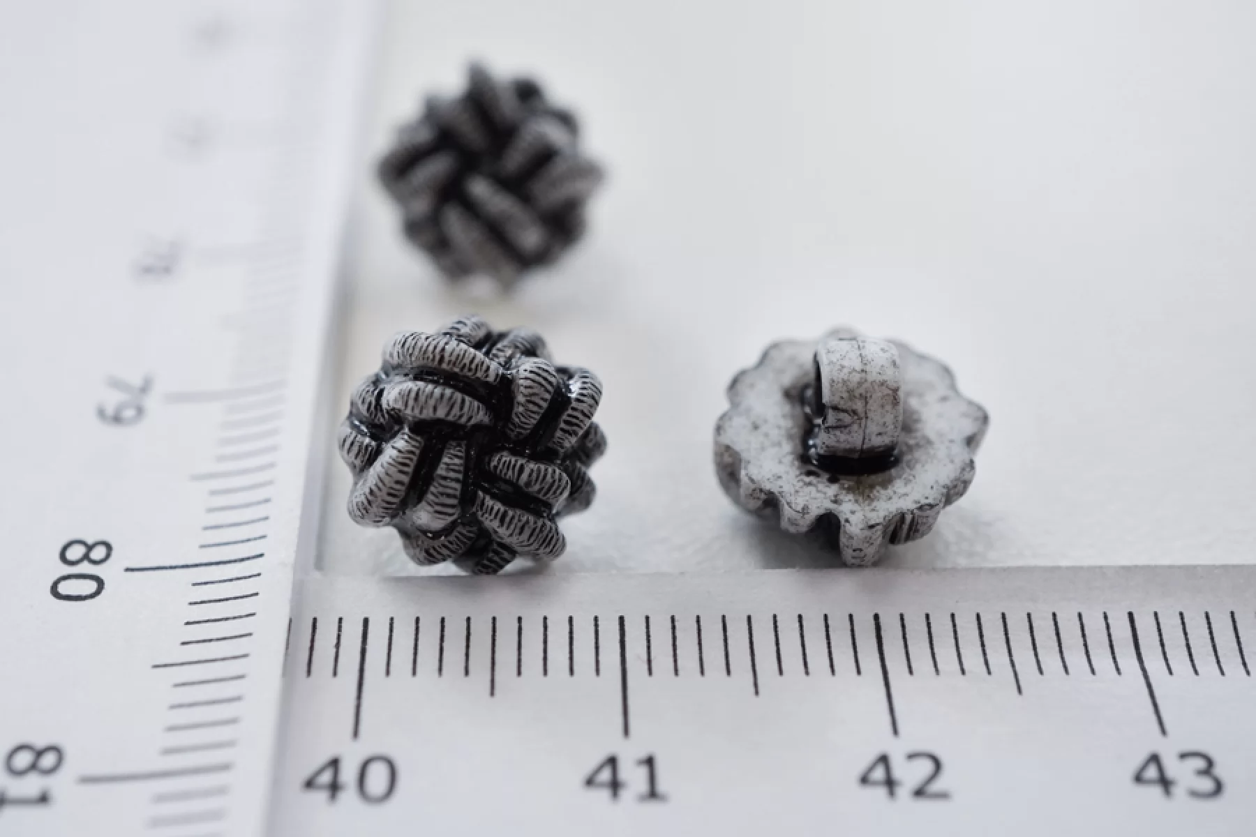 Пуговица на ножке плательно-рубашечная из пластмассы, размер 10 мм, серого цвета в виде декоративного узелка.
