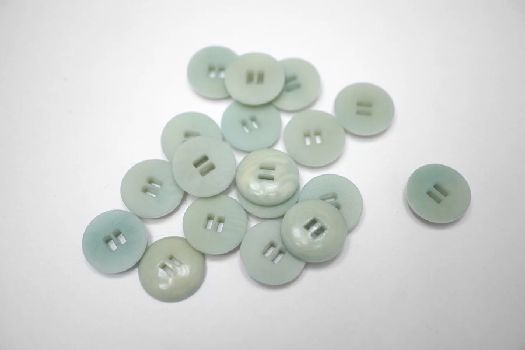Пуговица плательно-рубашечная пластиковая, матовая, под рог, размер 15 мм, цвета холодной мяты с бледно-желтоватым переливом, с волнообразным узором.