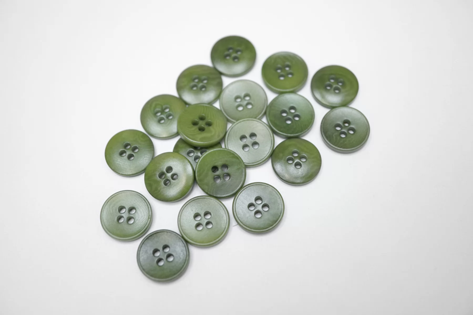 Пуговица плательно-рубашечная пластиковая, глянцевая, под рог, размер 15 мм, травянисто зеленого цвета.