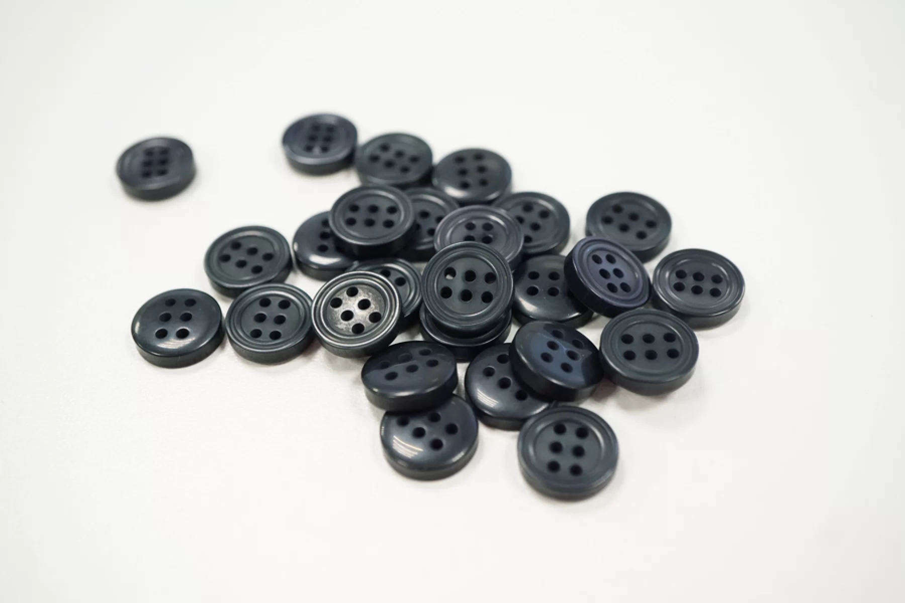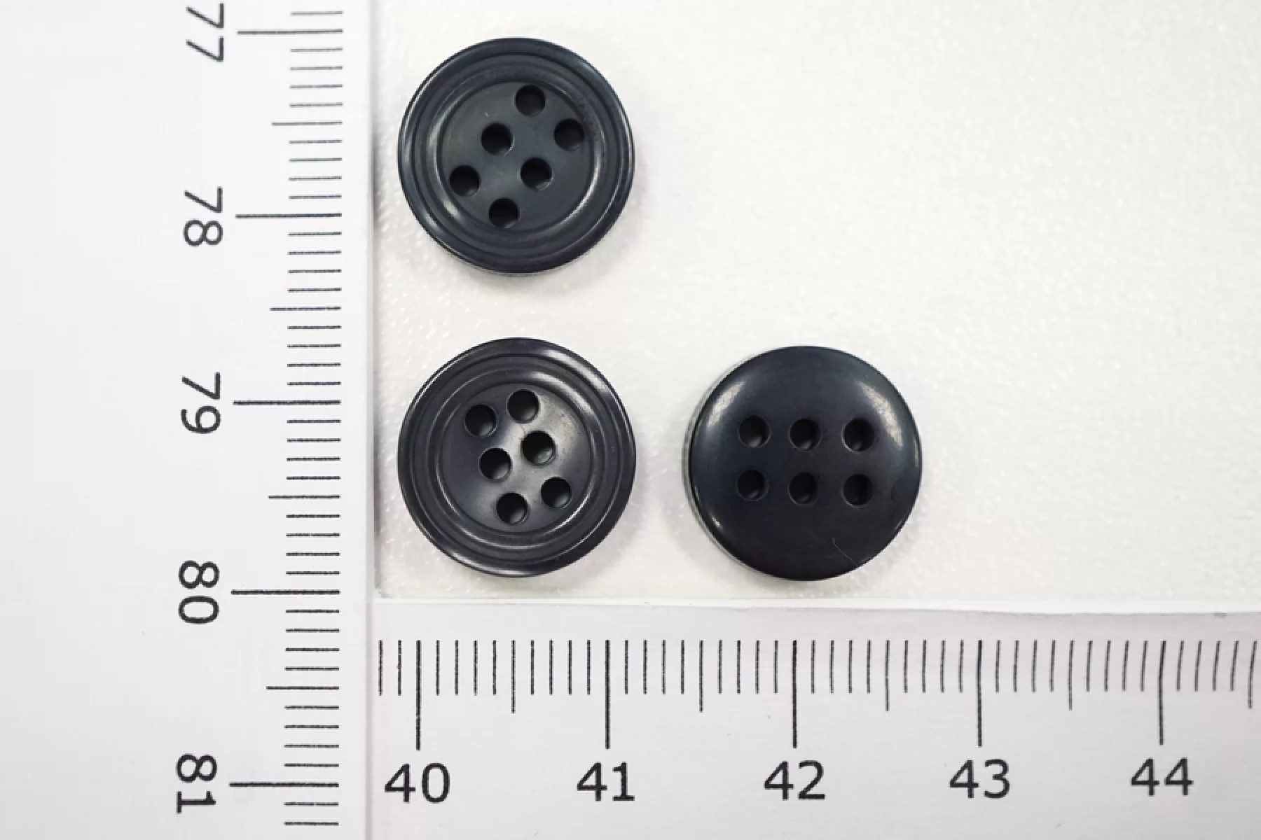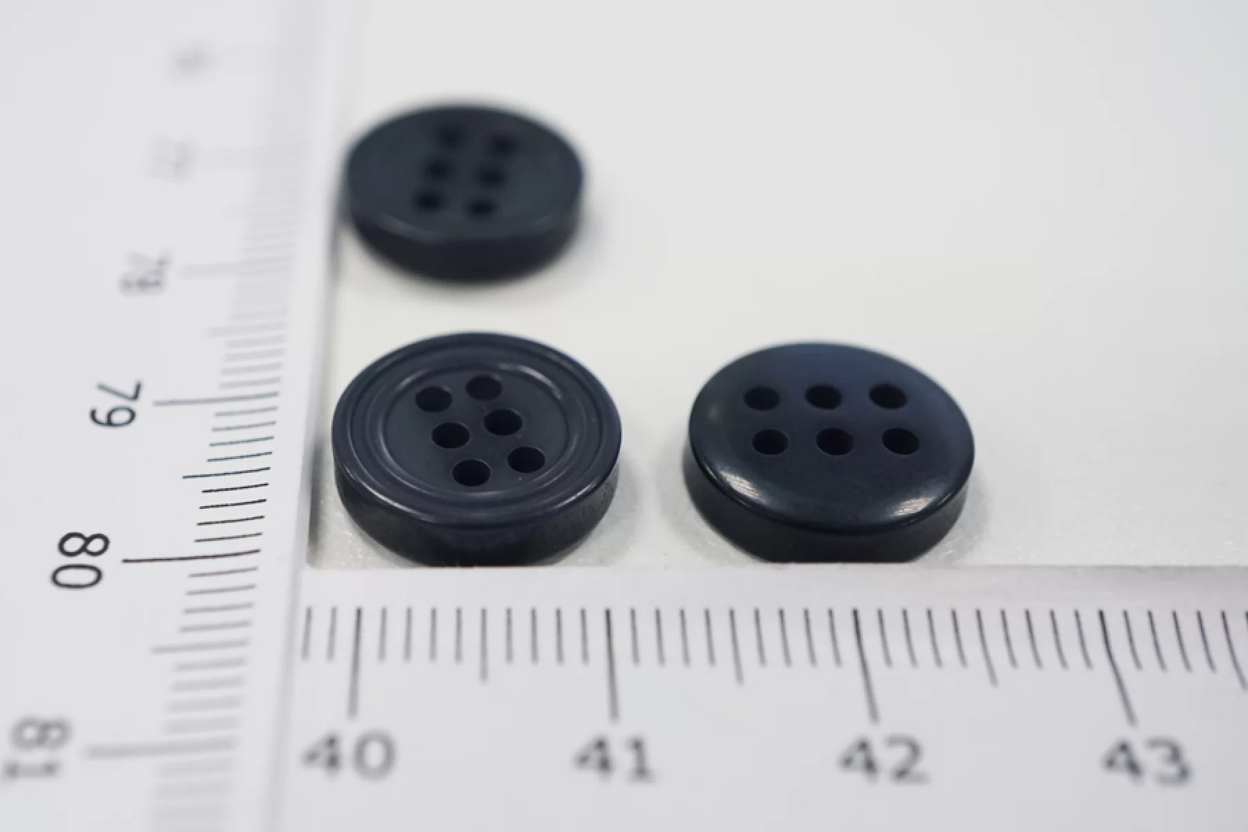 Пуговица плательно-рубашечная из пластмассы, размер 12 мм, черного цвета (с легким синевато-серым подтоном) под перламутр. В пуговице проделано 6 отверстий.