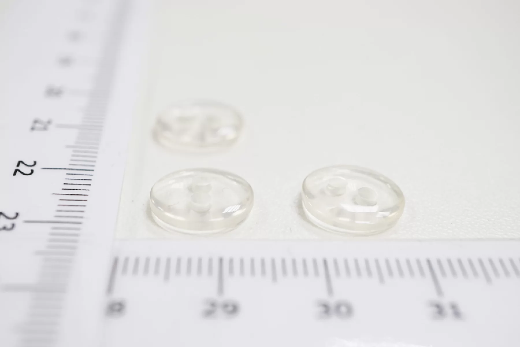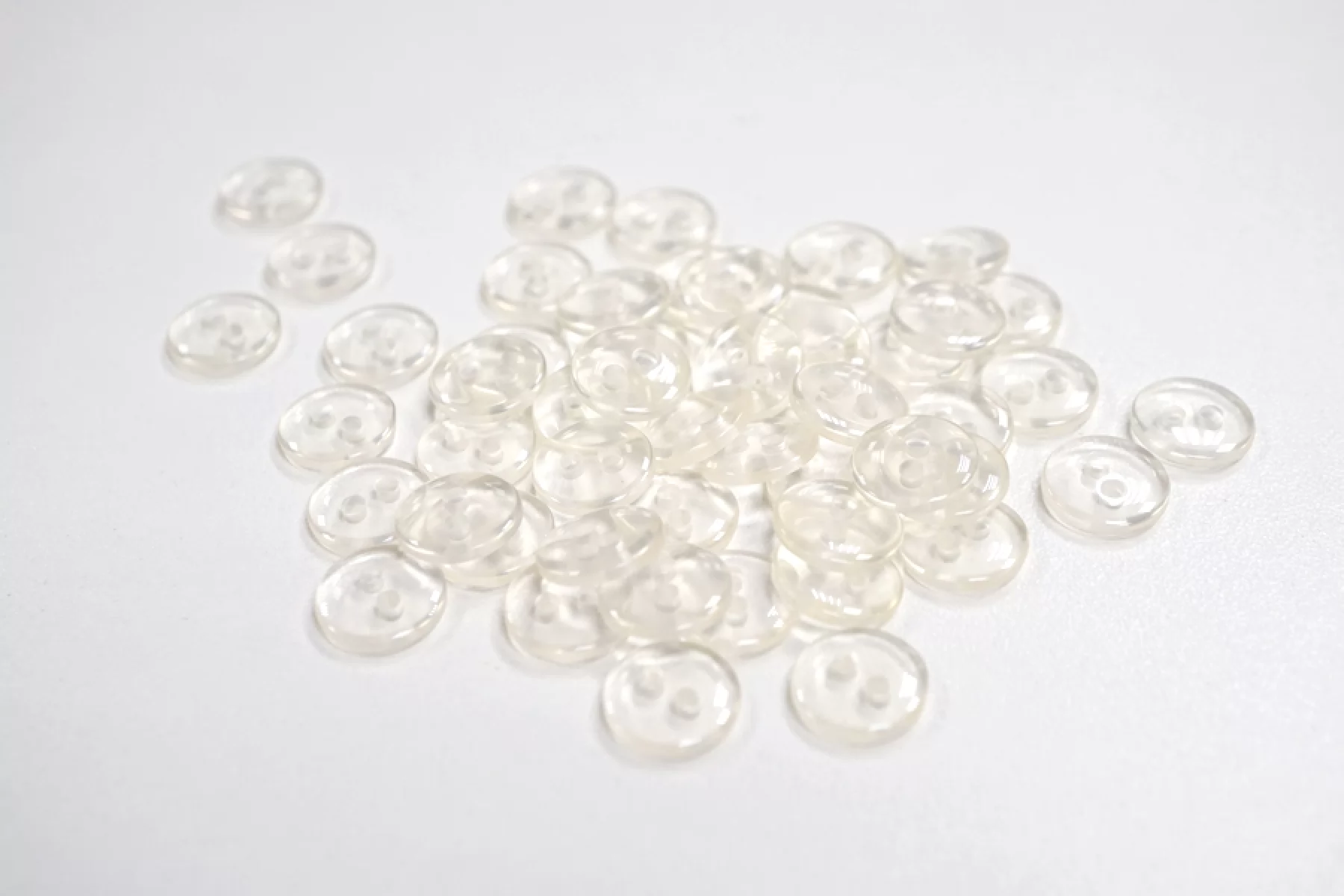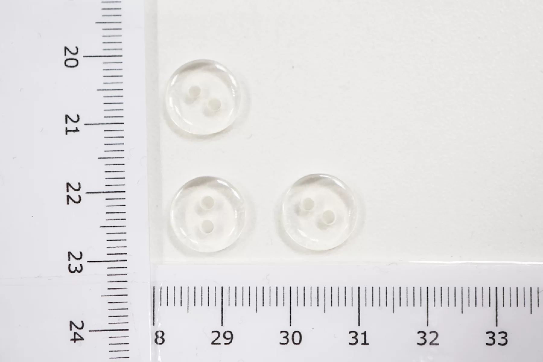 Пуговица плательно-рубашечная из пластмассы, размер 11 мм, прозрачная.