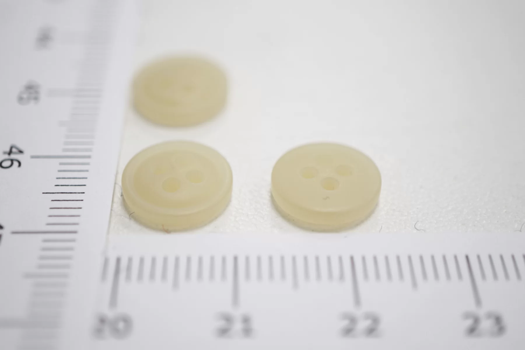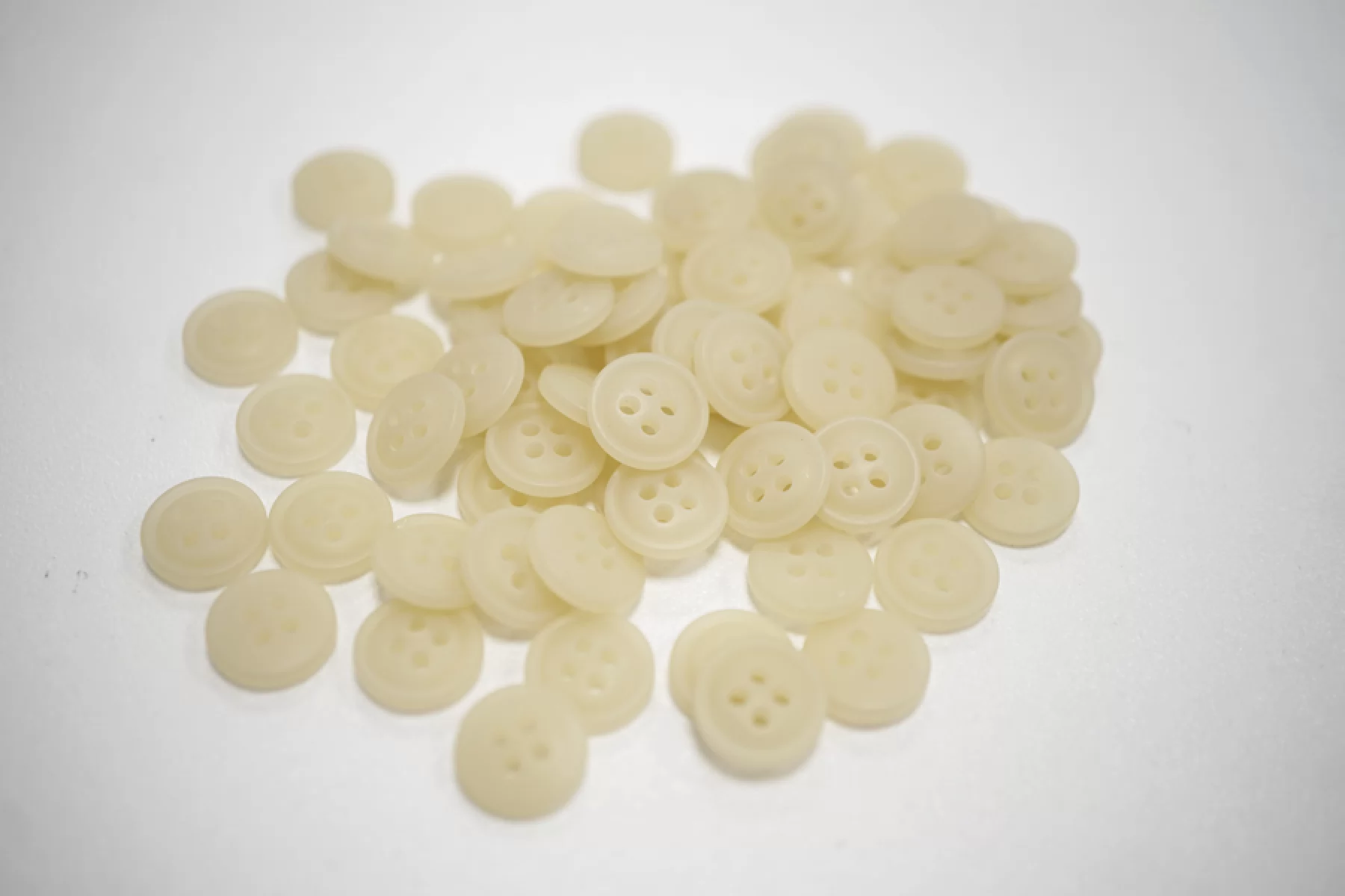 Пуговица плательно-рубашечная из пластмассы, размер 11 мм, молочного цвета.