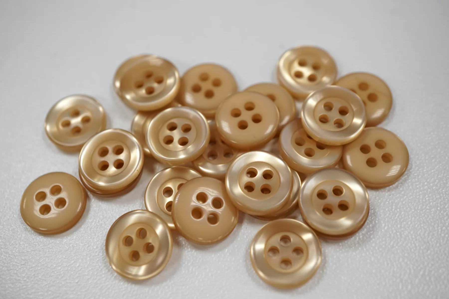 Пуговица плательно-рубашечная из пластмассы, размер 11 мм, светло-бежевого цвета под перламутр.