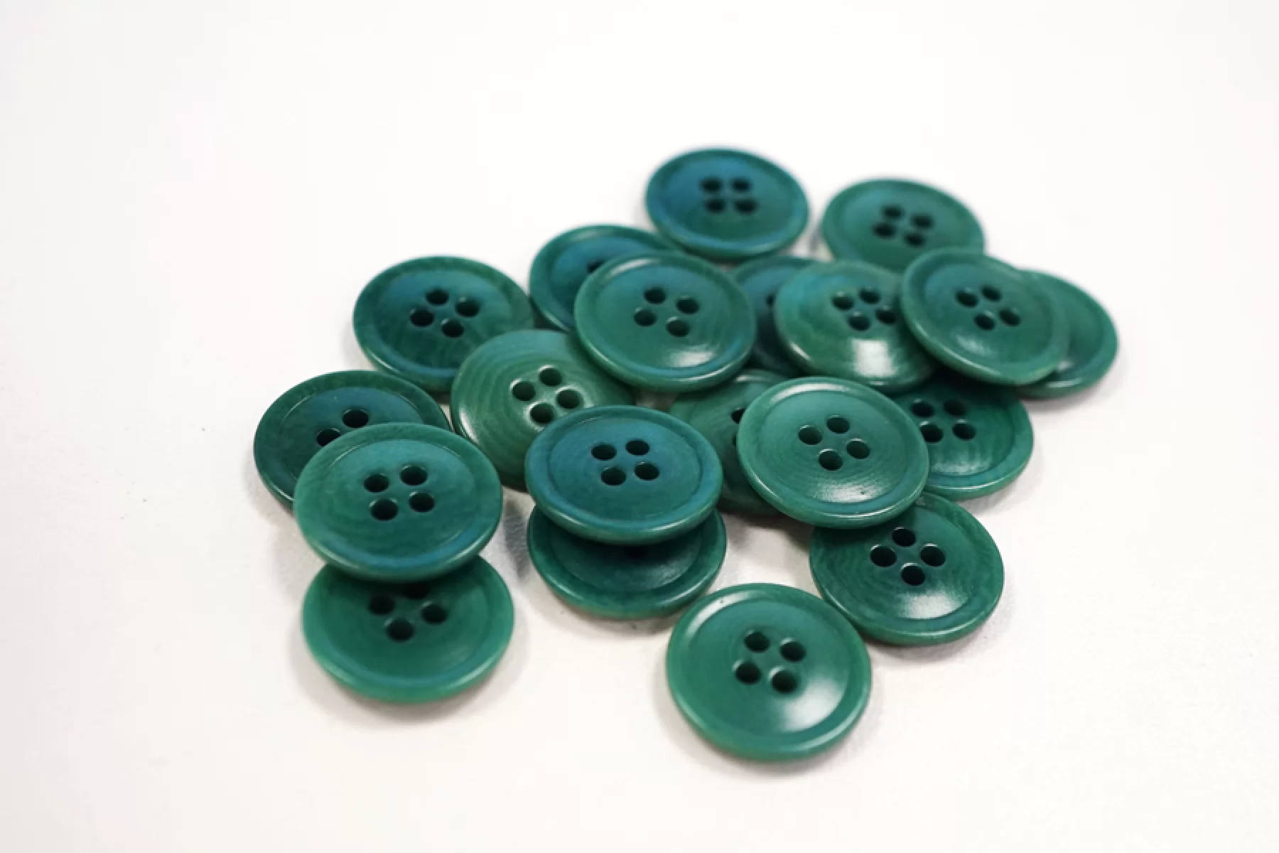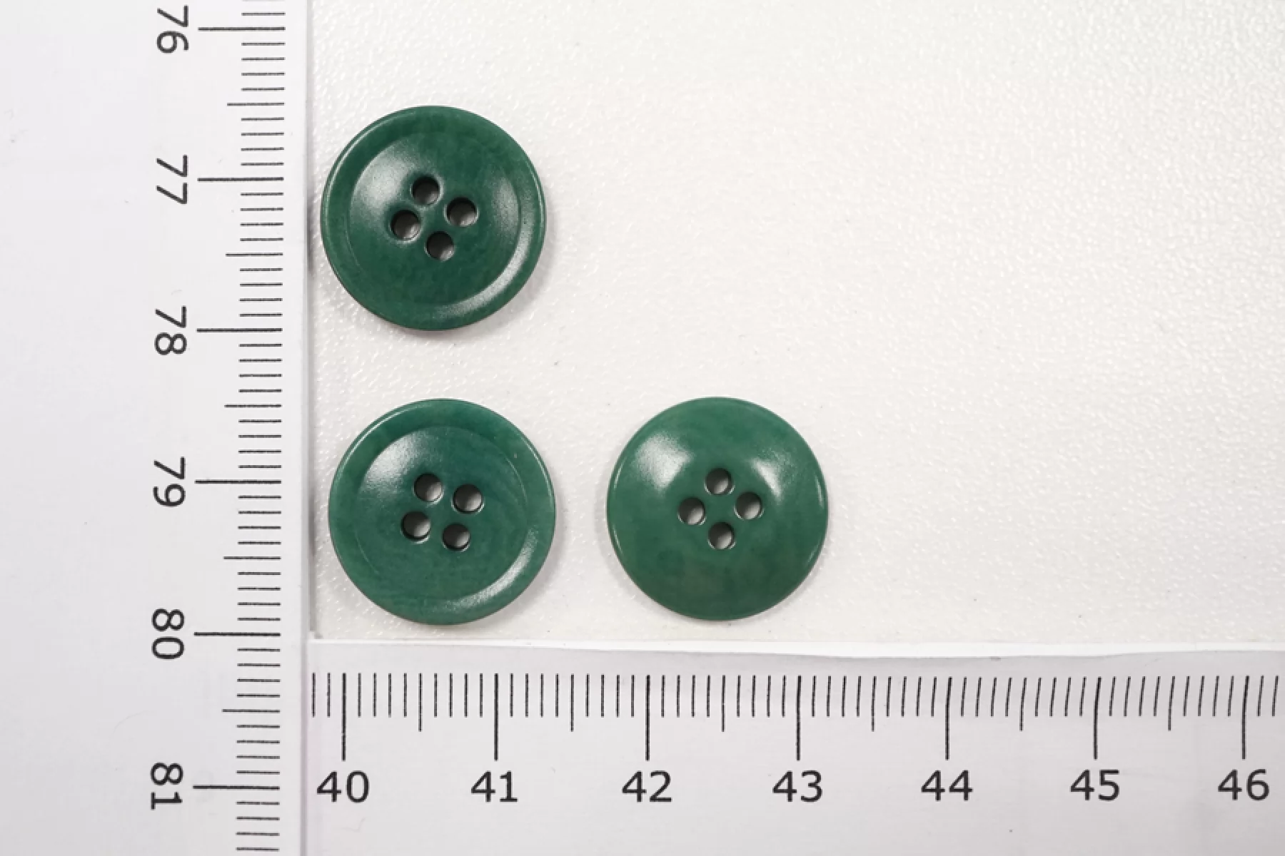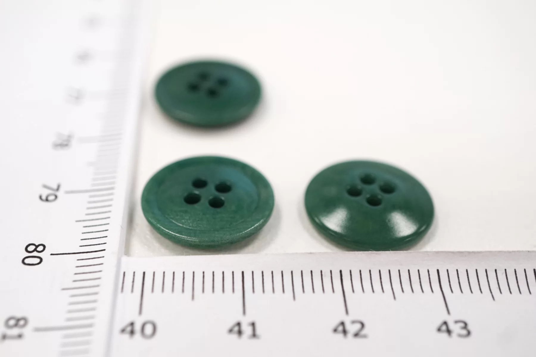 Пуговица плательно-рубашечная из пластмассы, размер 14 мм, темно-зеленого цвета.