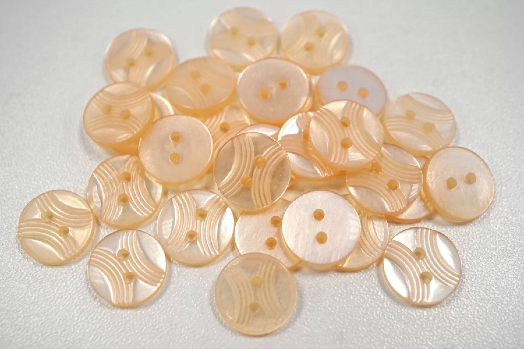 Пуговица плательно-рубашечная из пластмассы, размер 13 мм, в бледном персиковом цвете, полупрозрачная, под перламутр. На пуговице есть декоративный объёмный узор.