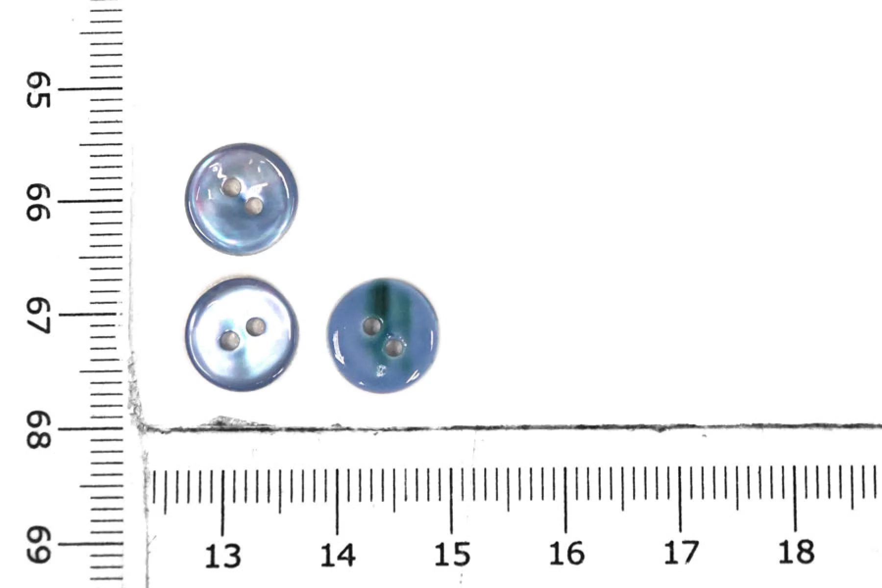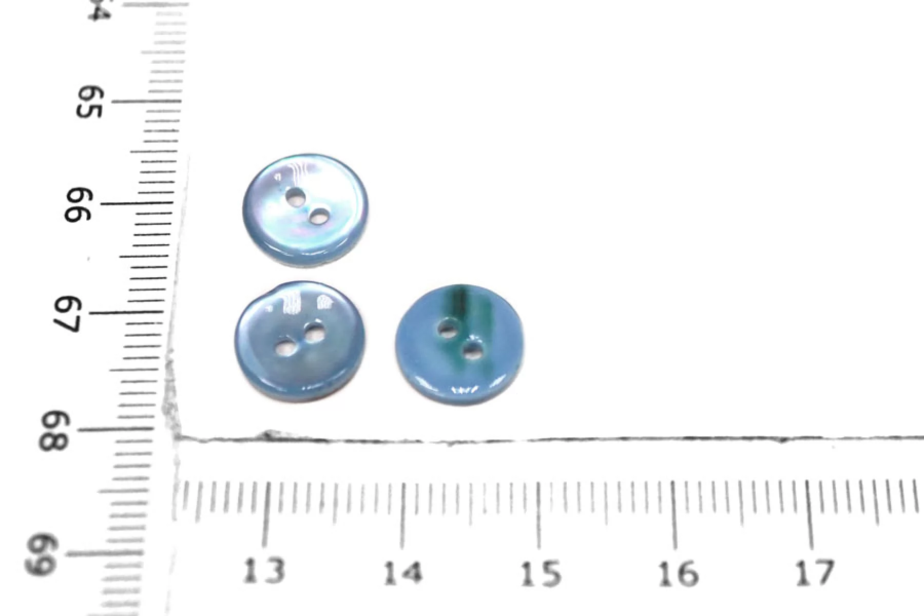 Пуговица из перламутра, голубого цвета с зеленоватыми переливами с обратной стороны, размер 10 мм. Пуговицы из натурального перламутра, хрупкие, скалываются при падении с высоты или при сильном сжатии.