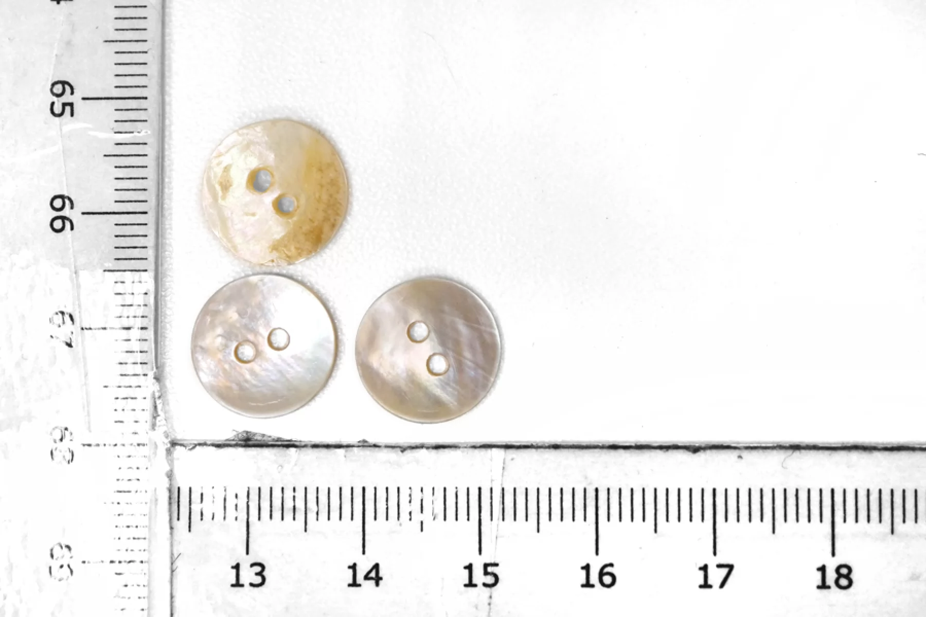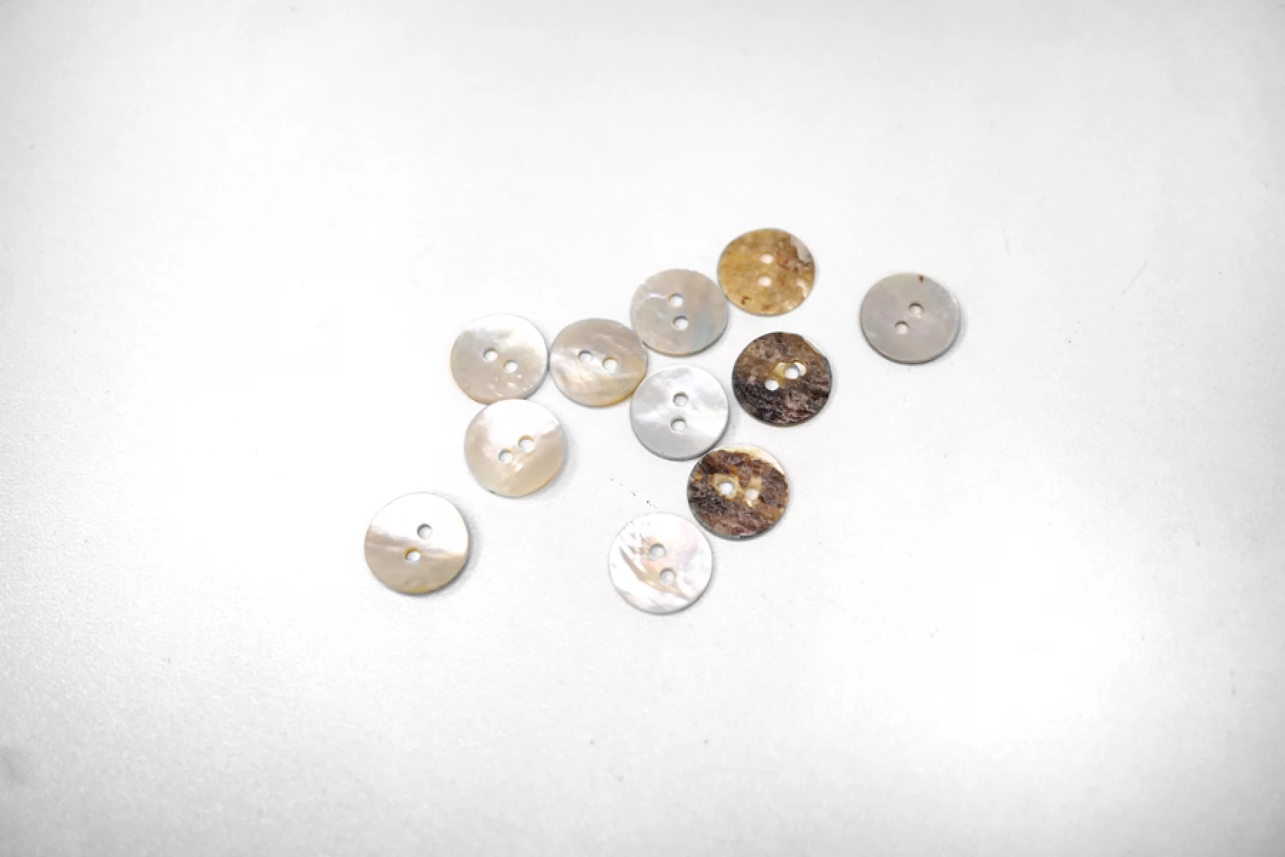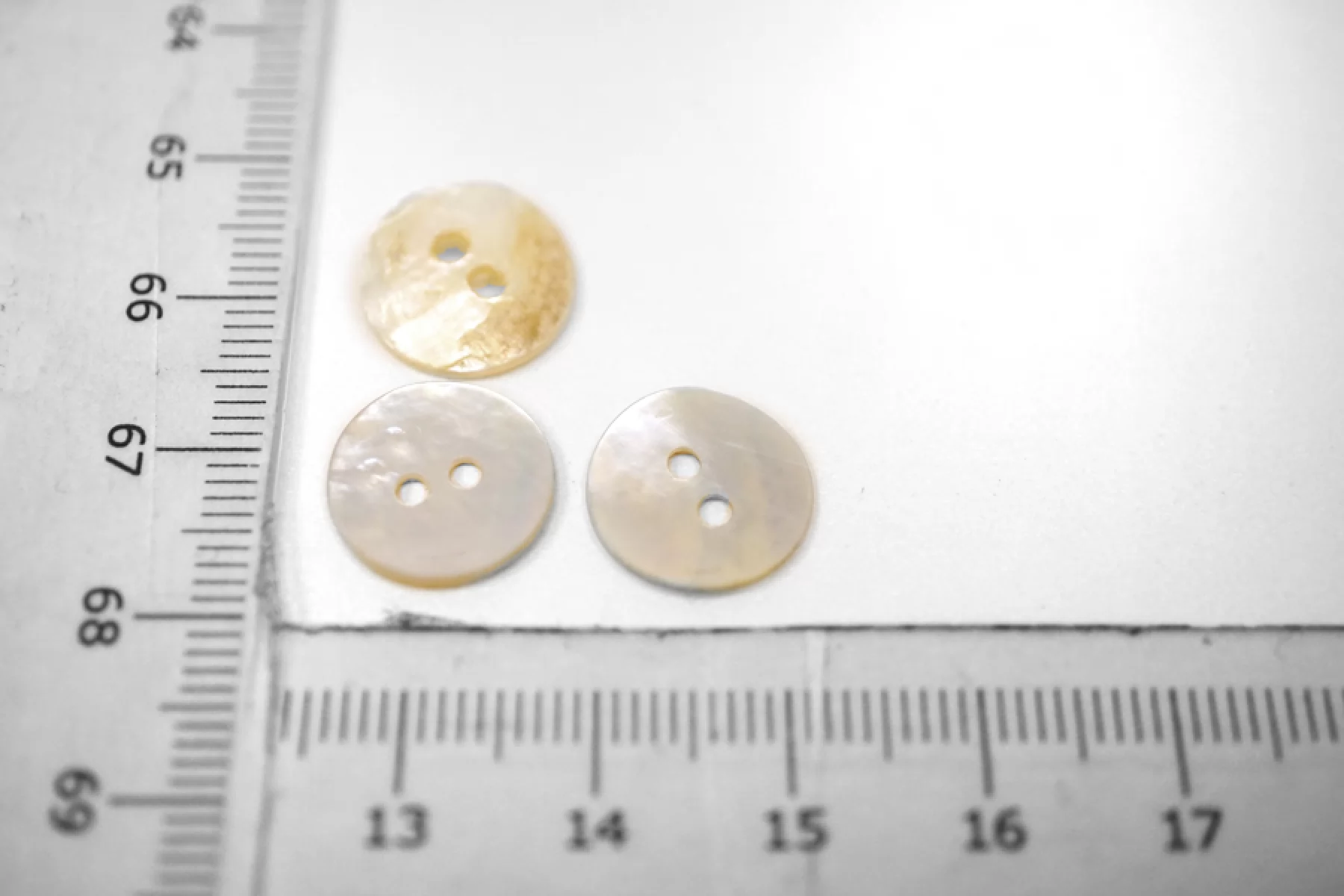 Пуговица из перламутра коричневого цвета, размер 13 мм. Пуговицы из натурального перламутра, хрупкие, скалываются при падении с высоты или при сильном сжатии.