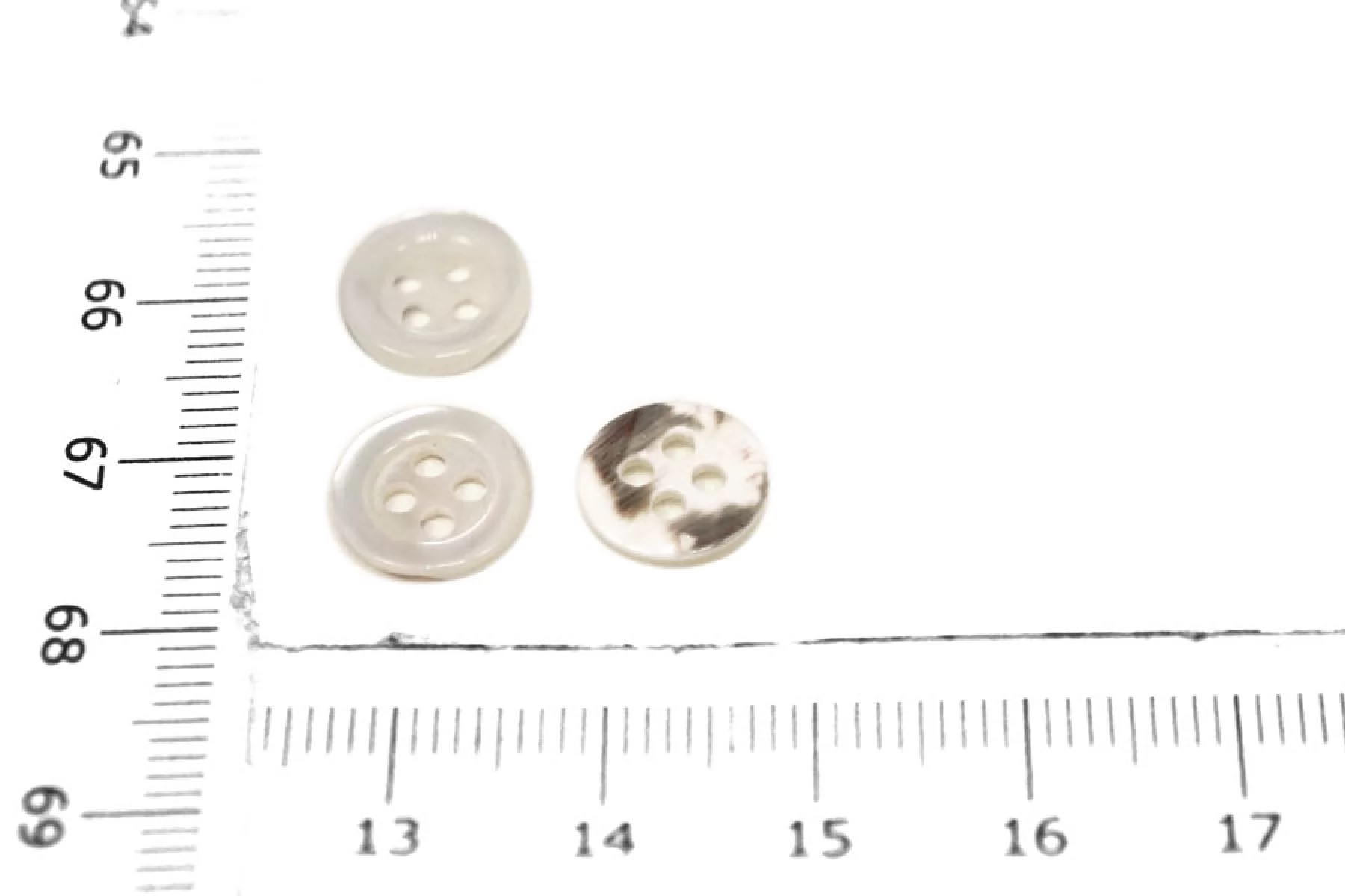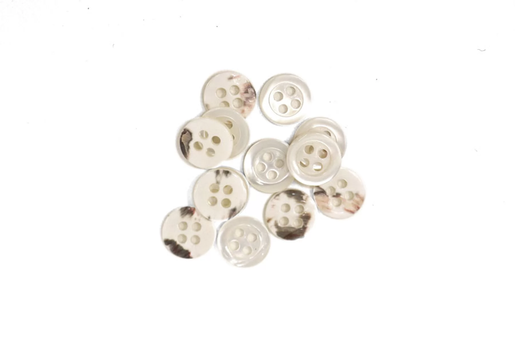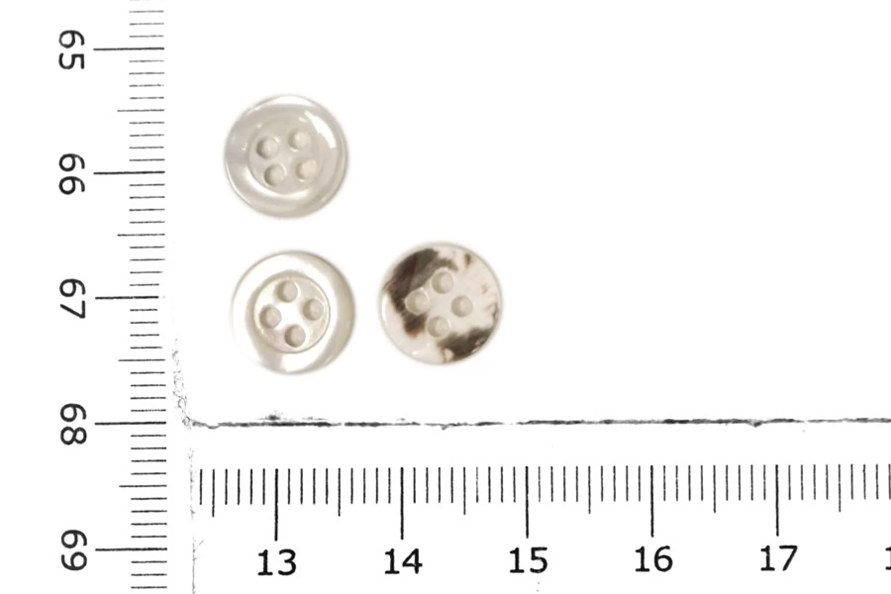 Пуговица из перламутра, молочного цвета с коричневыми вкраплениями с обратной стороны, размер 10 мм. Пуговицы из натурального перламутра, хрупкие, скалываются при падении с высоты или при сильном сжатии.