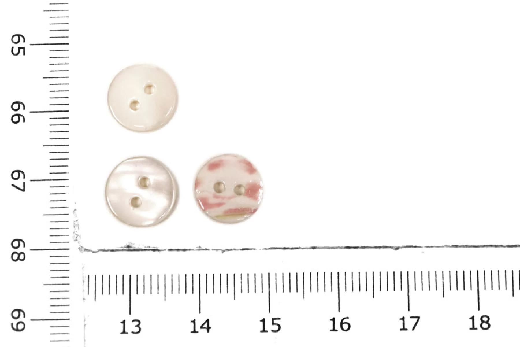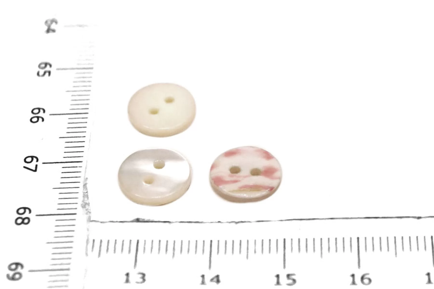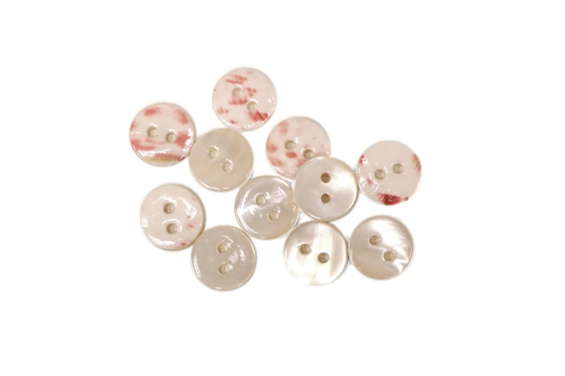 Пуговица из перламутра, молочного цвета с розовыми вкраплениями с обратной стороны, размер 10 мм. Пуговицы из натурального перламутра, хрупкие, скалываются при падении с высоты или при сильном сжатии.