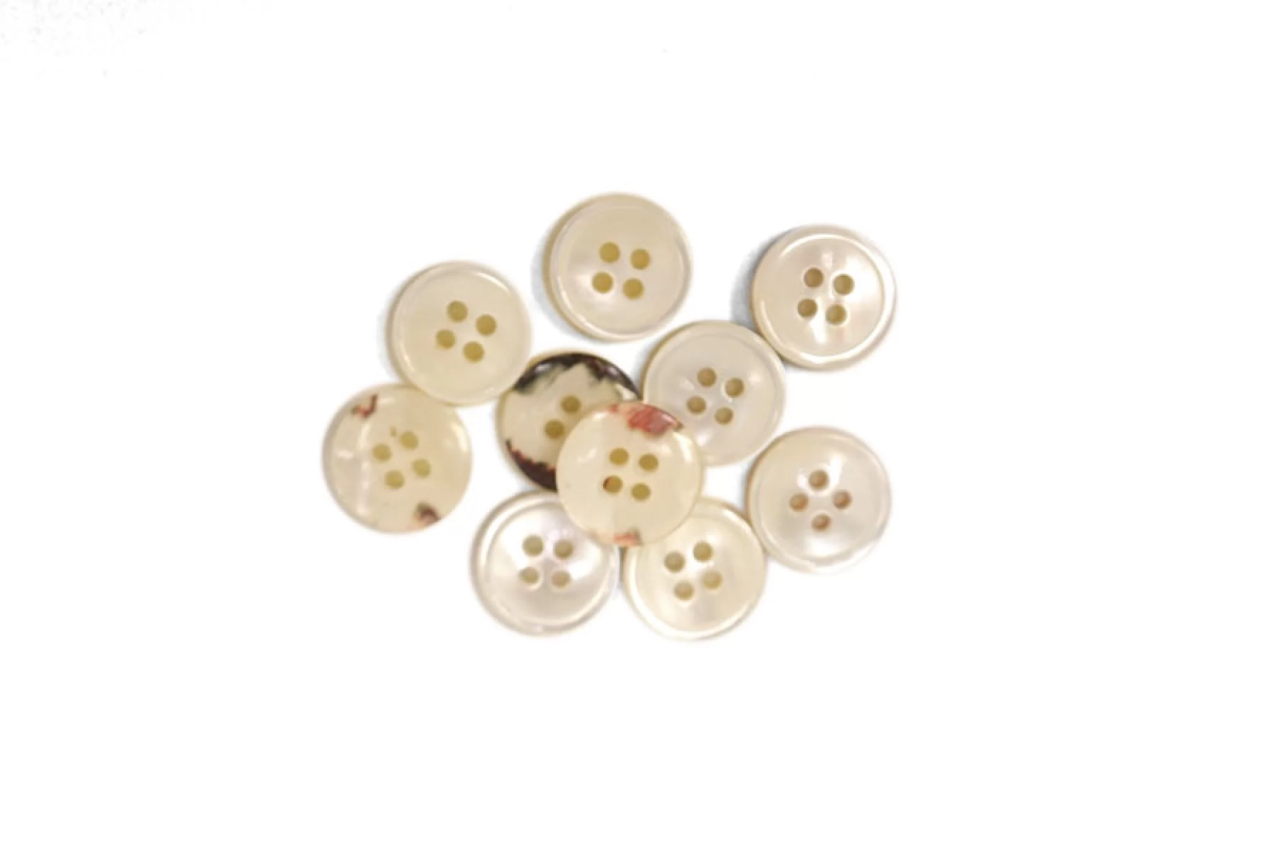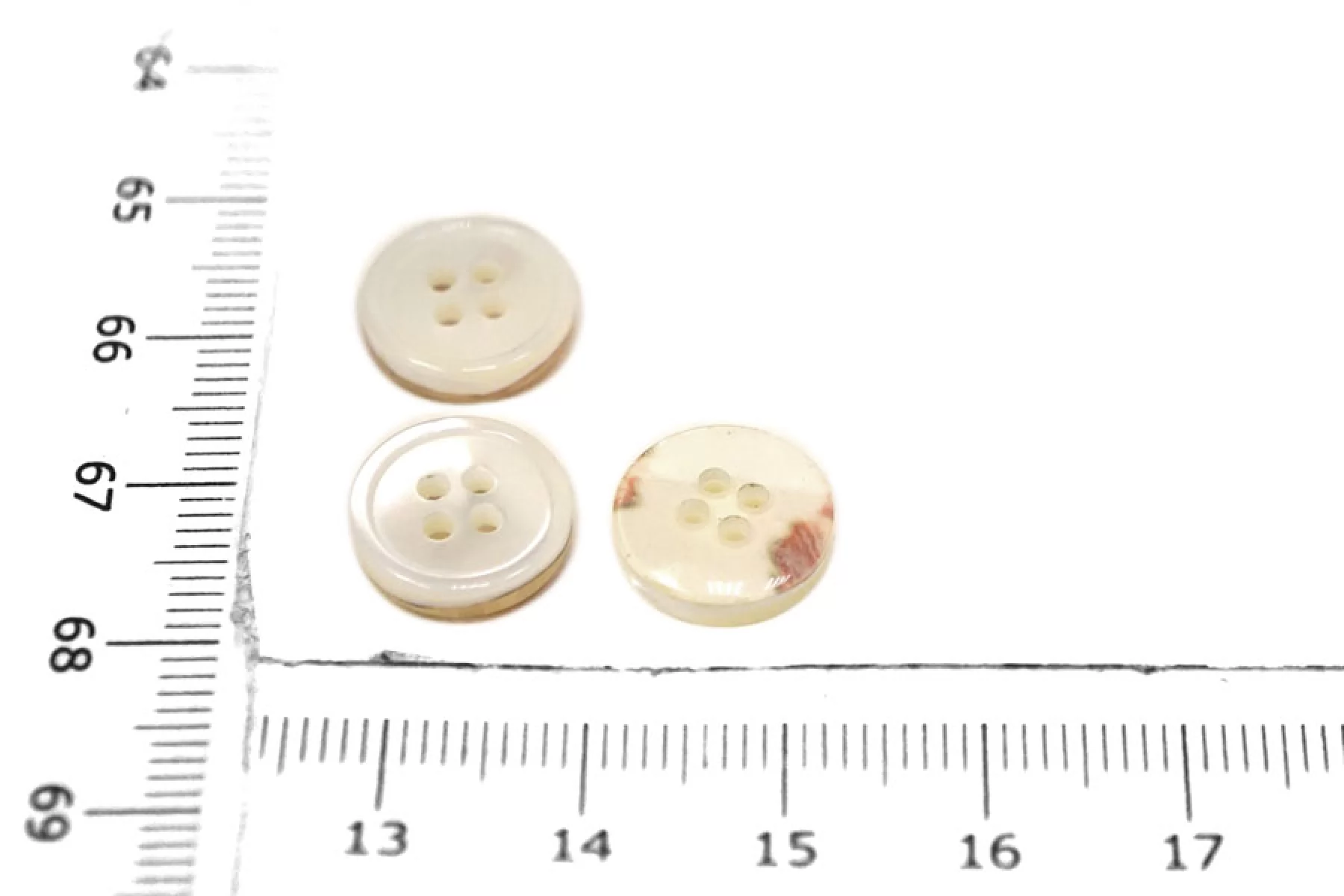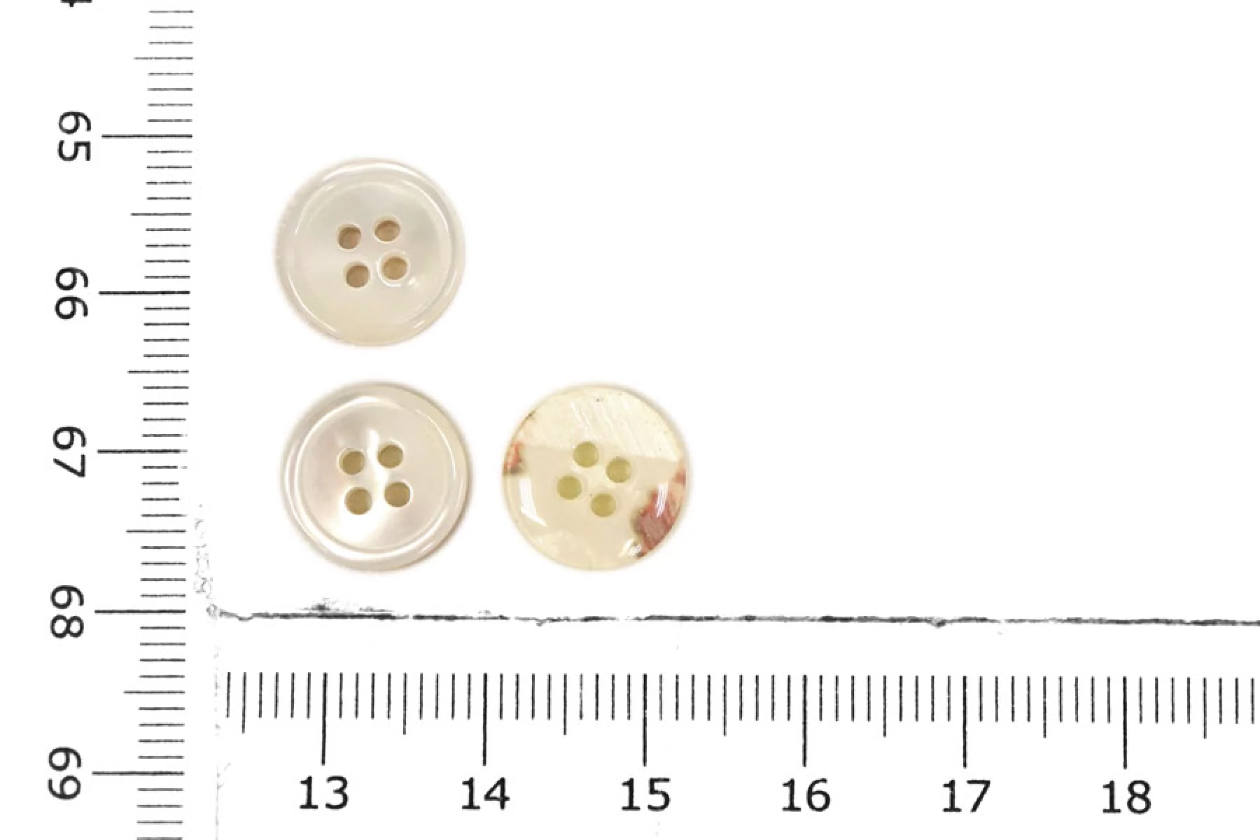 Пуговица из перламутра, молочного цвета с розовыми вкрапления с обратной стороны, размер 12 мм. Пуговицы из натурального перламутра, хрупкие, скалываются при падении с высоты или при сильном сжатии.